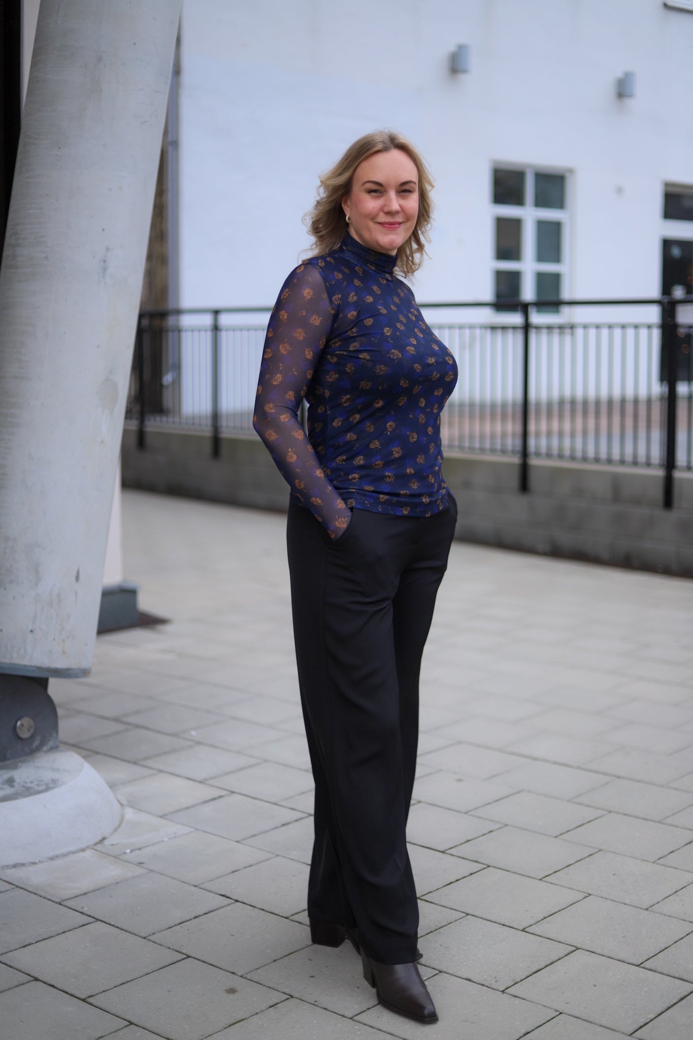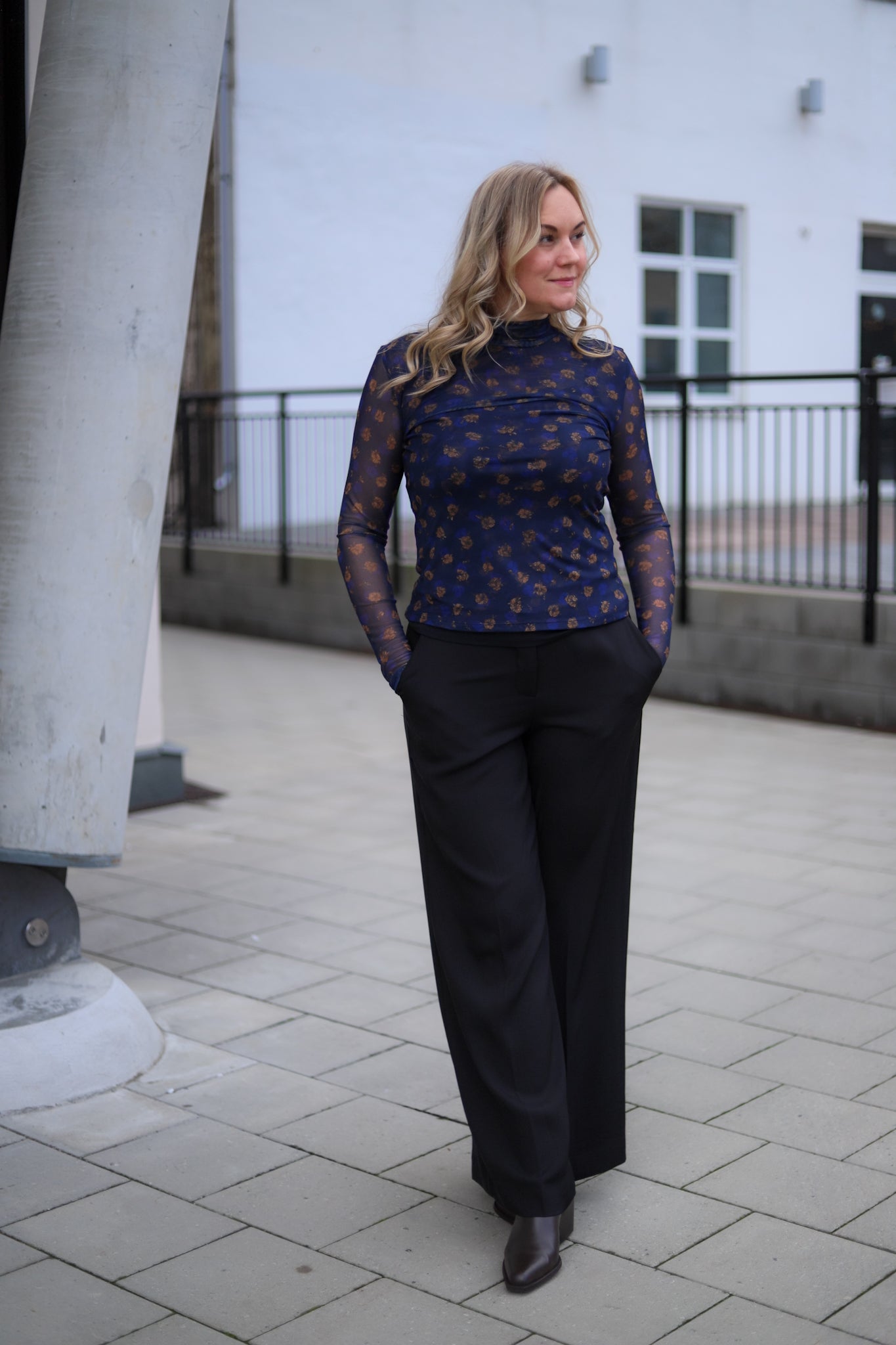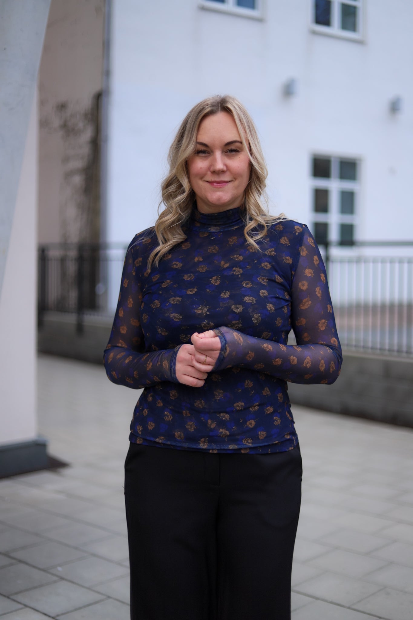 Stilig meshtopp i mørk blå med blomsterprint fra MSCH Copenhagen. Modellen er tettsittende med høy hals og lange smale ermer. Bruk den under en blazer for et sofistikert antrekk, eller style den alene med jeans for et mer feminint antrekk.