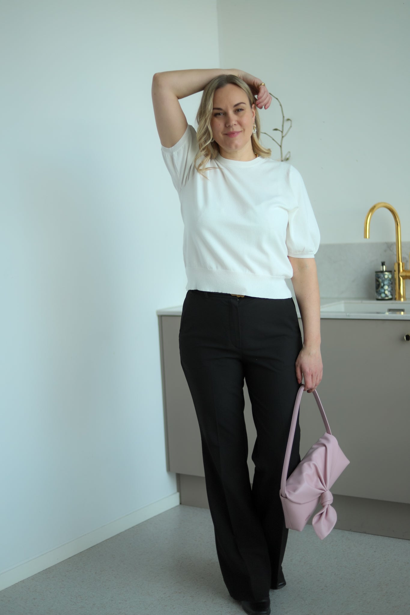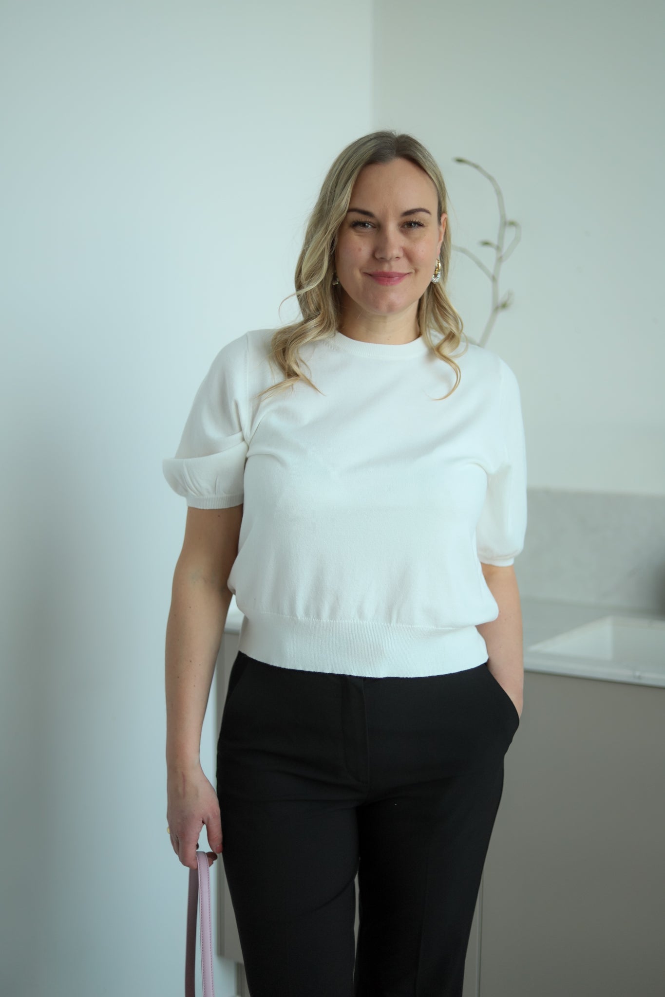 Kortermet strikkegenser i off-white fra MSCH Copenhagen. Modellen er rett med rund hals, og pen hoftelenge. Ribbestrikk i hals, hem og mansjett. Stilren topp i lett og myk stoffkvalitet.