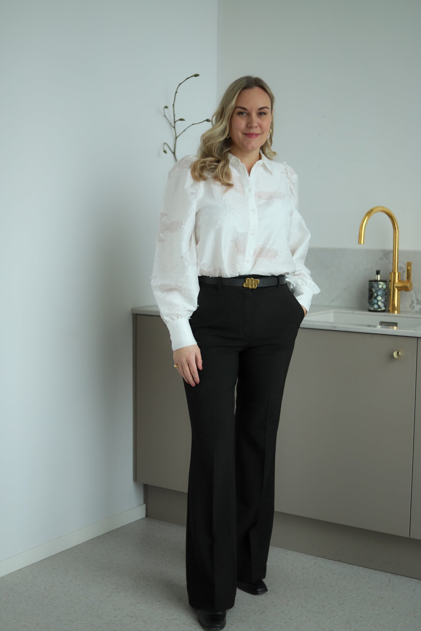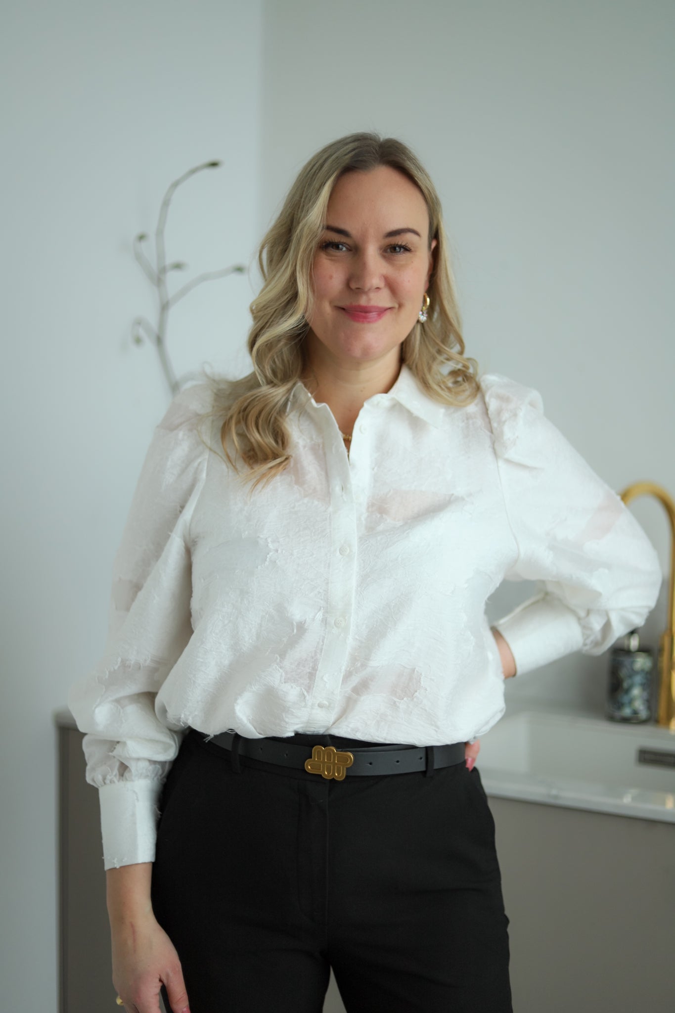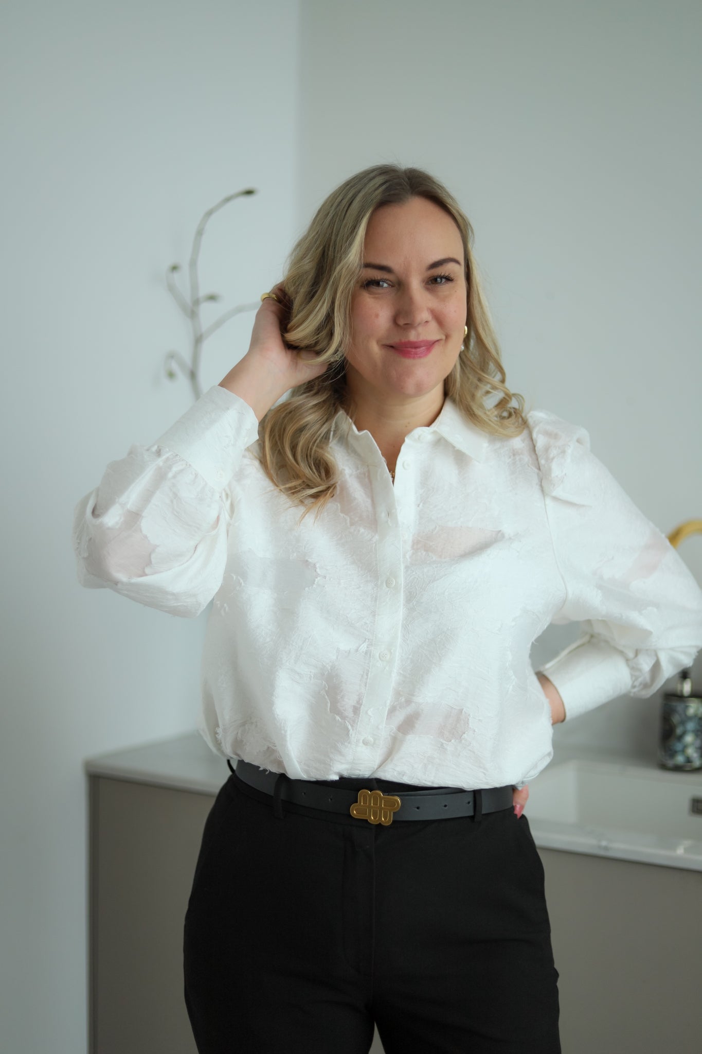 Lekker skjorte i off-white fra MSCH Copenhagen. Rett modell med klassisk skjortekrage og ton-i-ton knappestolpe. Lange ermer med puff i skuldre og knapper i mansjett. Skjorten har nett lengde og vakker strukturr. Perfekt til alle anledninger.