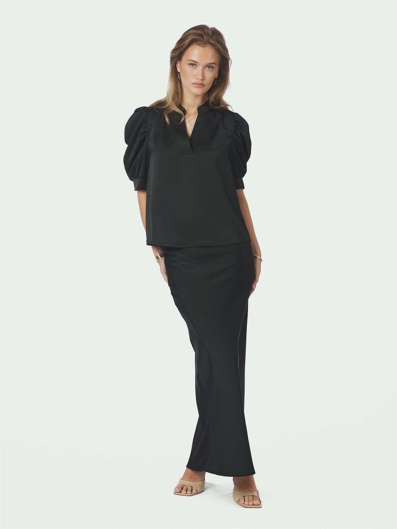 Elegant maxiskjørt i klassisk sort fra Neo Noir. Lekker blank satengkvalitet som faller flott. Feminin modell med høyt liv, a-fasong og full lengde. Lett og luftig passform som har behagelig strikk i livet. Et anvendelig skjørt som lett kan pyntes opp og ned!