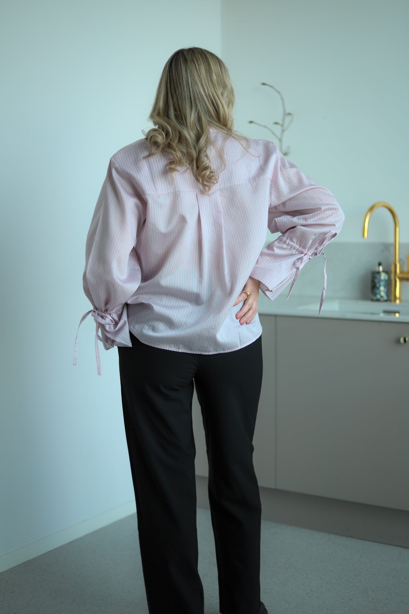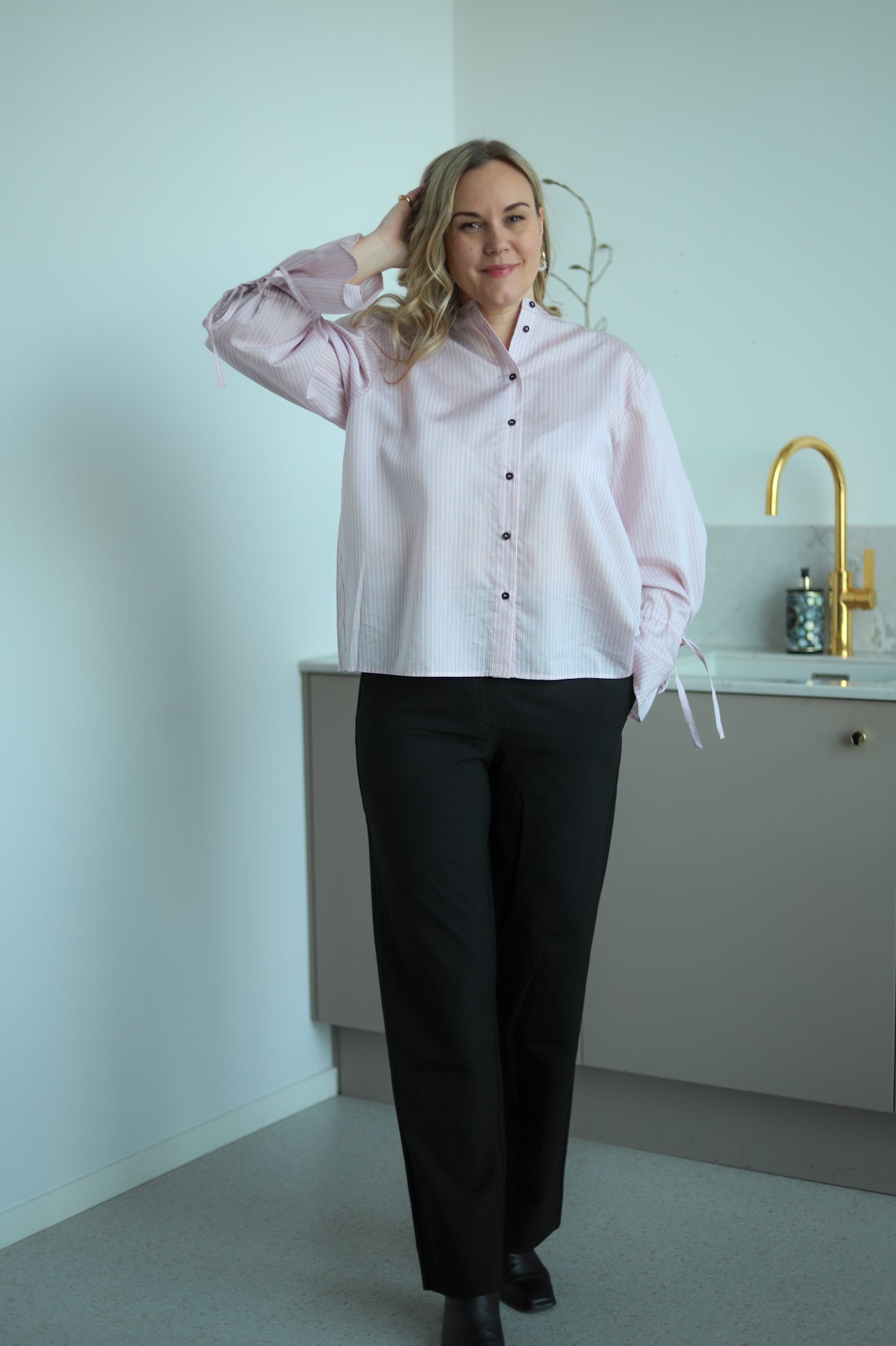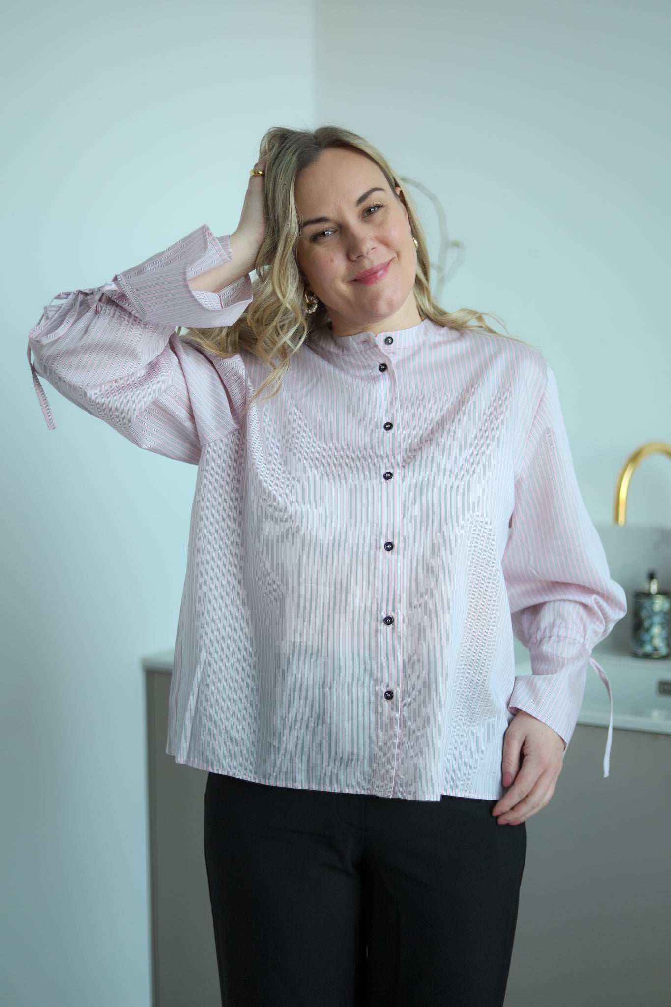 Nydelig skjorte med lys rosa striper fra Norr. Modellen er avslappet med rund krage, og brune små knapper i front. Lange ermer med lett droppede skuldre og knyting i mansjett. En moderne skjorte med lekkert snitt og stilige detaljer.