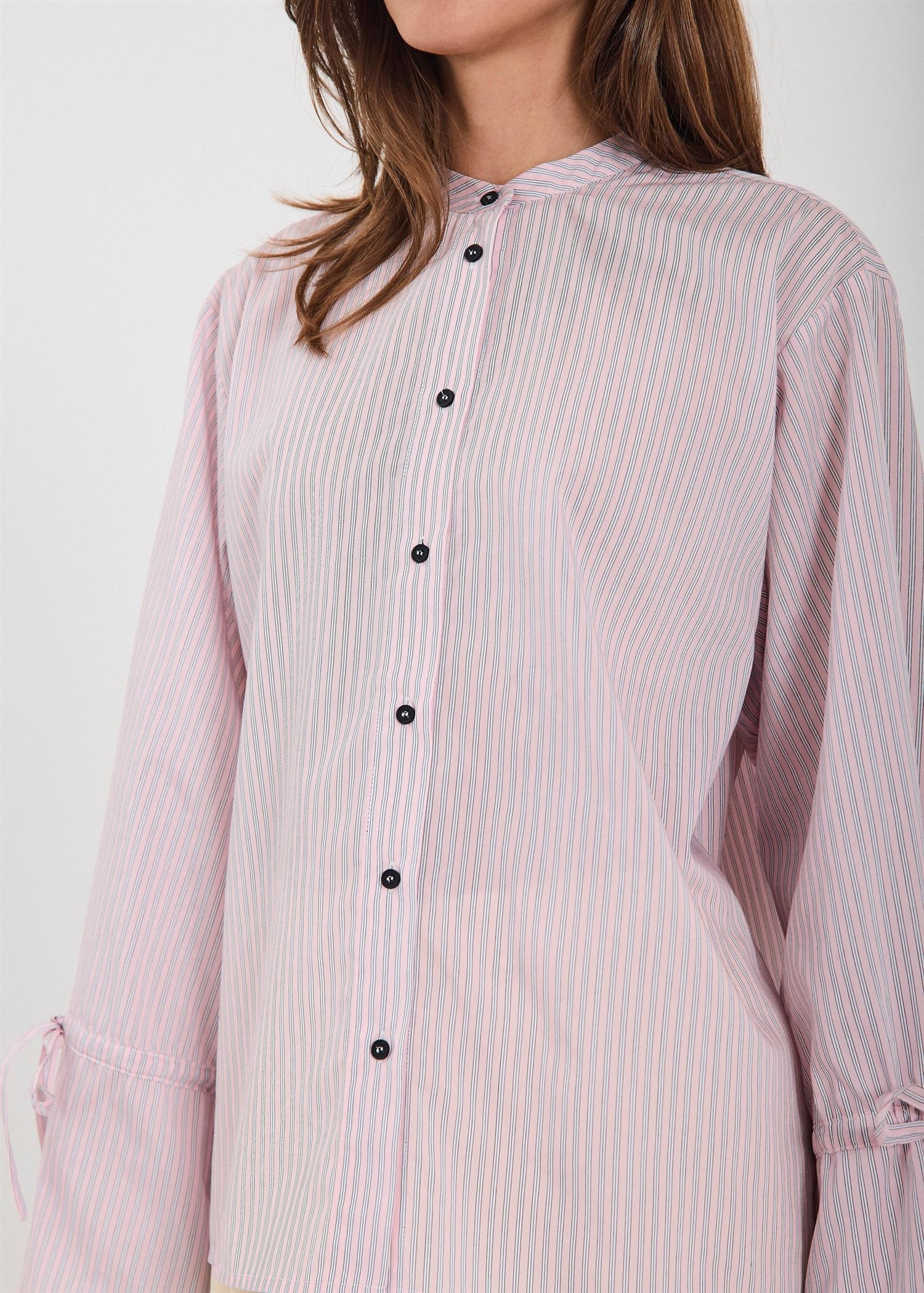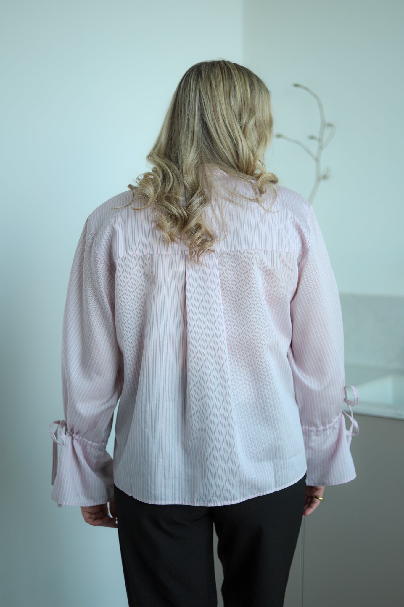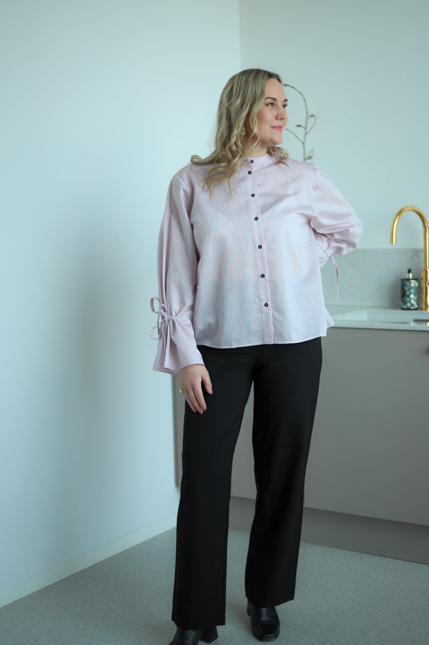 Nydelig skjorte med lys rosa striper fra Norr. Modellen er avslappet med rund krage, og brune små knapper i front. Lange ermer med lett droppede skuldre og knyting i mansjett. En moderne skjorte med lekkert snitt og stilige detaljer.