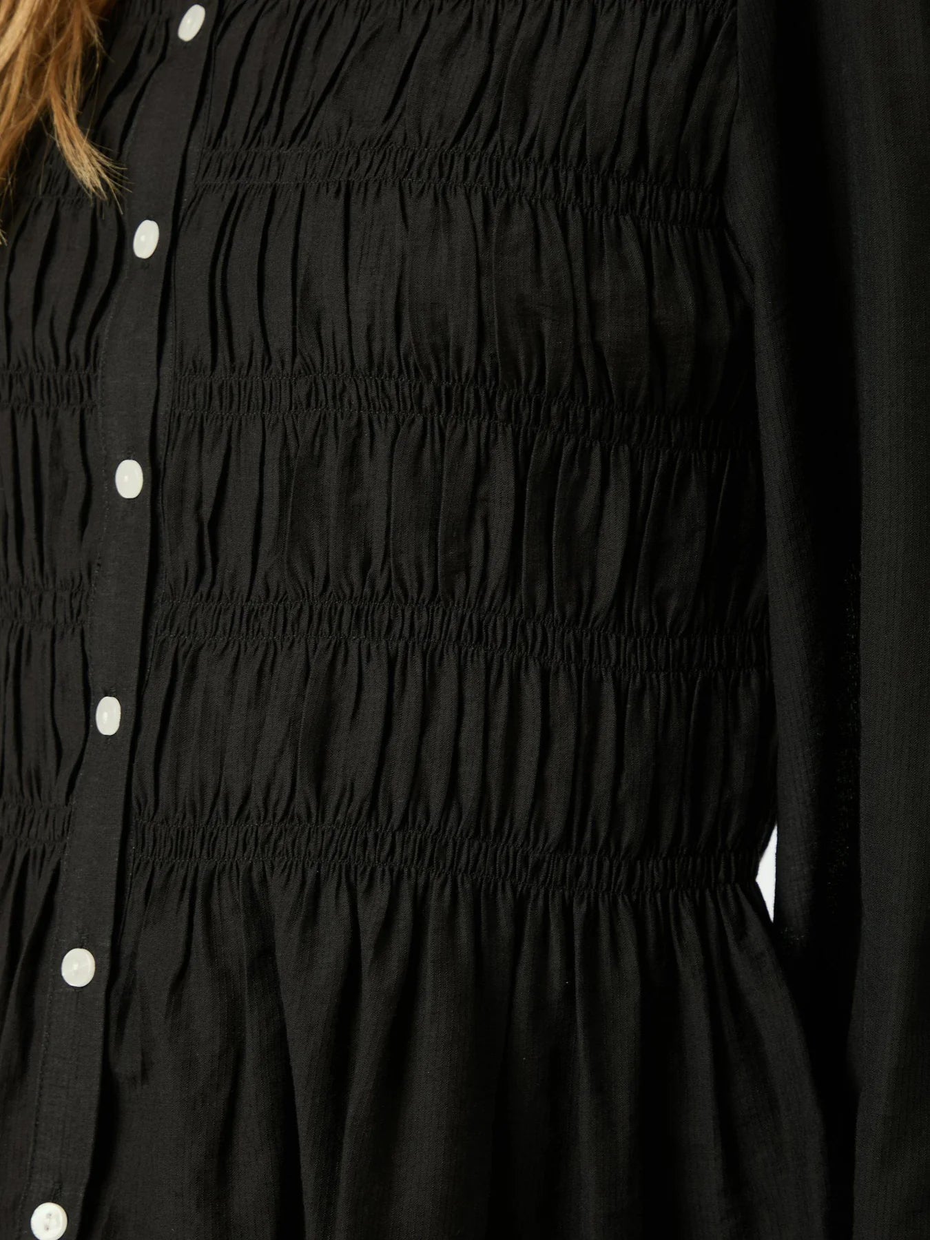 Søt sort bluse fra Neo Noir med smockdetaljer og peplumeffekt. Blusen har liten krage med feminine frills og knapper ton-i-ton langs fronten. Lange ermer med puffede skuldre og bred, elastisk mansjett. Tettsittende smock over hele overdelen og lett utsvingt nedre del fremhever figuren. Bluse som passer like godt i hverdagen som på fest!