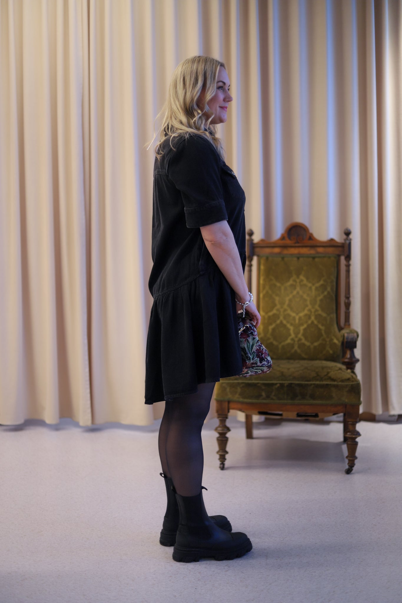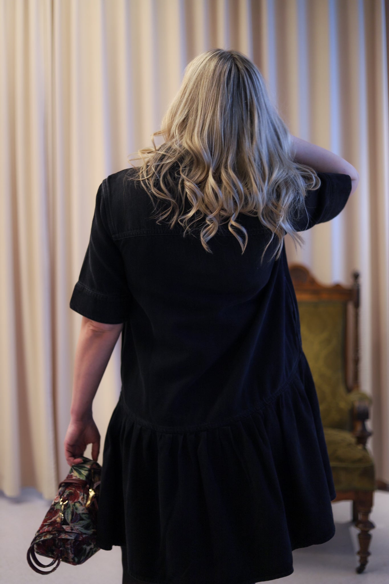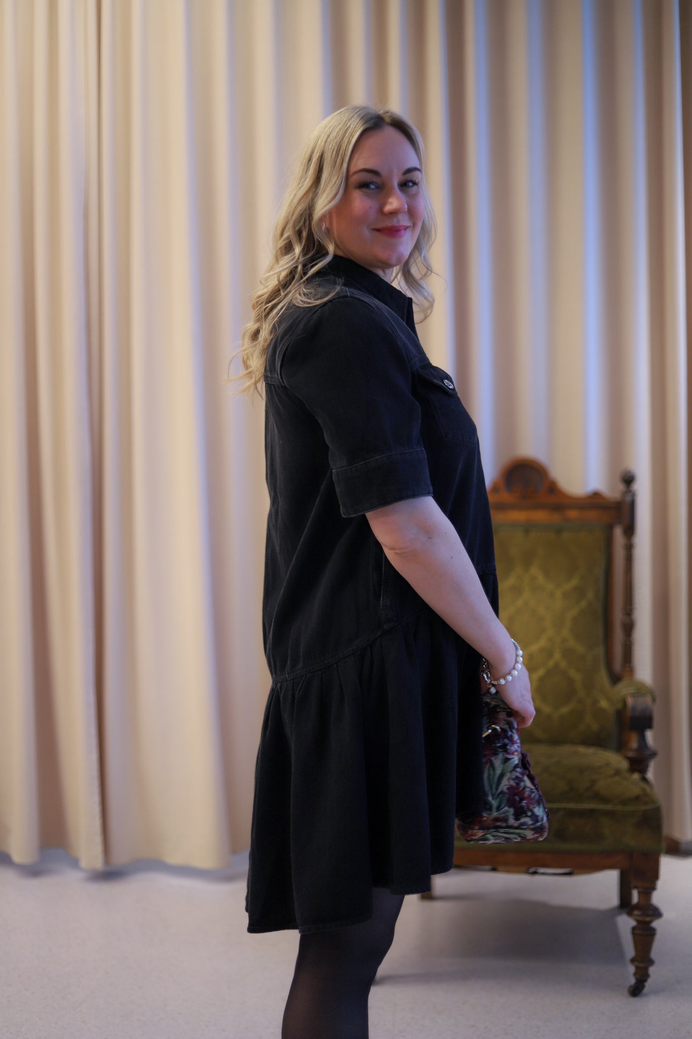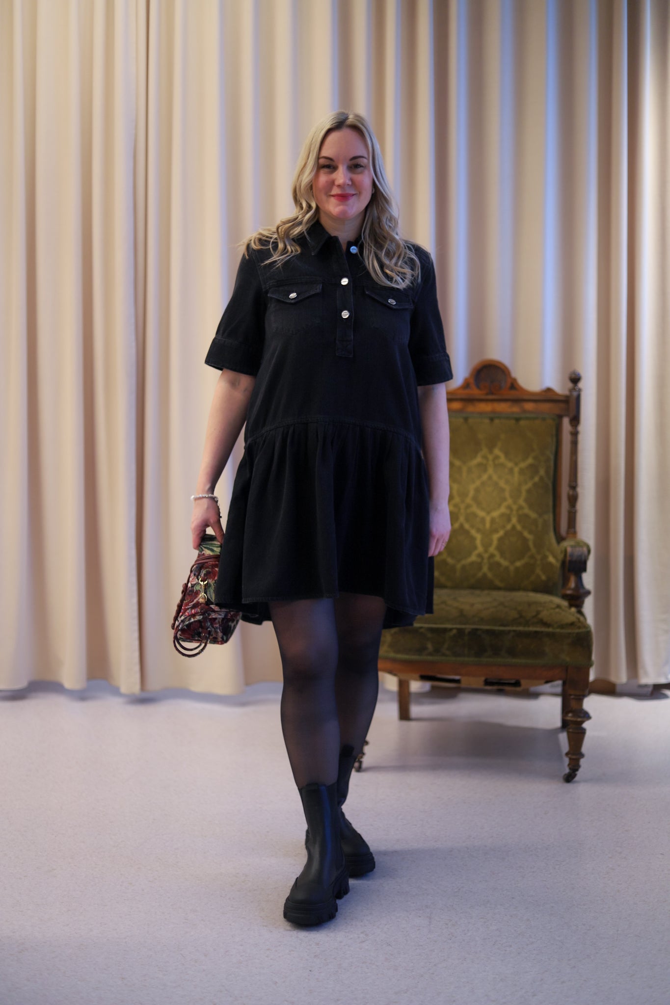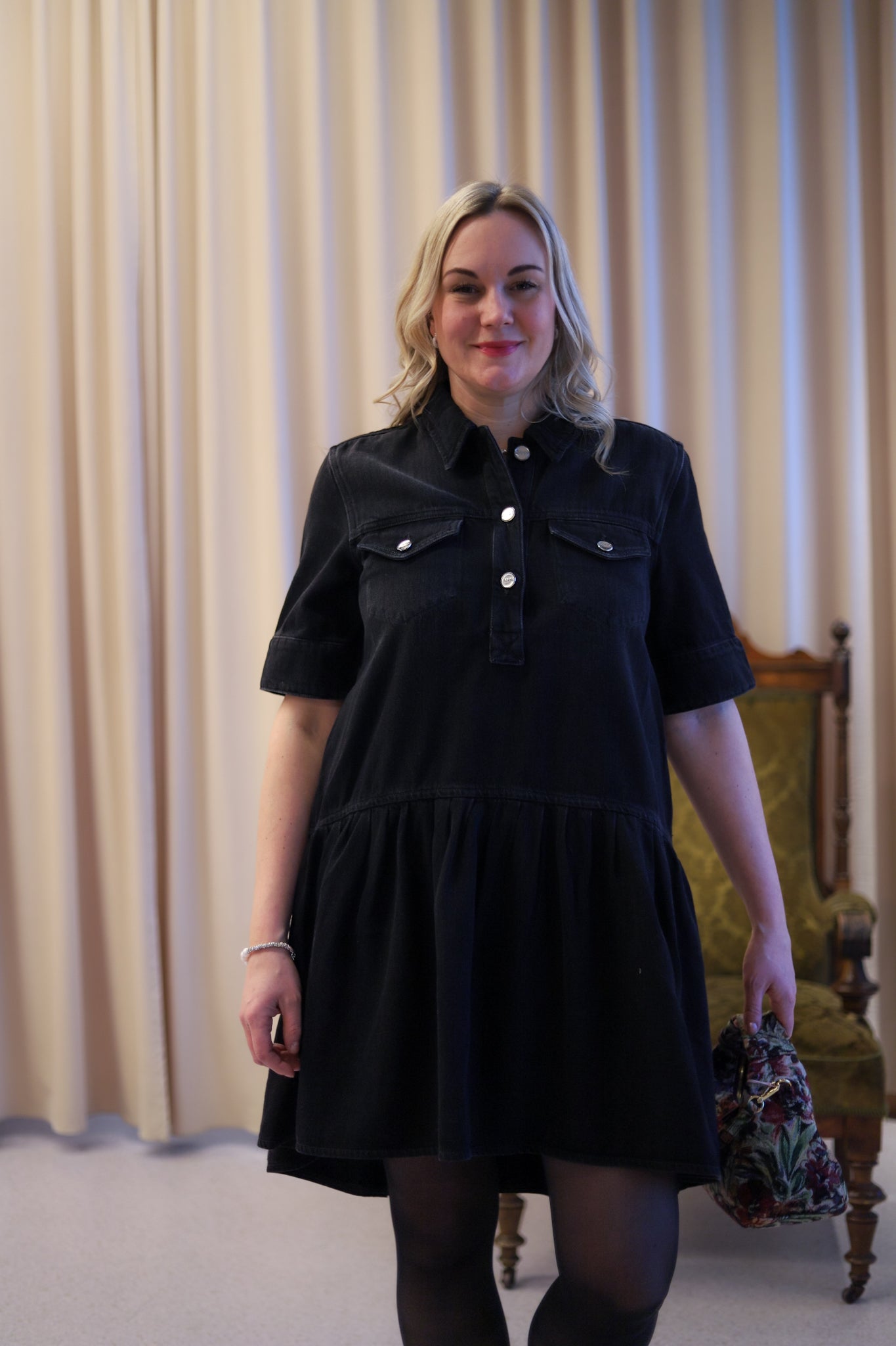 Stilig minikjole i sort vasket denim fra Ganni. Modellen er rett med volanger som skrår ut fra hoften. Korte ermer og klassisk krage med knepping på brystet. Kjolen har stilige patchlommer i front og lengden når til midt på låret. Laget i en deilig myk bomullsmix. Trendy kjole med stilige detaljer.