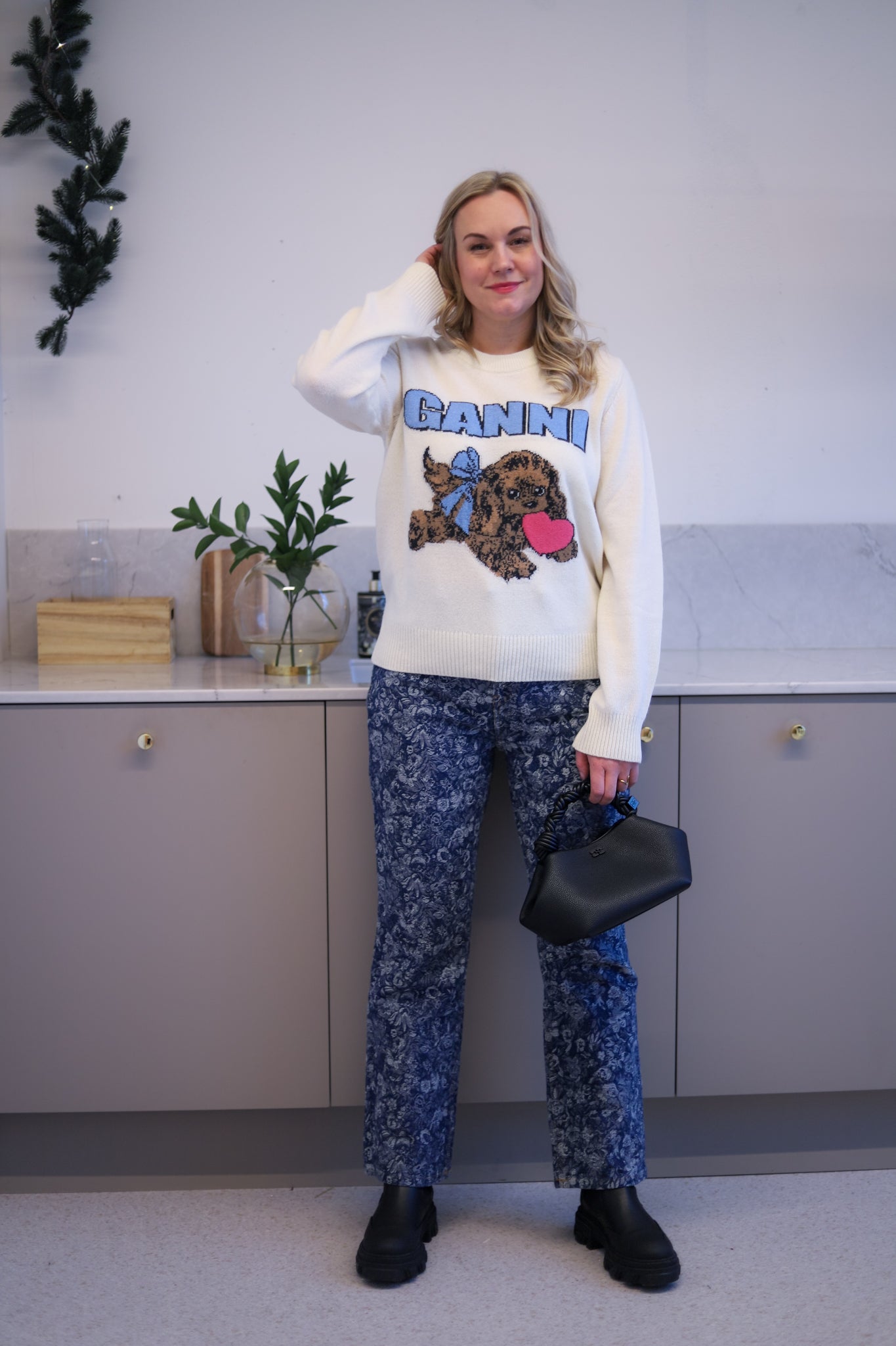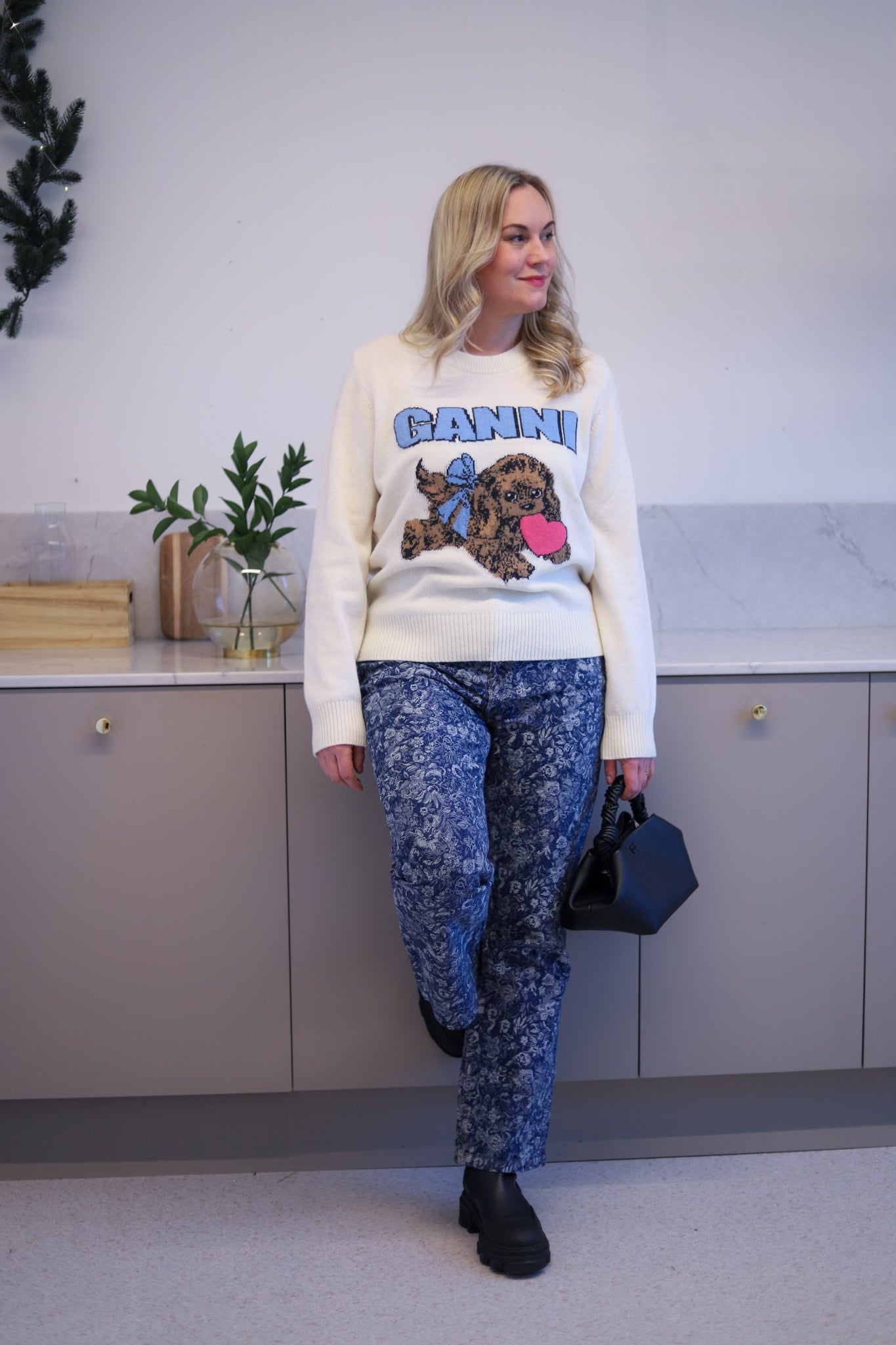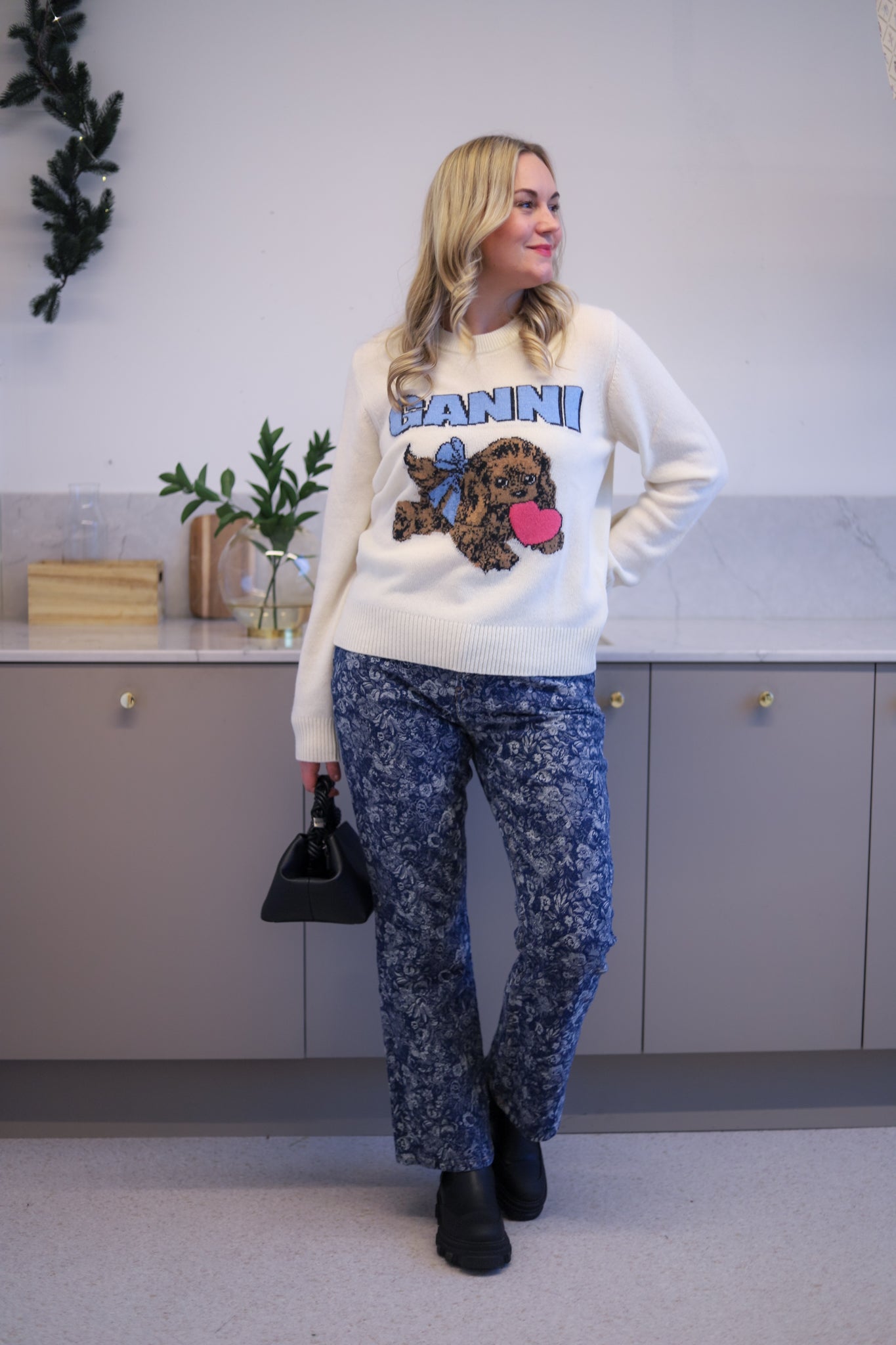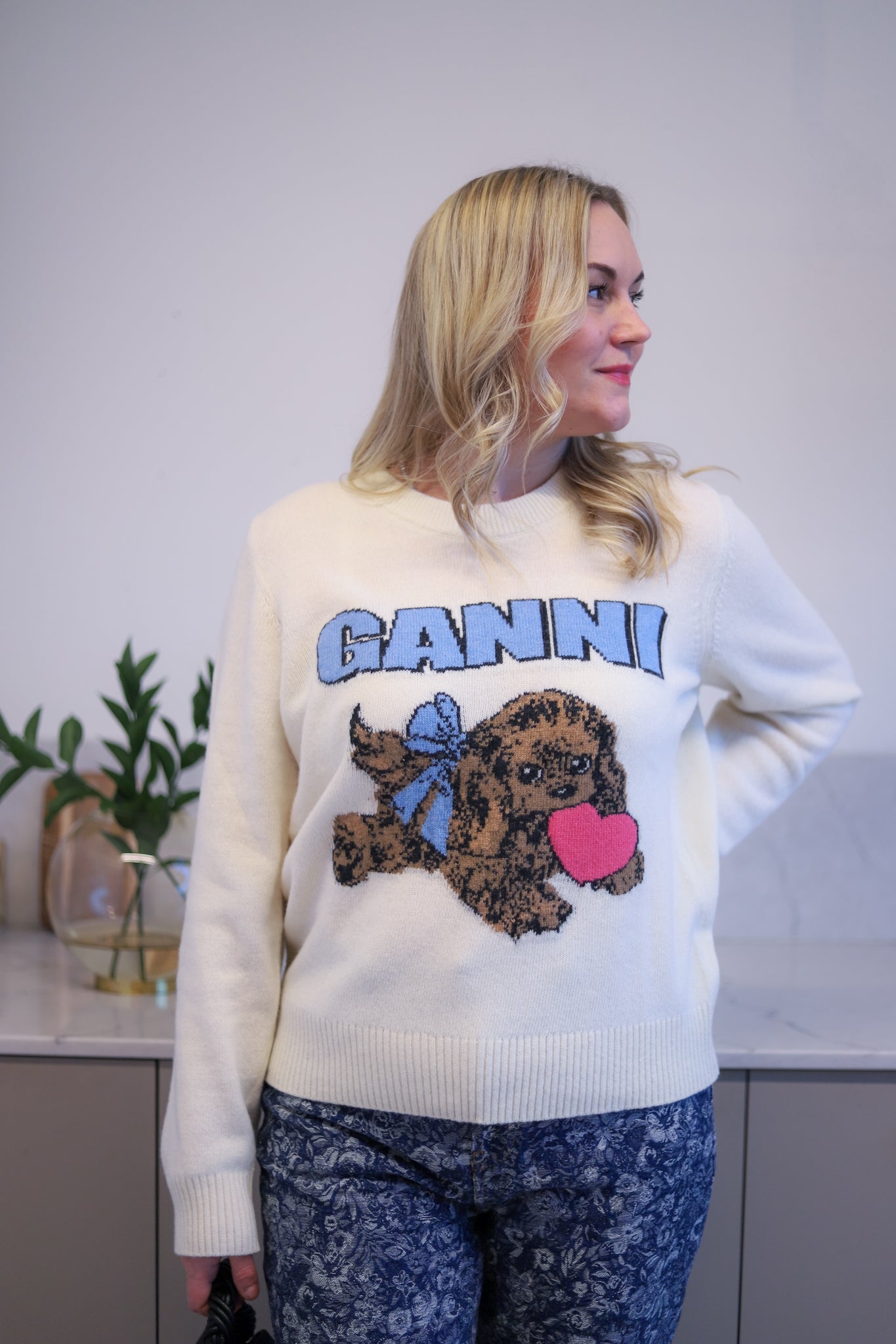 Herlig strikk i kremhvit ullblanding fra Ganni. Lys blå Ganni logo, og valp på brystet. Modellen er rett med rund hals, lange ermer og pen hoftelengde. Ribbestrikk i hals, hem og mansjett. En søt genser med lekent uttrykk.