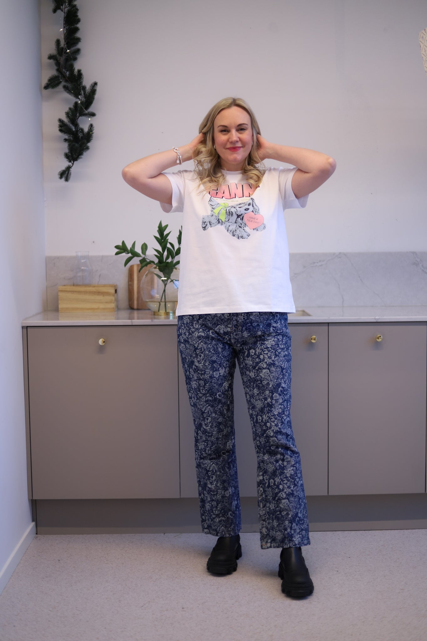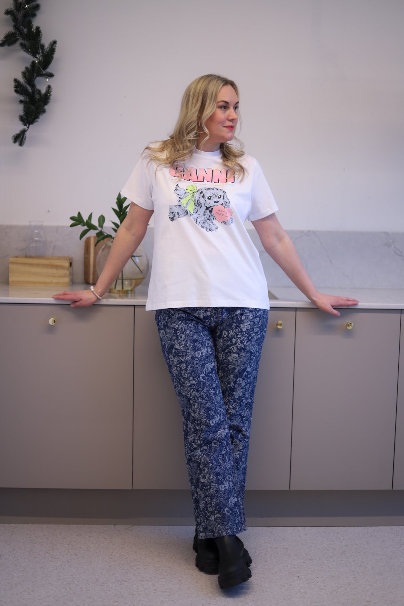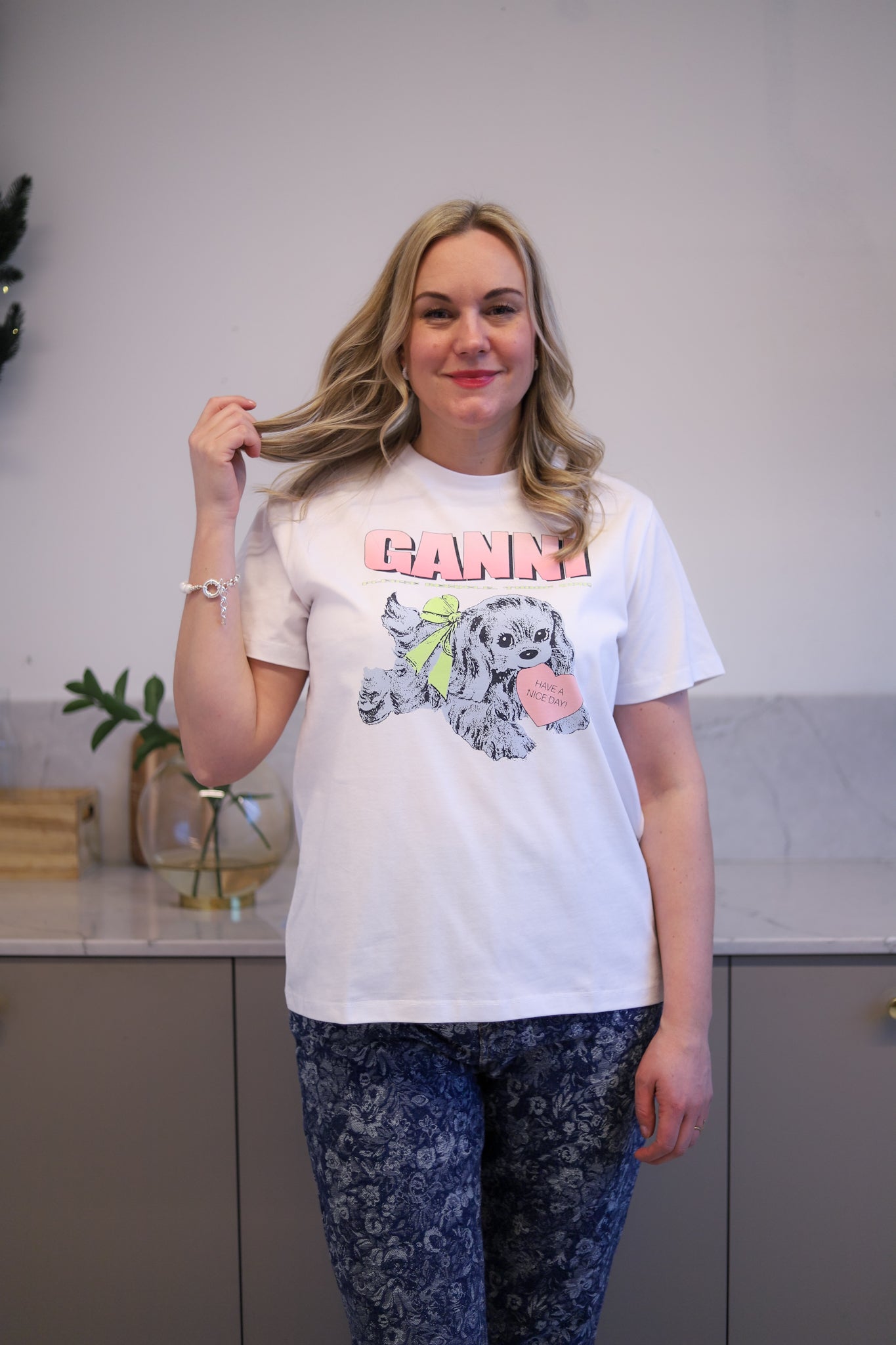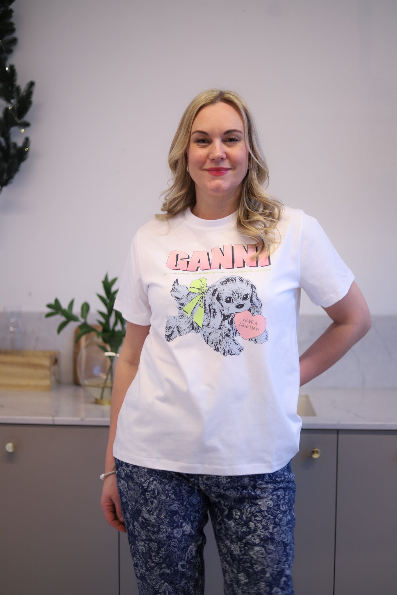 Statement t-skjorte fra Ganni. Regulær crewneck modell med avslappet passform. Deilig myk bomullskvalitet med ribb i halsen. Leknet print med en hund, logo og teksten "Have a nice day". Her i klassisk hvit med print i sort, lys rosa og gult. Stilig tee til jeans og skjørt.