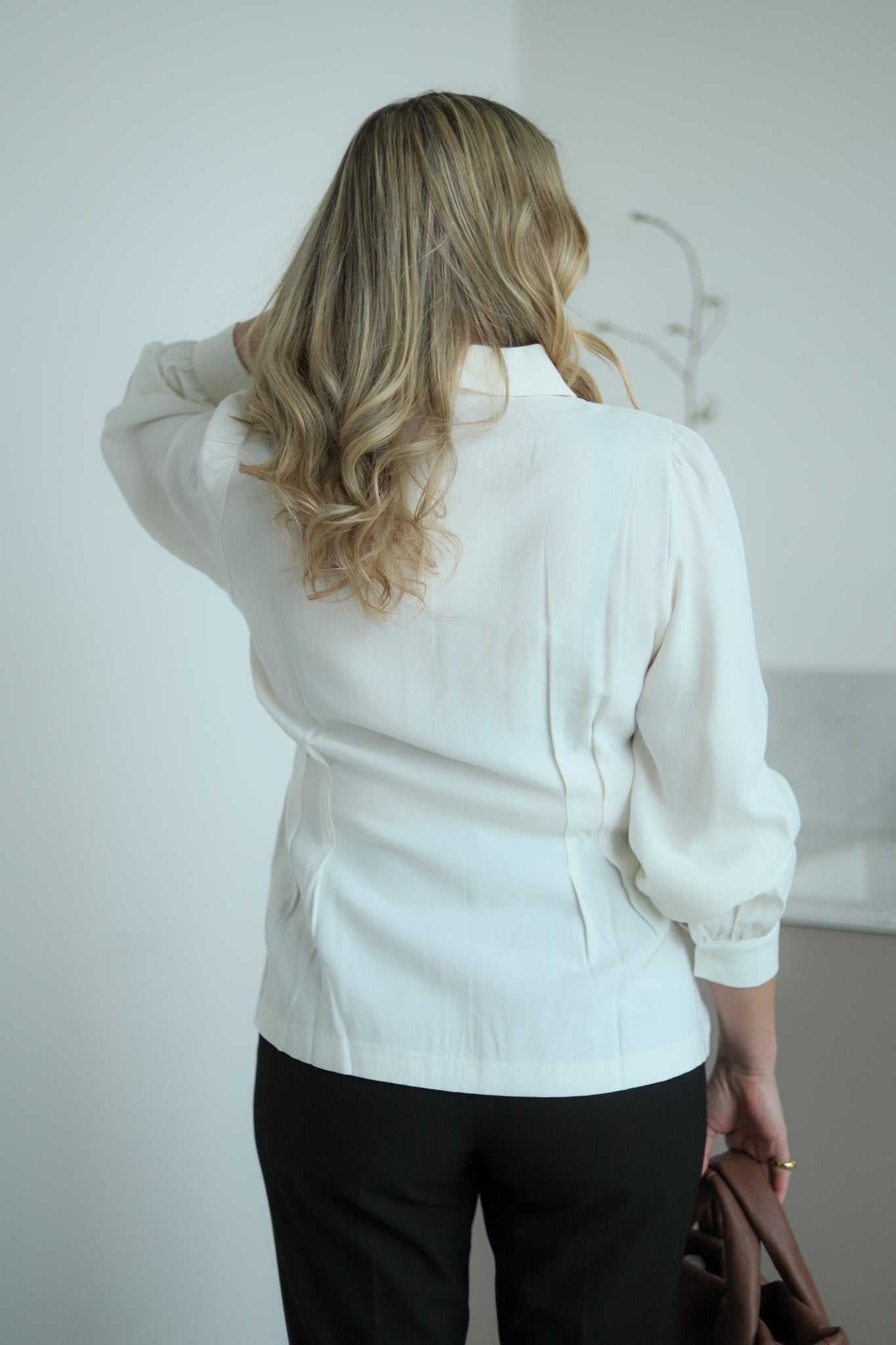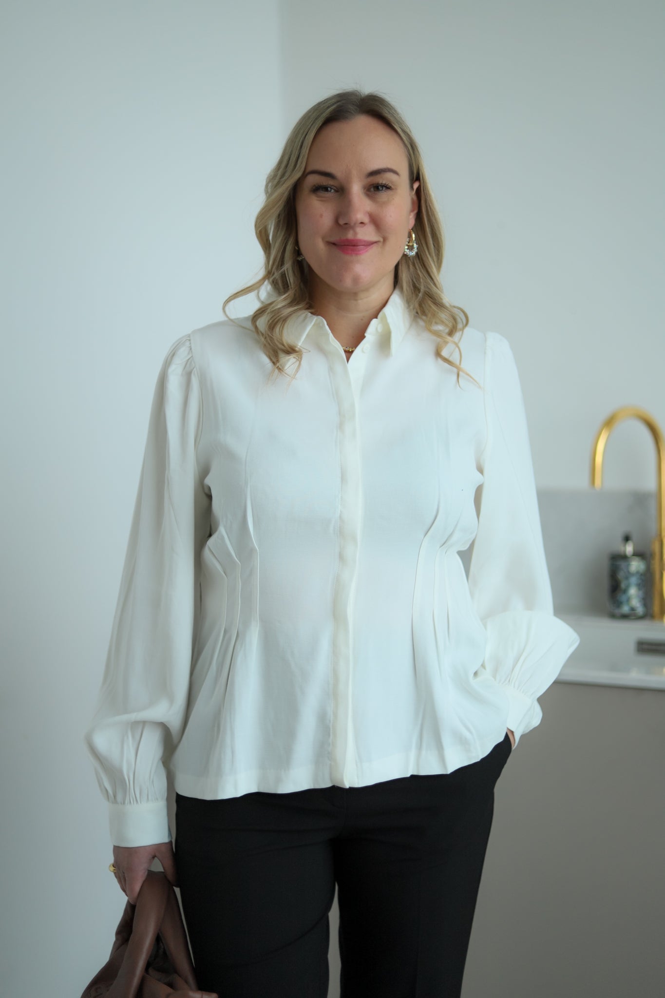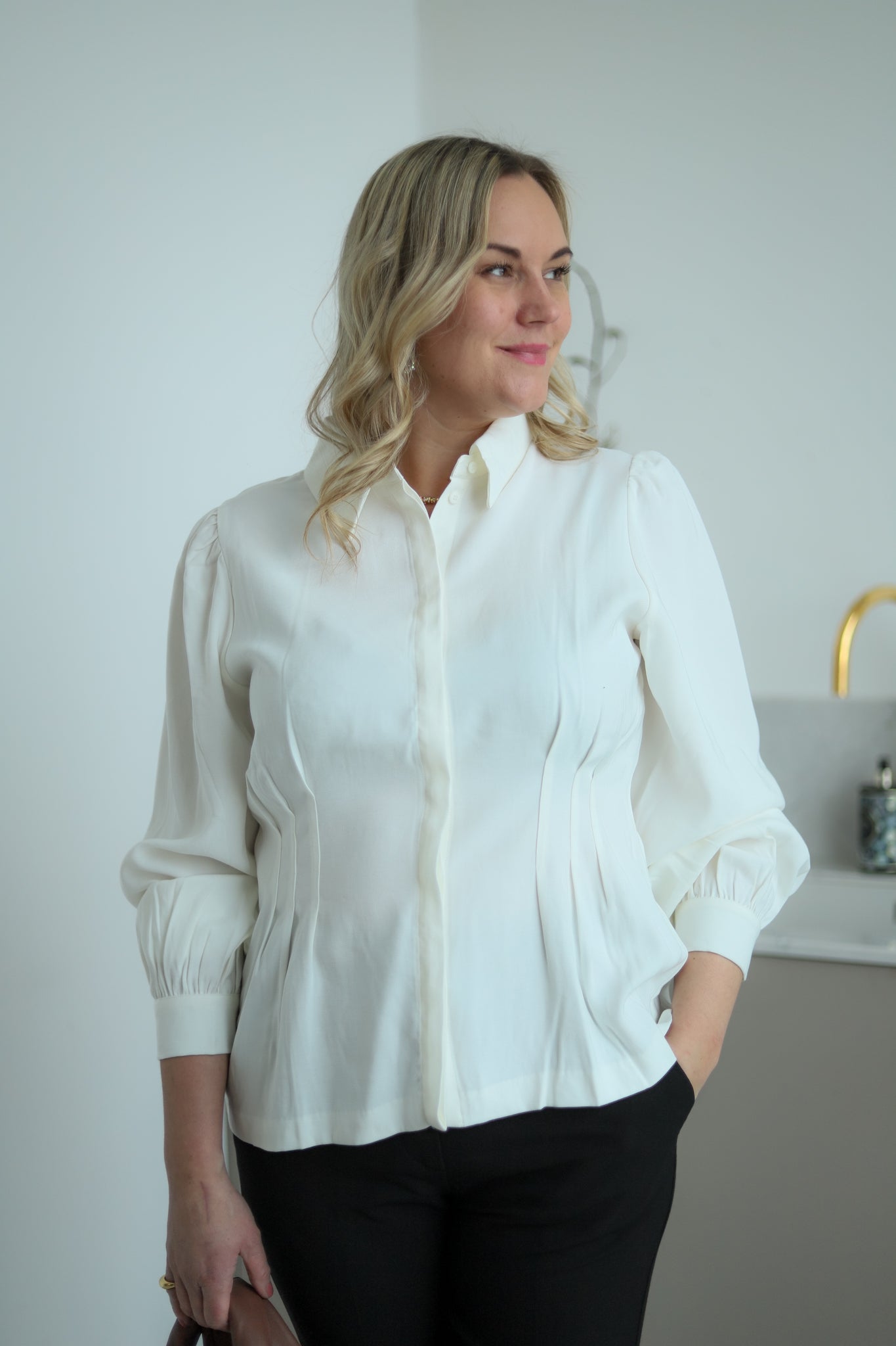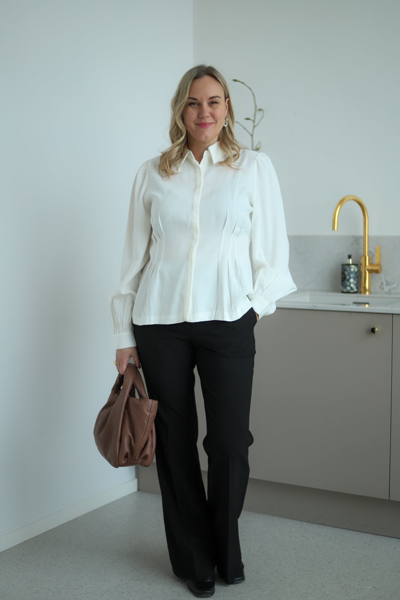 Feminin skjorte i off-white fra MSCH Copenhagen. Modellen har delikat hoftelengde med klassisk skjortekrage og skjult knepping i front. Vakre ballongermer med puff i skuldre og knapper i mansjett. Skjorten har innsvinget midje med fine folder som skaper en feminin silhuett. Den perfekte skjorten til mange ulike anledninger.