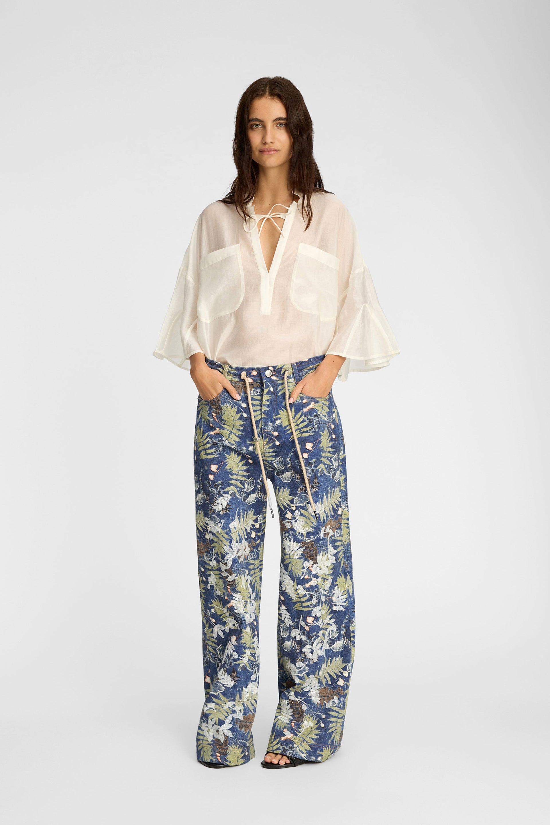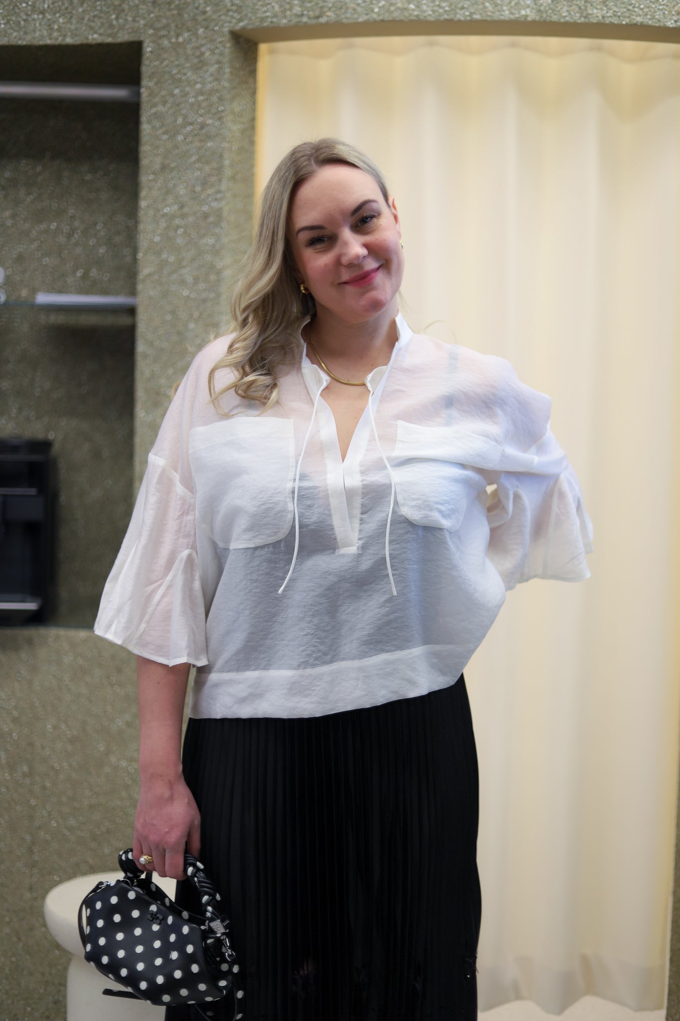 Stilig topp i off-white fra Munthe. Modellen er rett med oversized look. Den har dyp V-hals med nett knytebånd og croppet lengde. Voluminøse albulange ermer med droppet skulder og lett volang i mansjett. Blusen har diskret brystlommer i front. En nydelig topp, som er lett gjennomskinnelig med avslappet uttrykk som passer til de fleste anledninger.