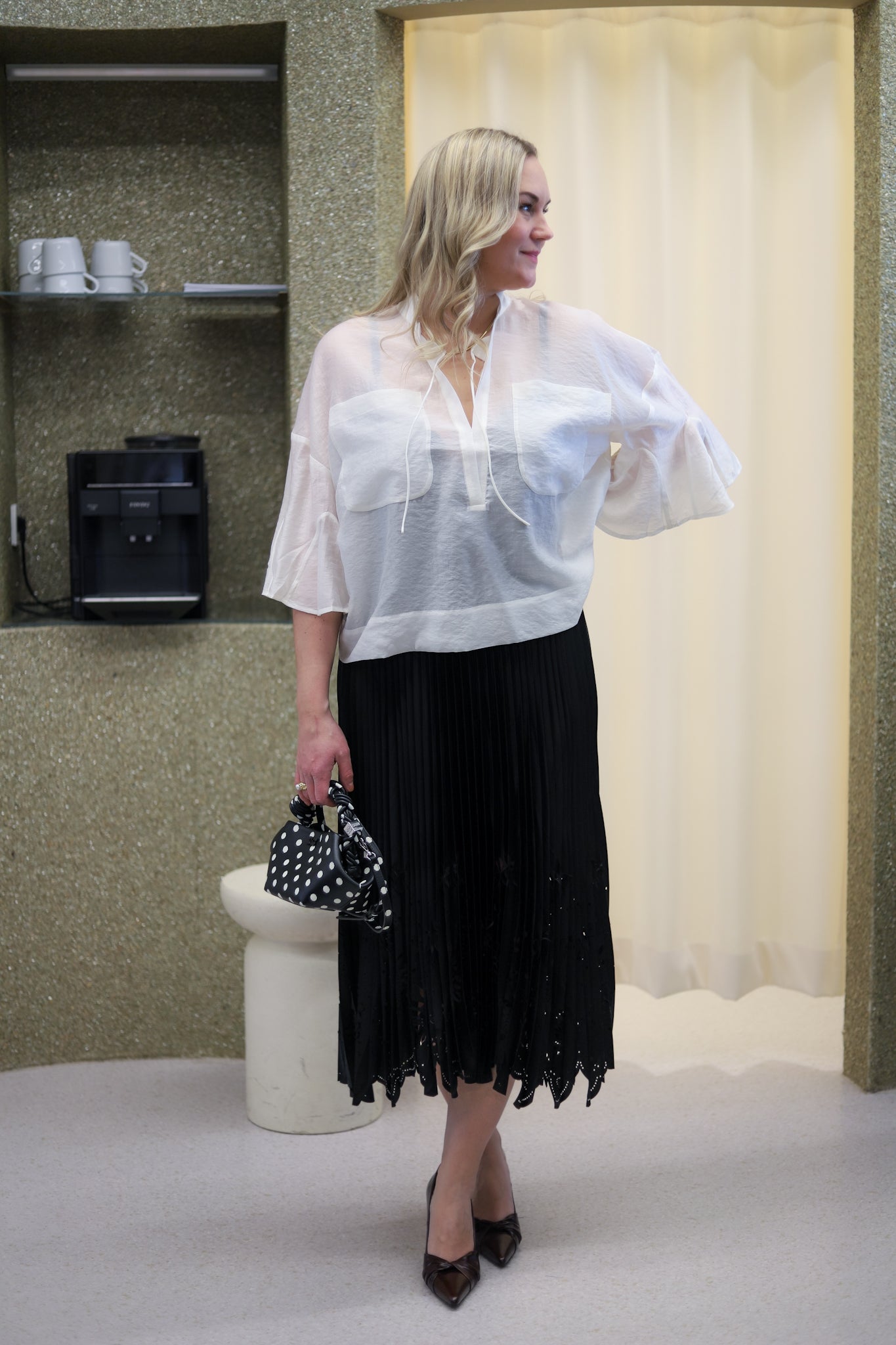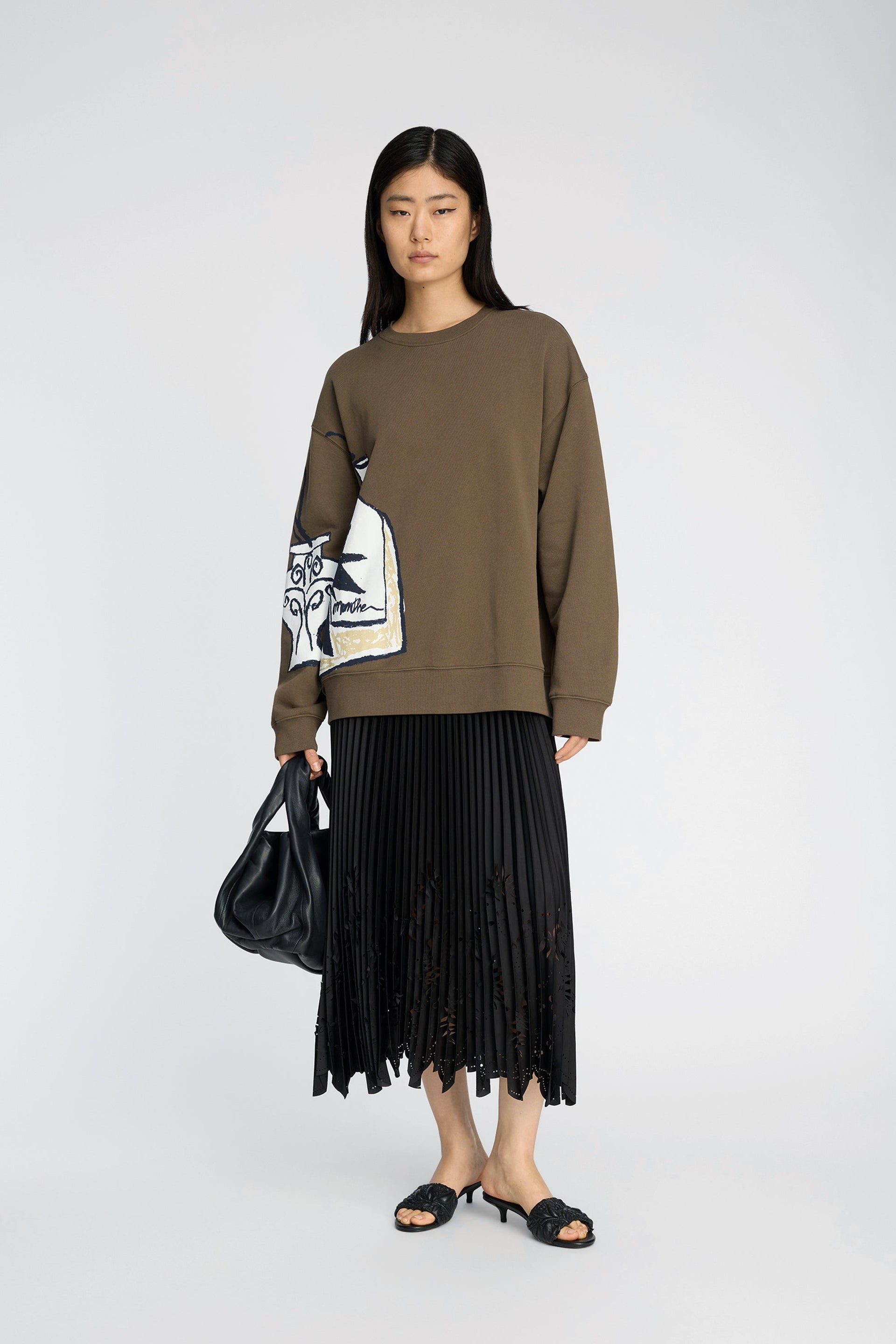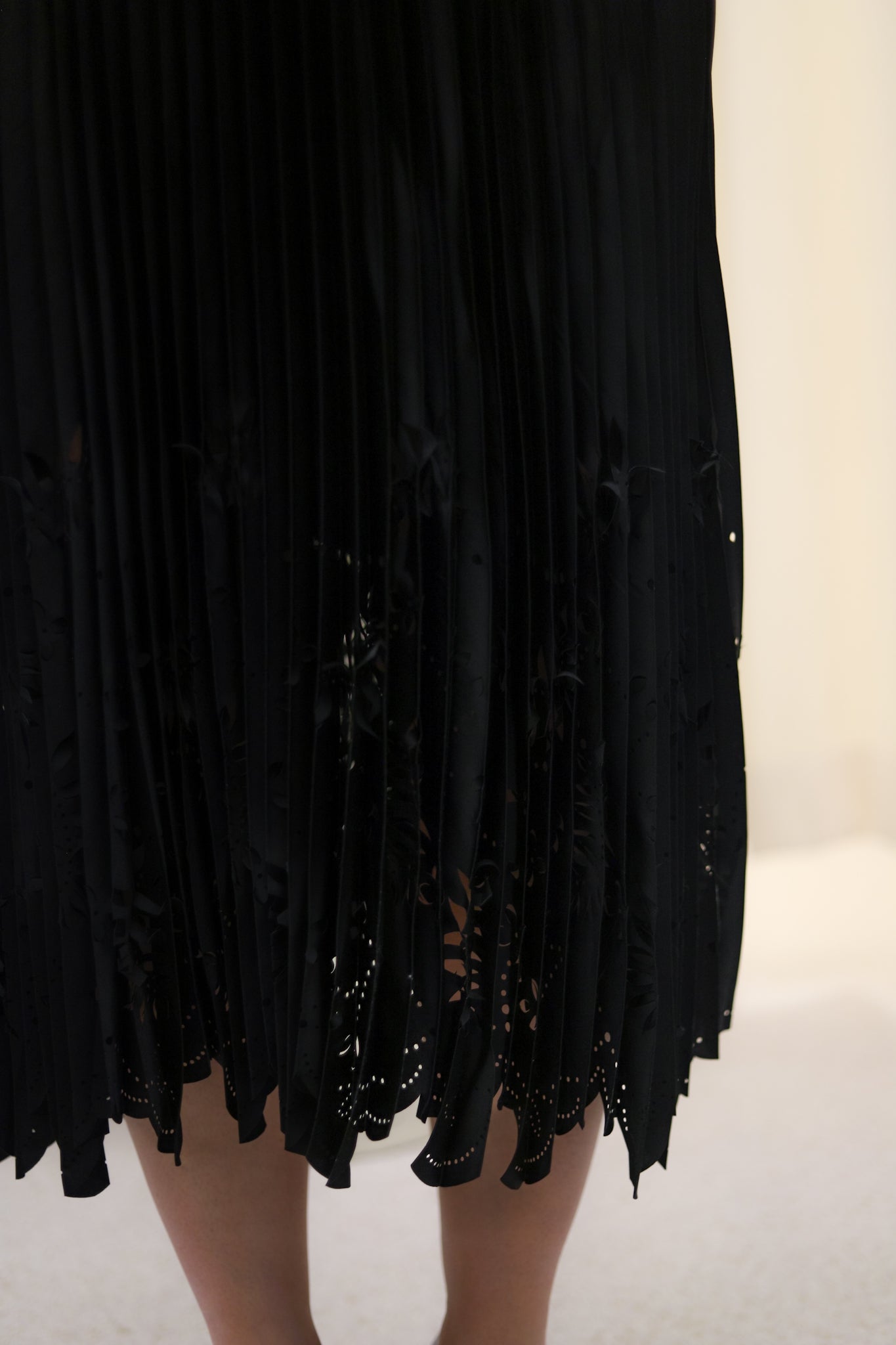Elegant plisseskjørt i klassisk sort med lekre utskjæringer fra Munthe. Modellen skrår lett ut med midilengde. Den har elastisk midje med diskret Munthelogo. Sesongens lekreste skjørt som lett kan pyntes opp og ned etter anledning.