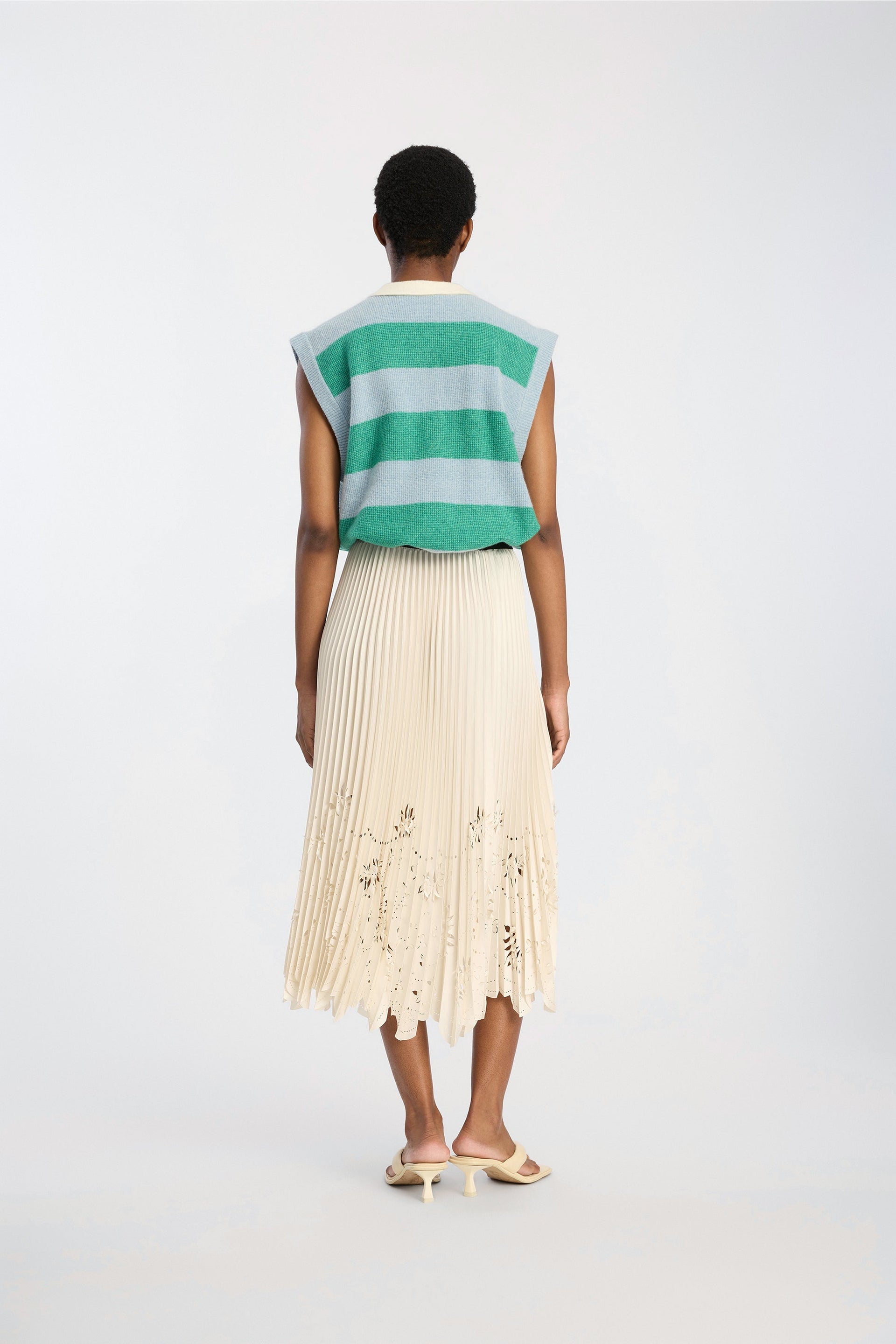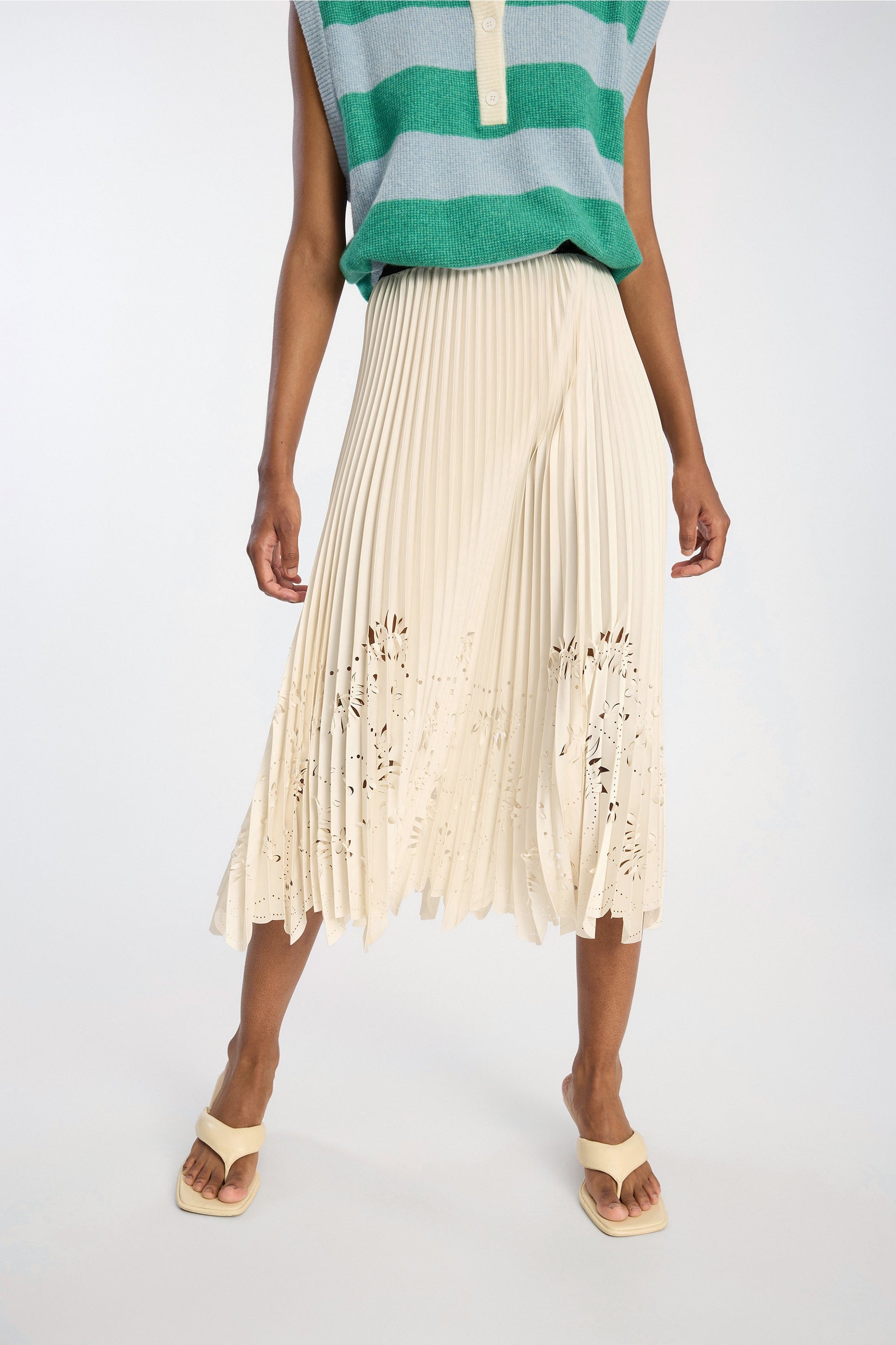Elegant plisseskjørt i off-white med lekre utskjæringer fra Munthe. Modellen skrår lett ut med midilengde. Den har elastisk midje i sort med diskret Munthelogo. Sesongens lekreste skjørt som lett kan pyntes opp og ned etter anledning.