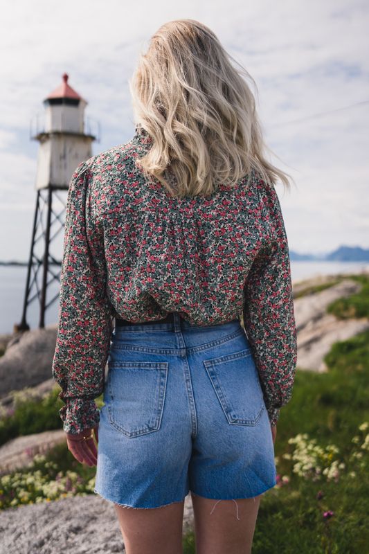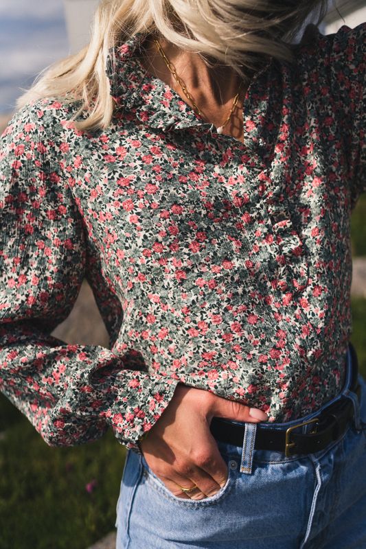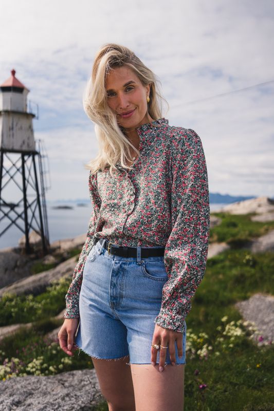 Lekker bluse med flerfarget blomsterprint fra Raus. Blusen har en avslappet passform, pen lengde og buet hem. Lange ermer og knappestolpe med trukne knapper i front. Søte små frills i hals, på mansjetter og i kragen gir blusen et lekent og feminin preg. Laget i en viskosemiks som føles myk og behagelig på. Den ultimate vår og sommerbluse og et must-have i garderoben!
