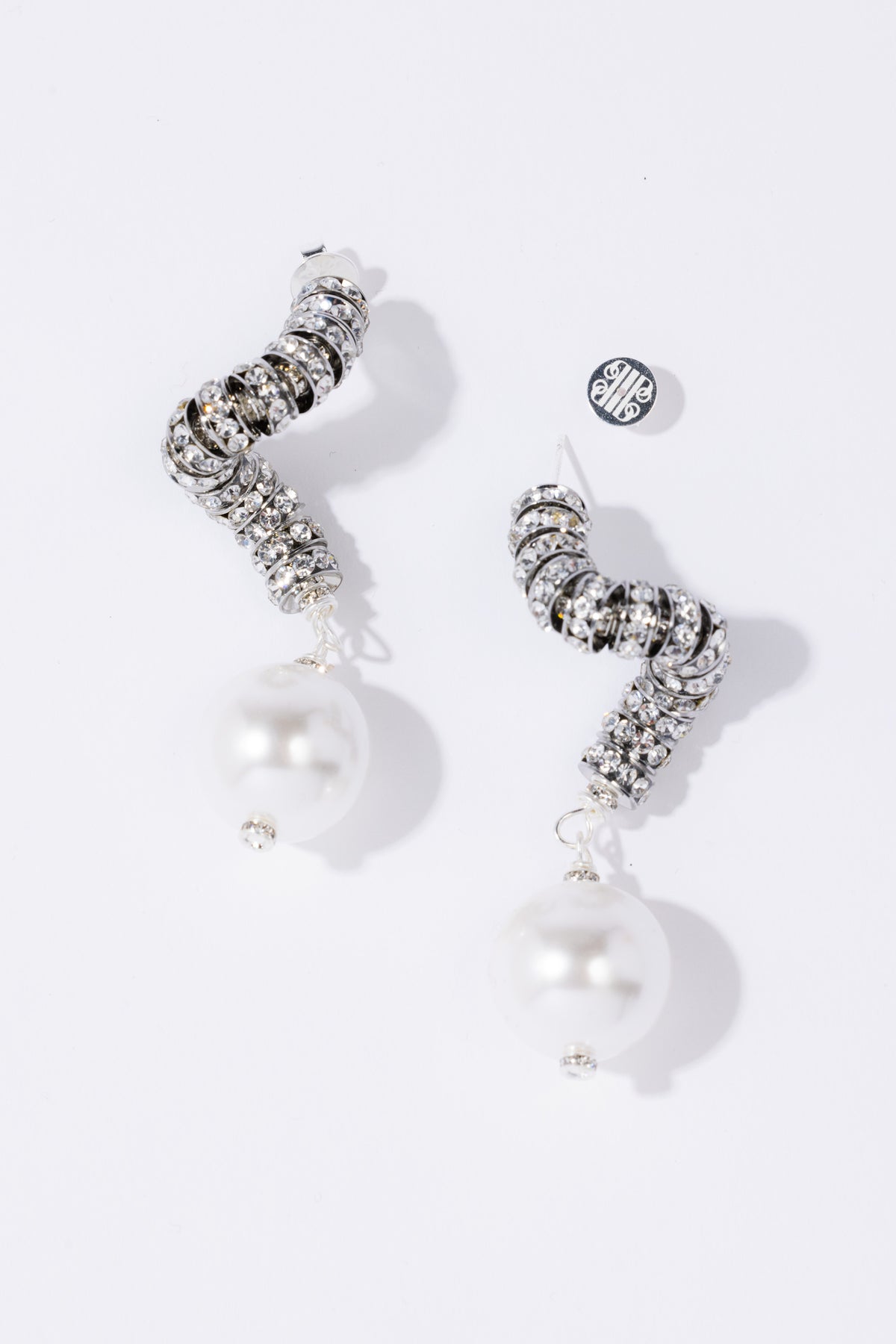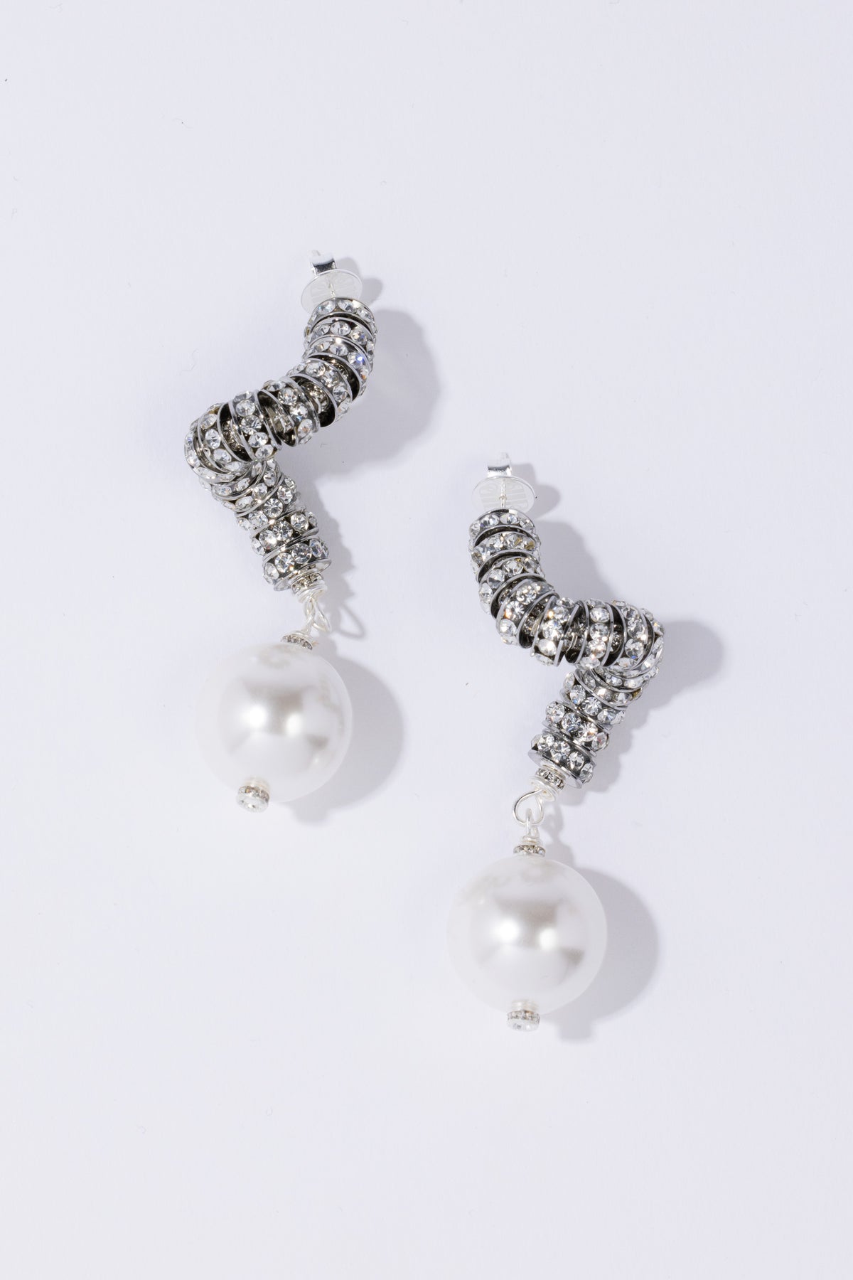 Madonna Earrings Silver er et par skulpturelle øredobber, med overdimensjonerte perler i bunn og glittrende stener. Virvelfasong og plasseringen av perlene gir ørepynten en organisk og asymetrisk look. De er laget av sølvbelagte rondelle-perler, akryl-perler og har stift i sølv.