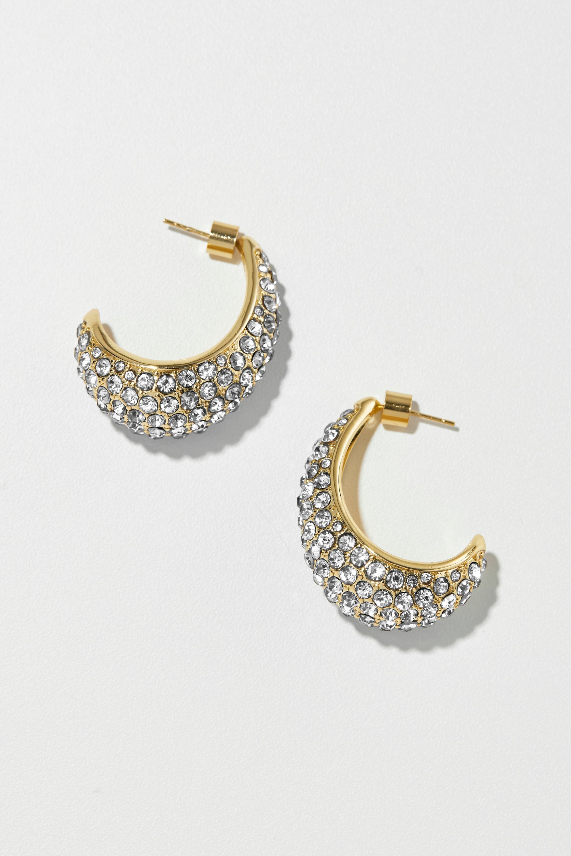 Small Crecent Hoops Gold/Clear fra Pearl Octopuss.y. Øredobbene har en flatterende buet form med reflekterende krystaller som fanger lyset vakkert. Laget i gullbelagt messing og glasskrystaller. Stift i 925 sterlingsølv.