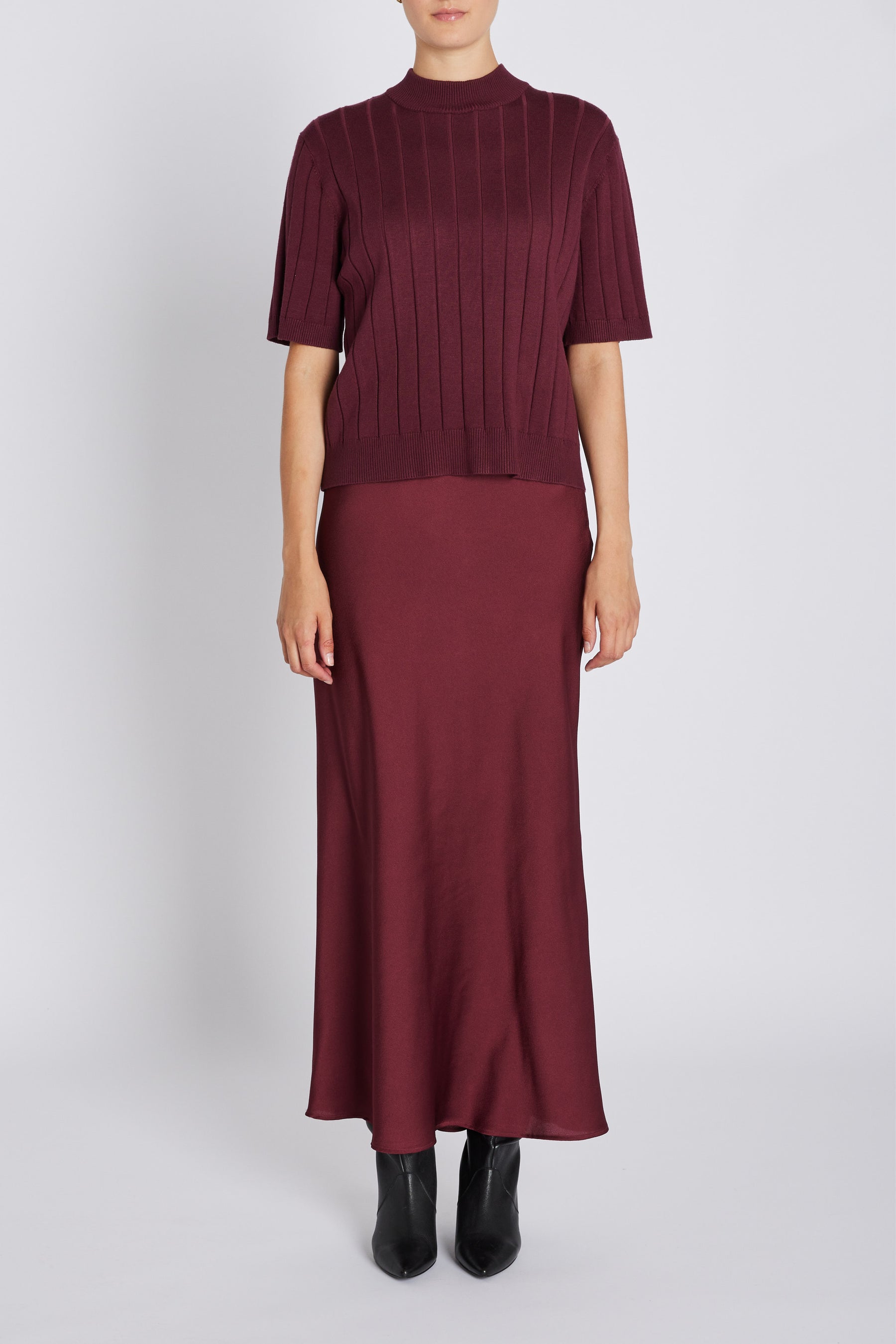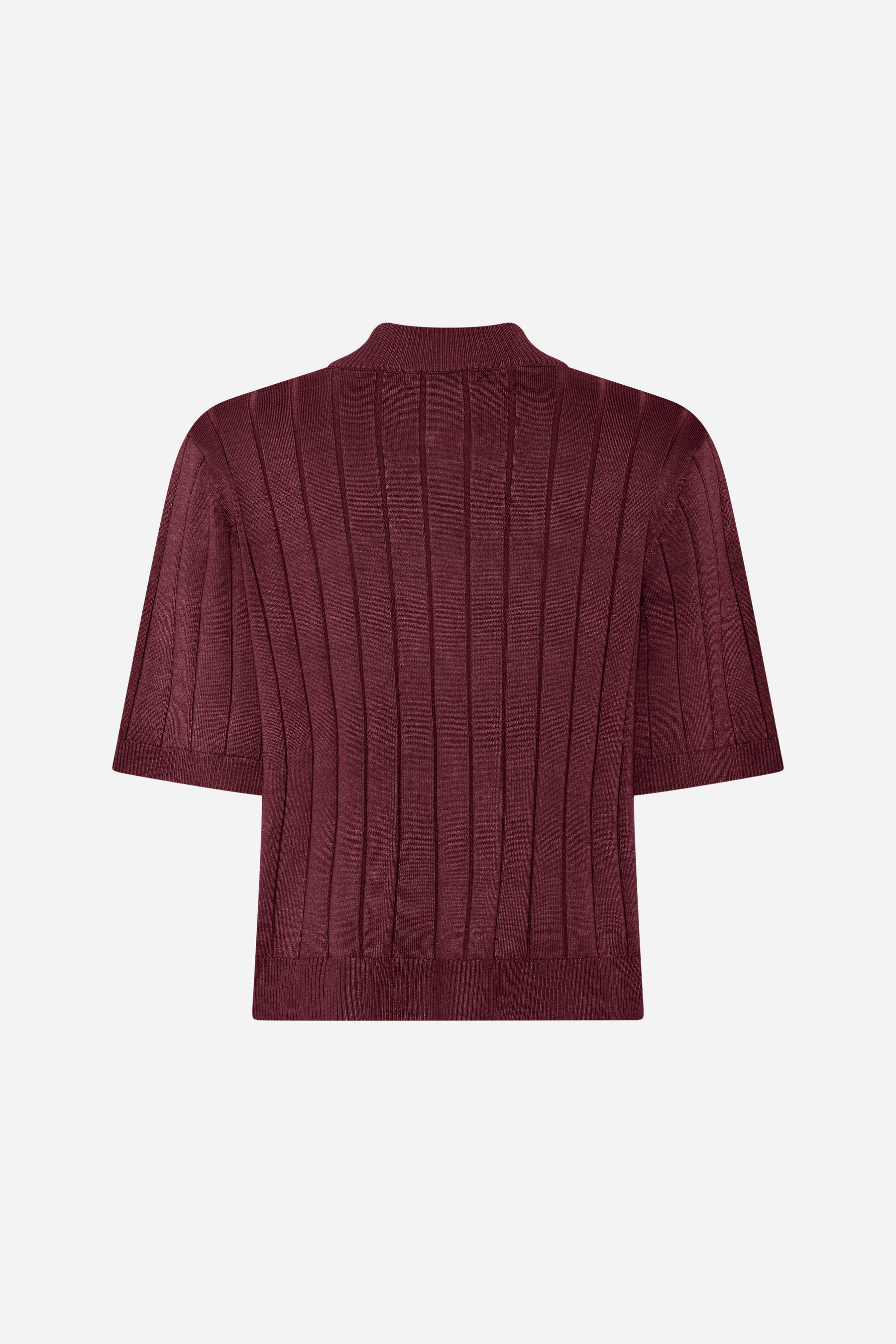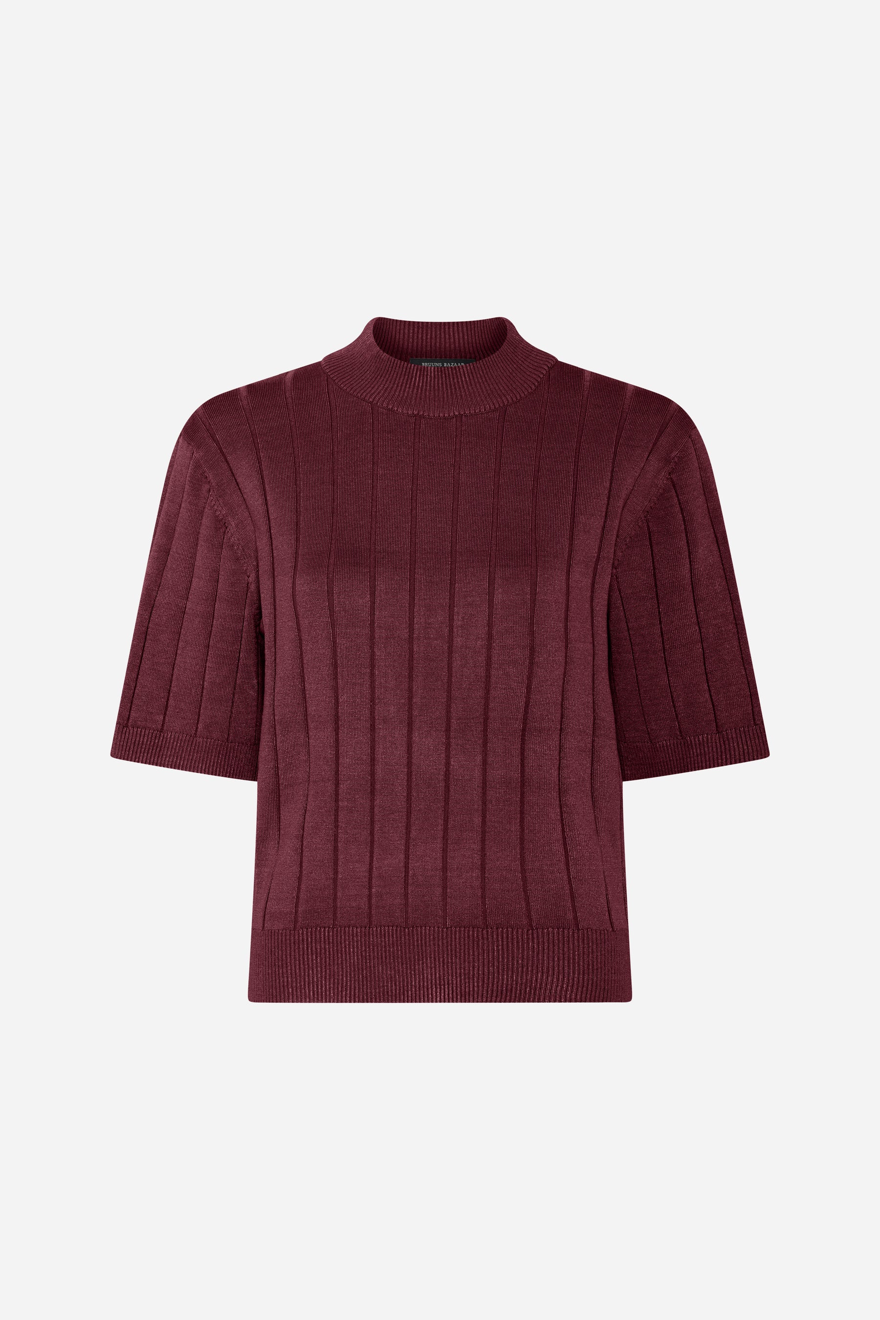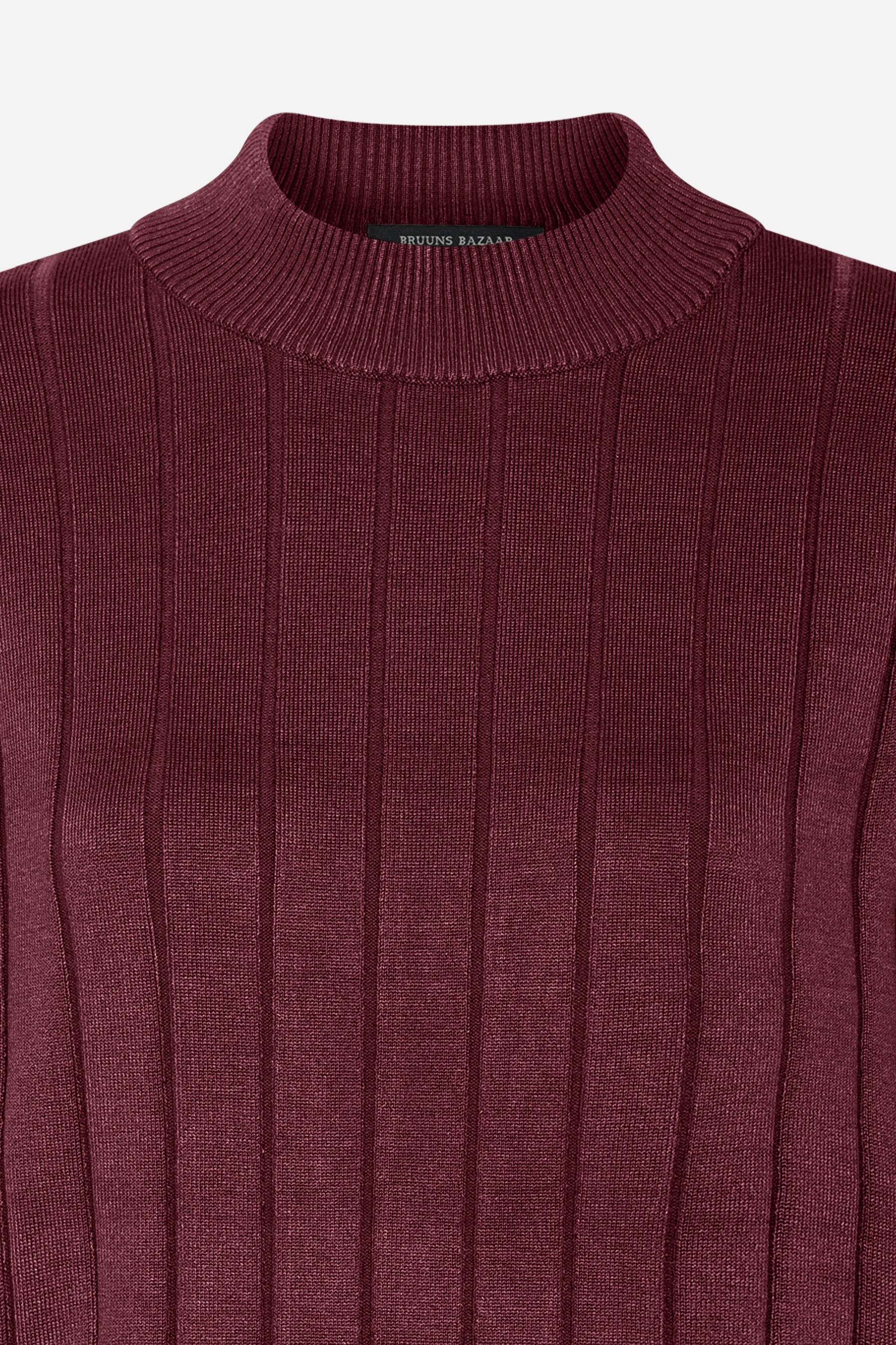 Elegant topp i trendy burgunder med bred ribbestrikk fra Bruuns Bazaar. Rett passform med semihøy hals og albulange ermer med lett droppet skulder. Behagelig myk strikket topp med pen hoftelengde og smal ribb rundt hals, hem og mansjett. Perfekt til alle anledninger da den er lett og pynte opp og ned.