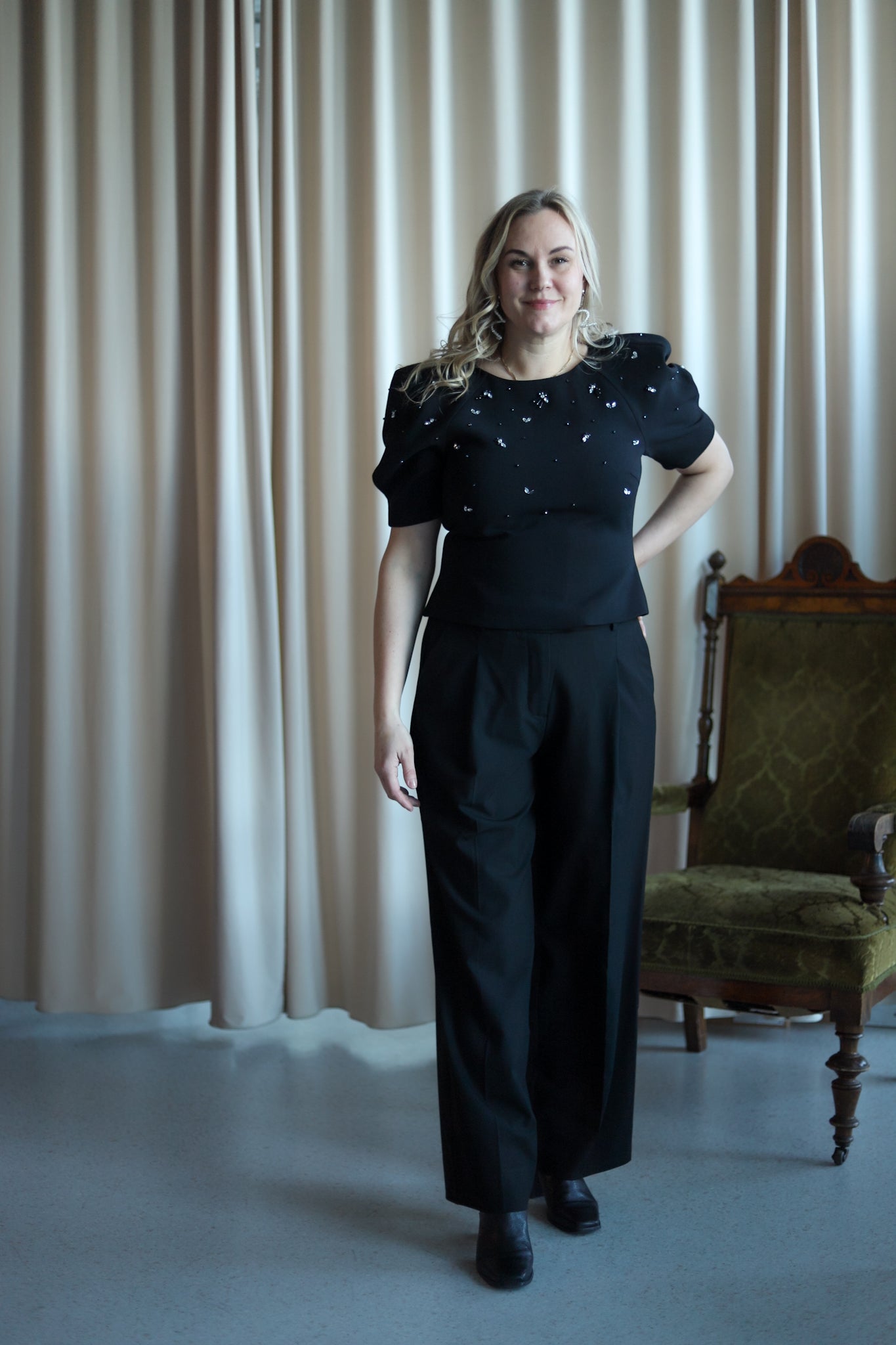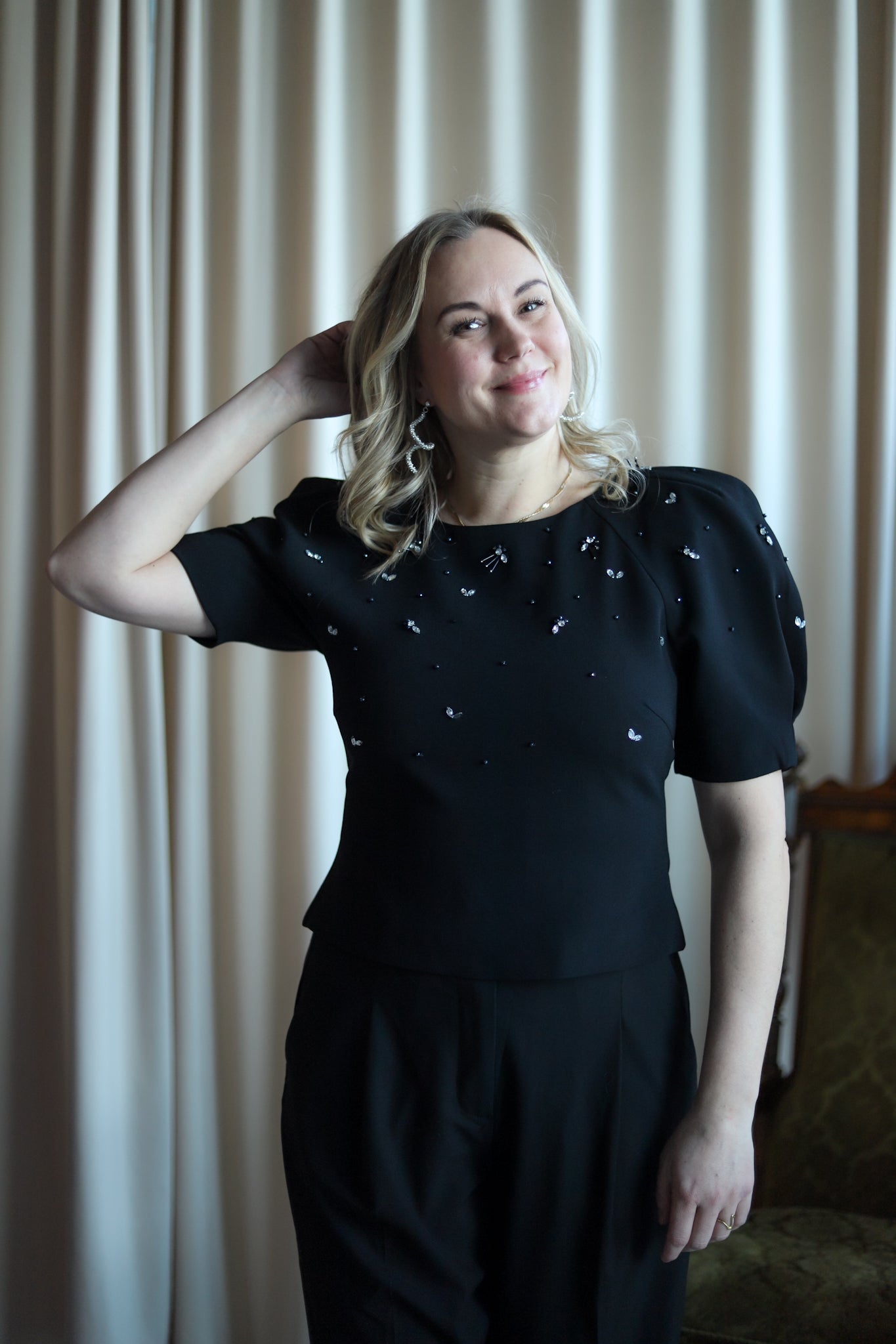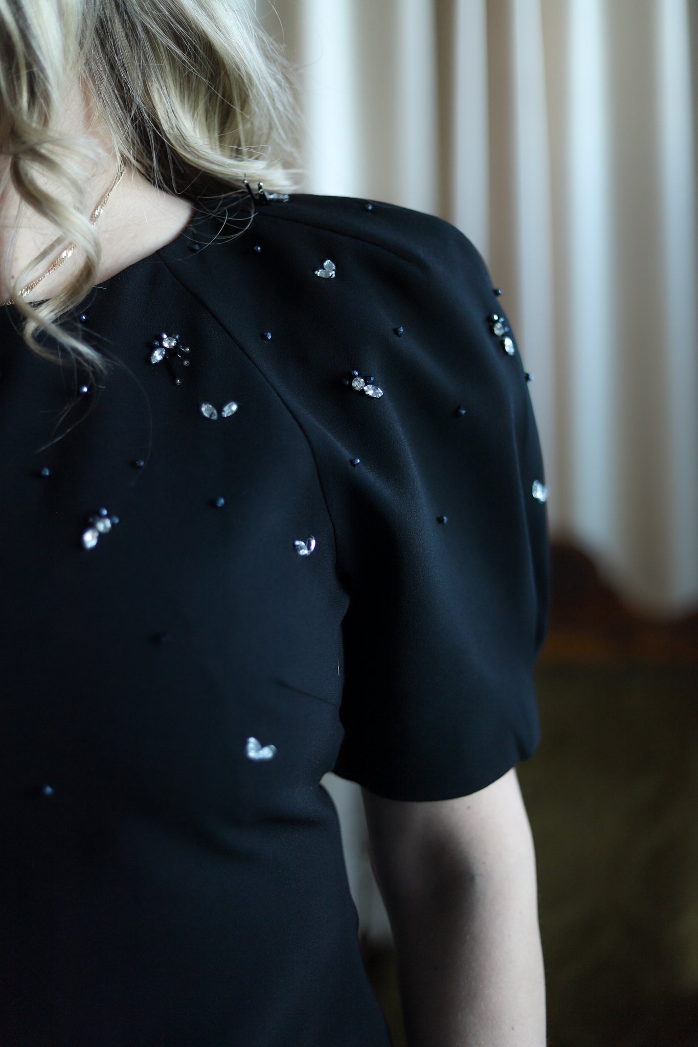 Feminin topp i klassisk sort med lekre detaljer fra Camilla Pihl. Tettsittende modell med rund hals og korte voluminøse ermer. En meget flatterende topp med nett lengde. Overdelen er dekorert i delikate stener. Nydelig topp til hverdags og sesongens festligheter.