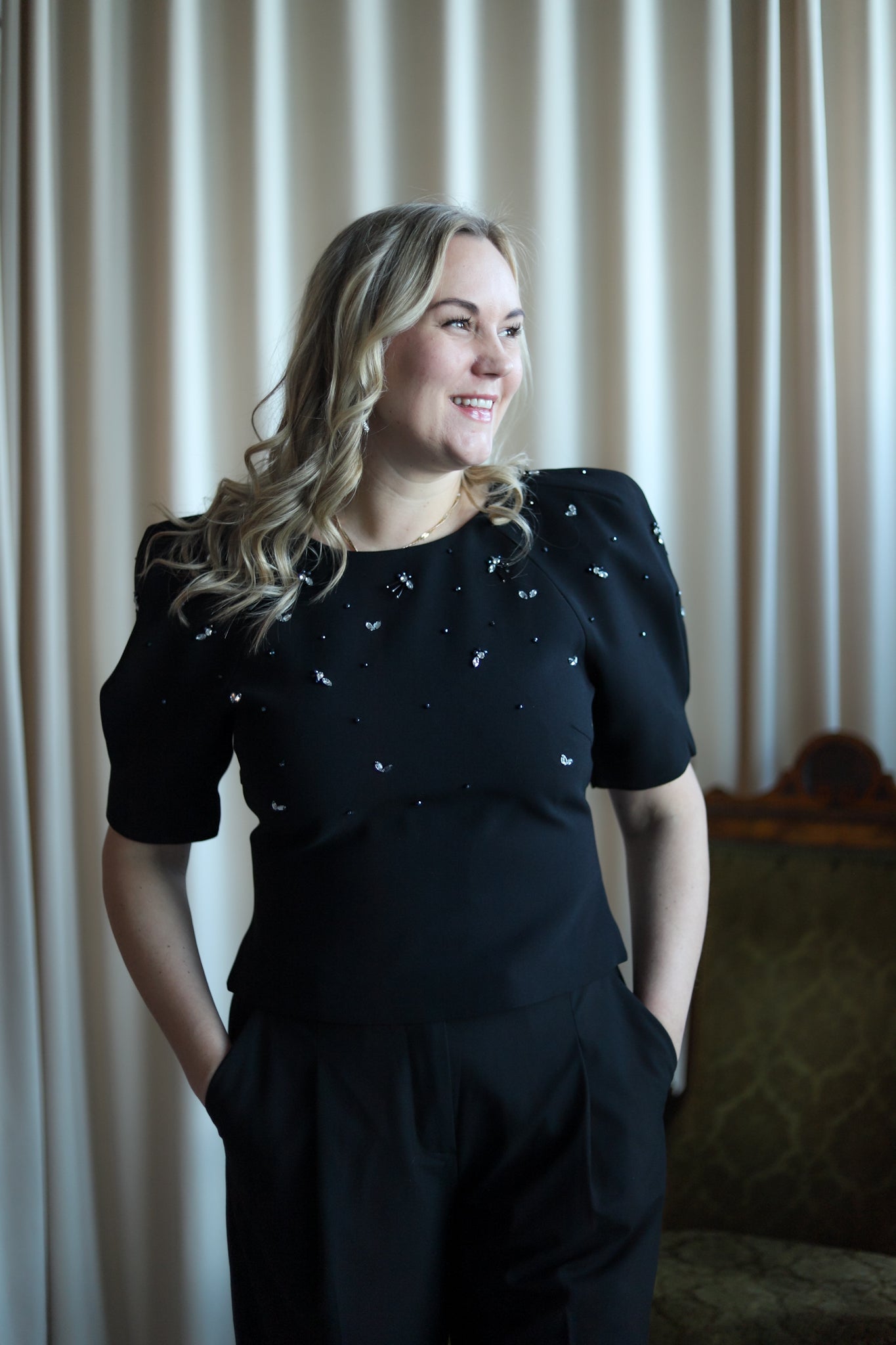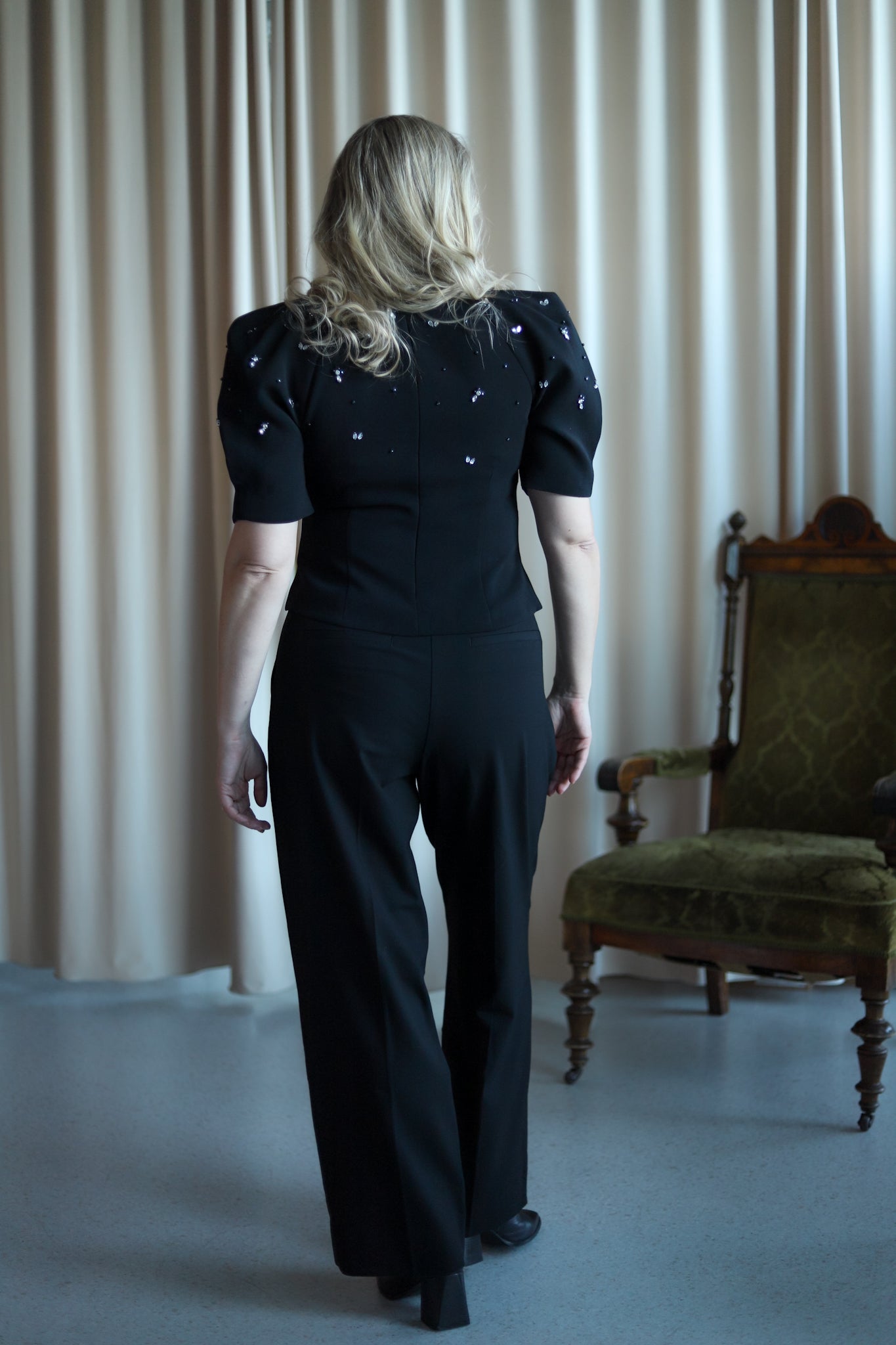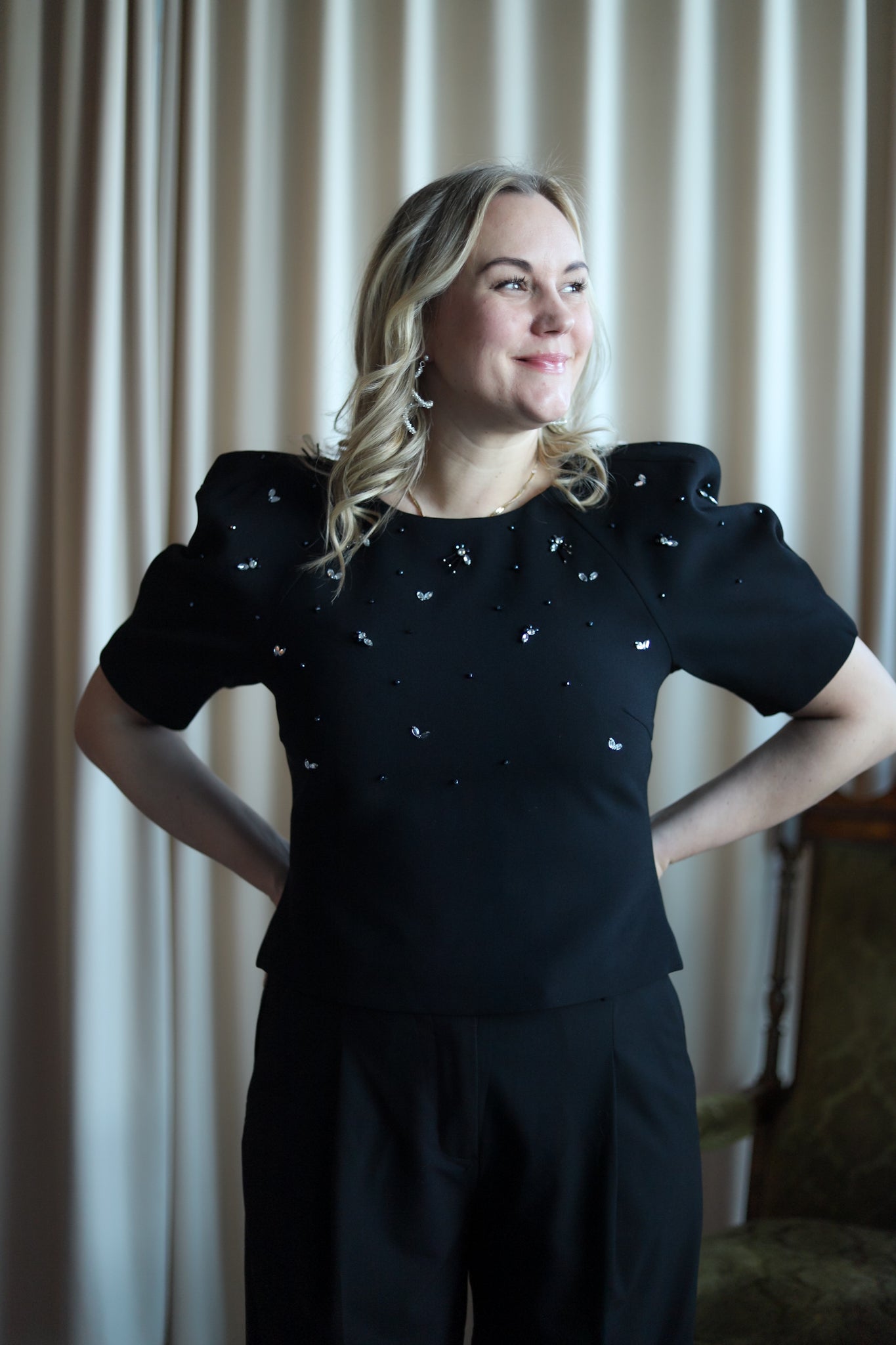 Feminin topp i klassisk sort med lekre detaljer fra Camilla Pihl. Tettsittende modell med rund hals og korte voluminøse ermer. En meget flatterende topp med nett lengde. Overdelen er dekorert i delikate stener. Nydelig topp til hverdags og sesongens festligheter.