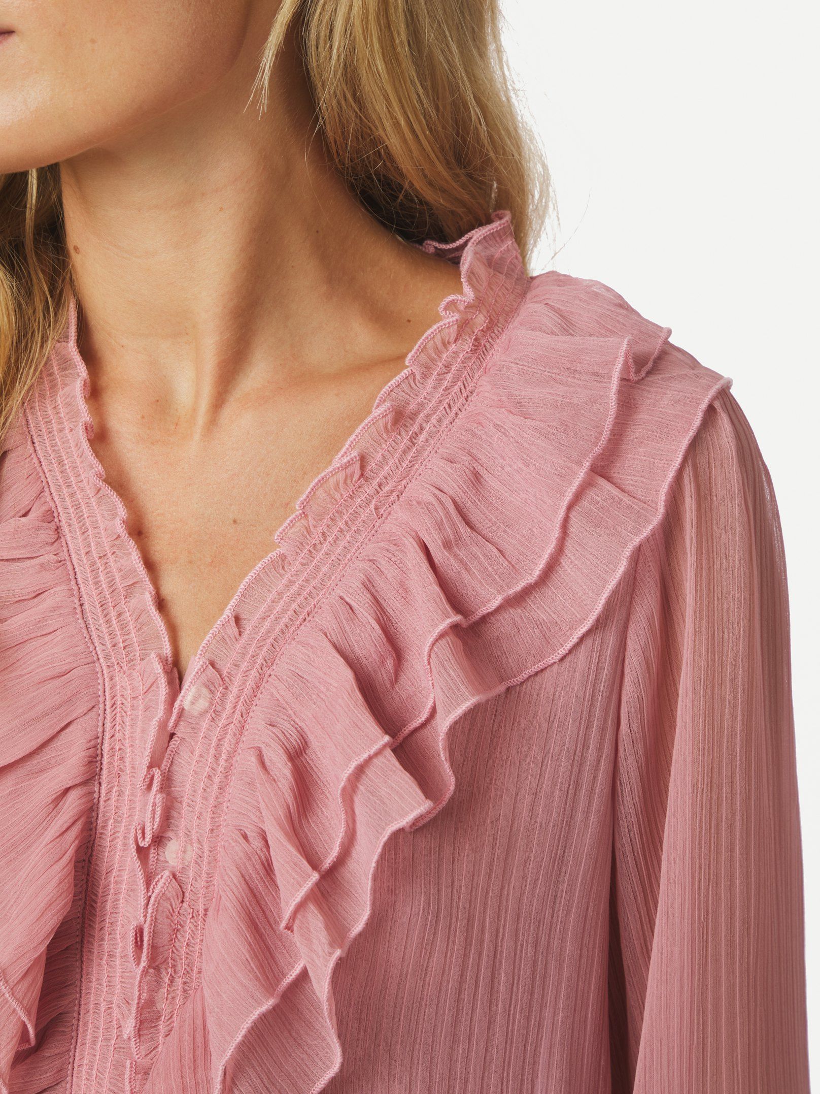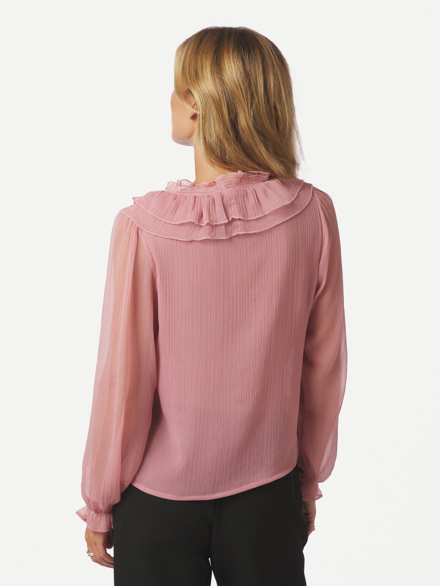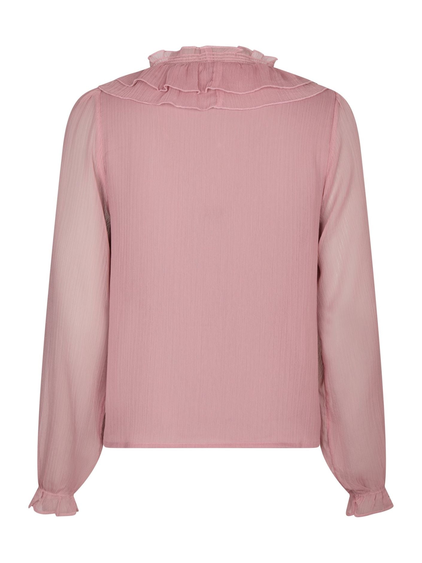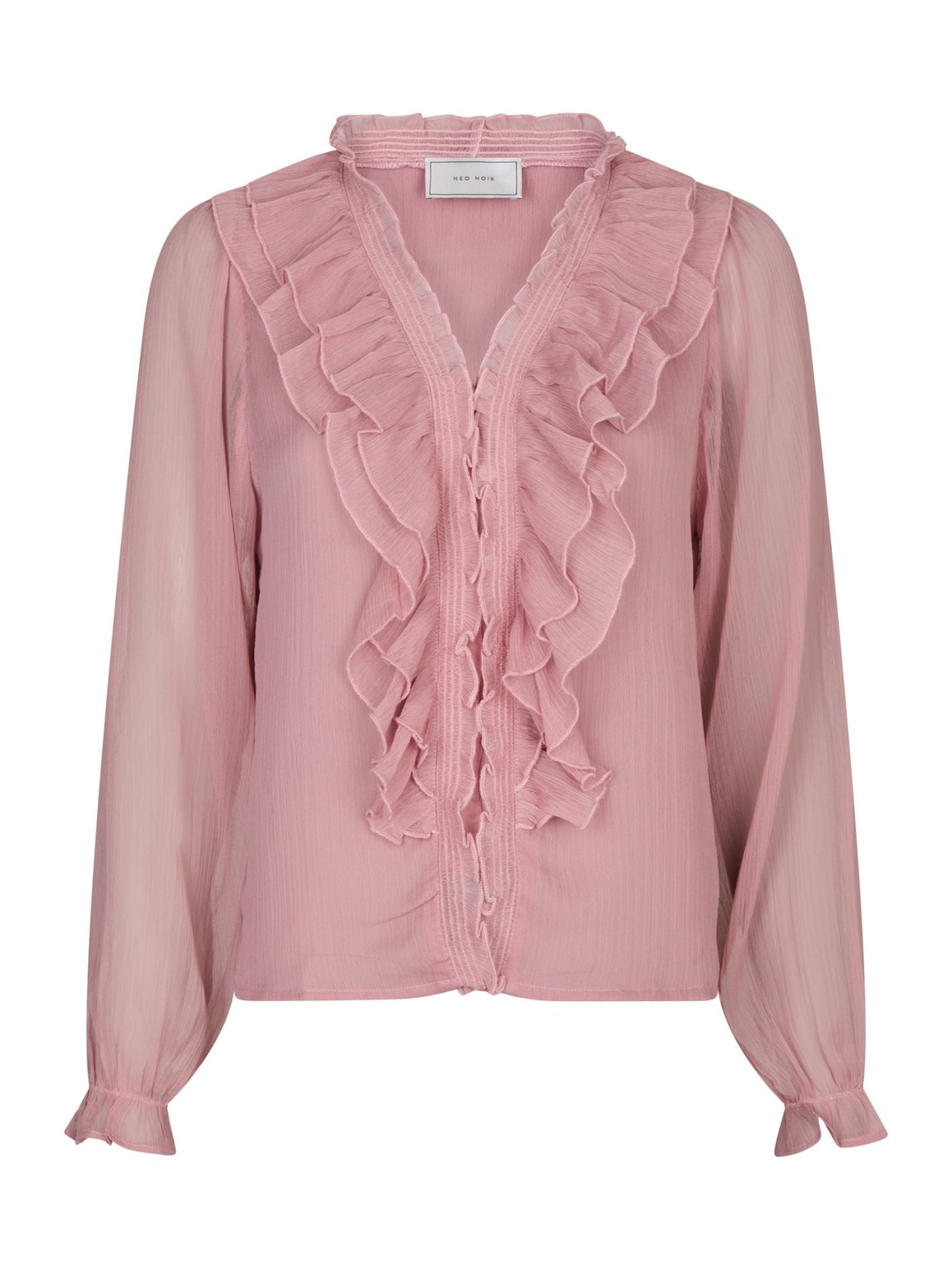 Nydelig chiffon-bluse i lys rosa fra Neo Noir. Modellen er rett med V-hals og lange transparente ermer med elastisk mansjett. Blusen lukkes med små knapper og har delikate volanger langs halsen og fronten. En vinner til hverdags og fest.