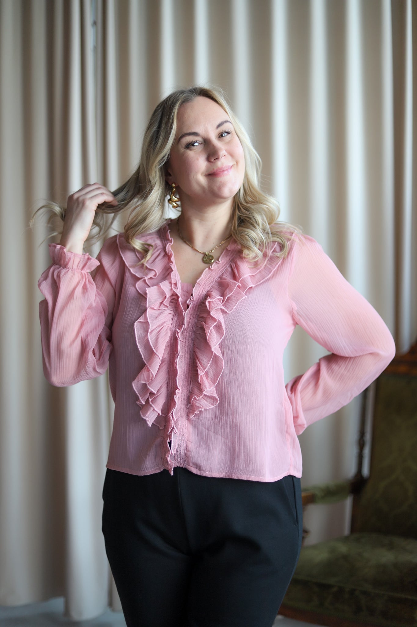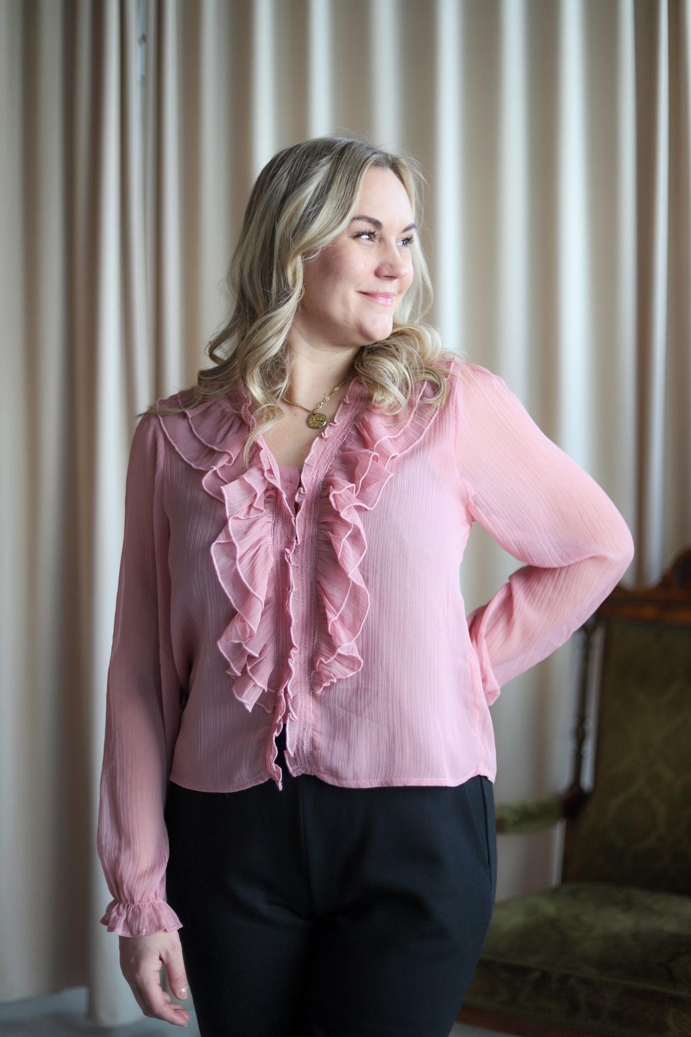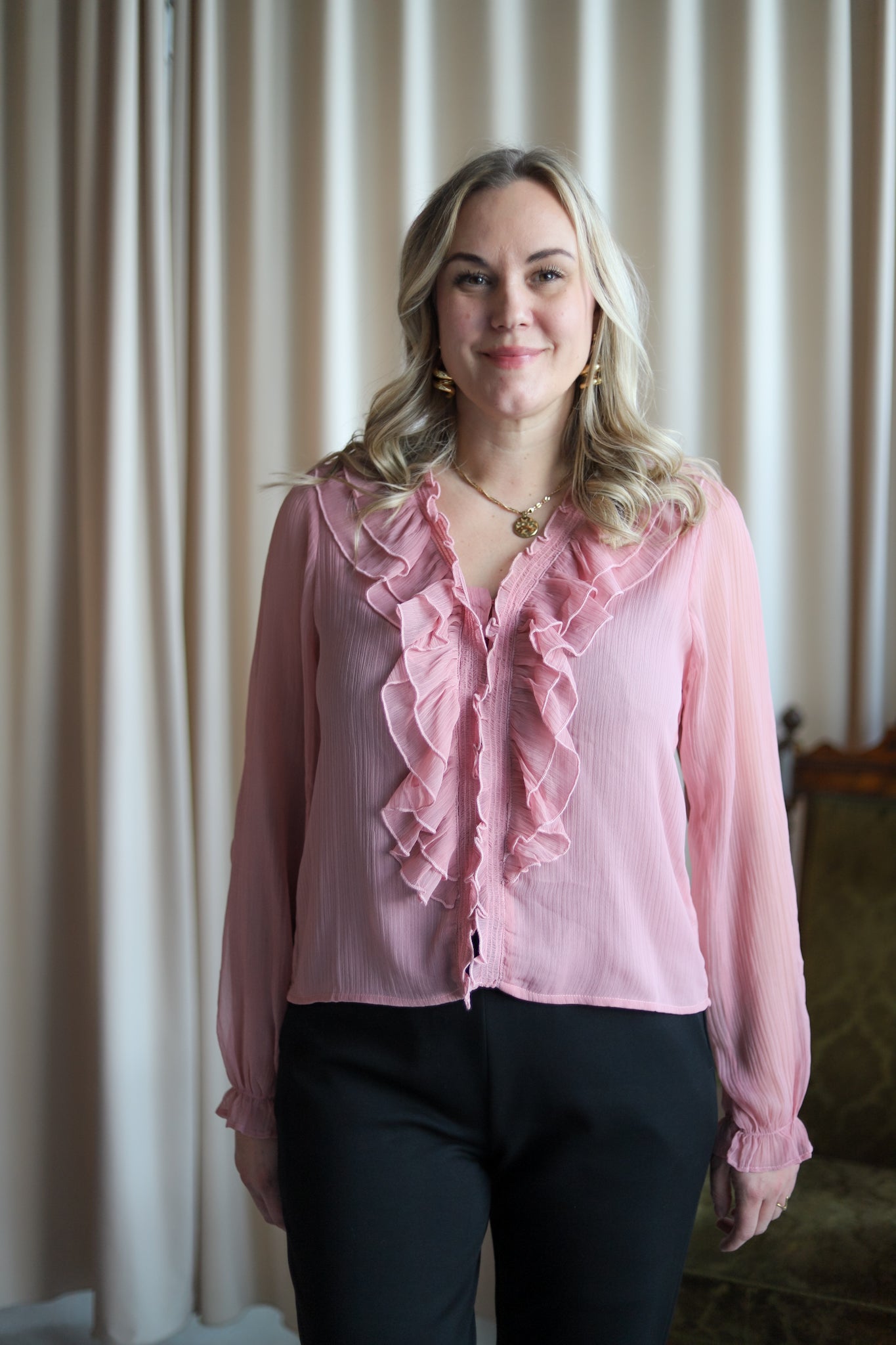 Nydelig chiffon-bluse i lys rosa fra Neo Noir. Modellen er rett med V-hals og lange transparente ermer med elastisk mansjett. Blusen lukkes med små knapper og har delikate volanger langs halsen og fronten. En vinner til hverdags og fest.