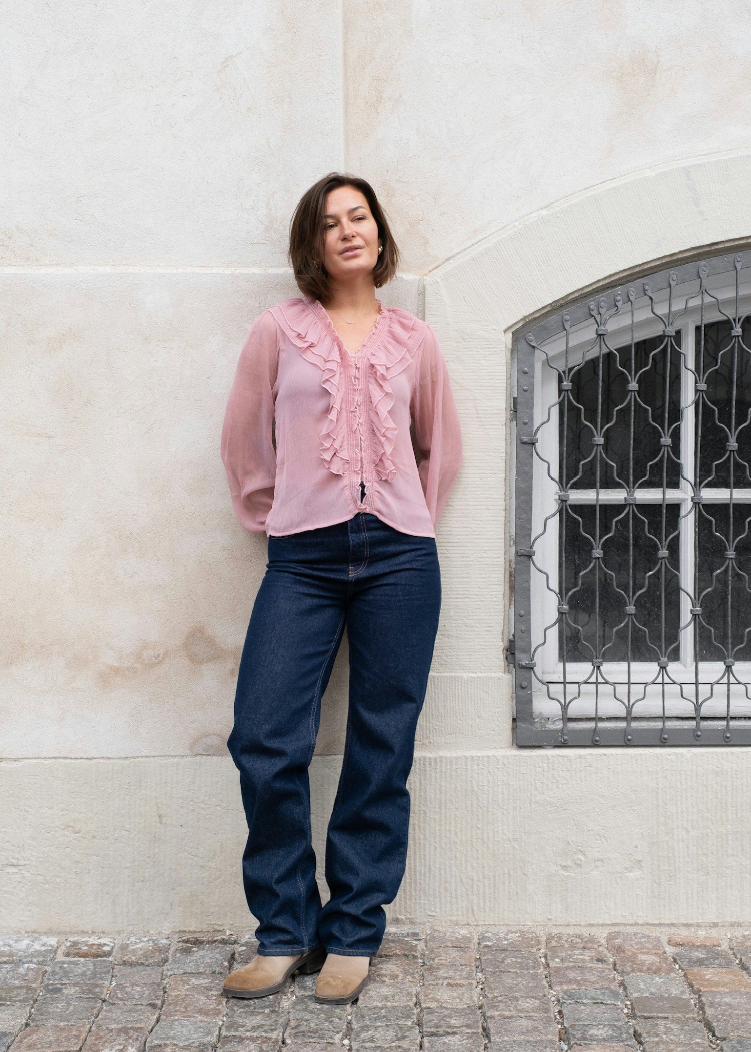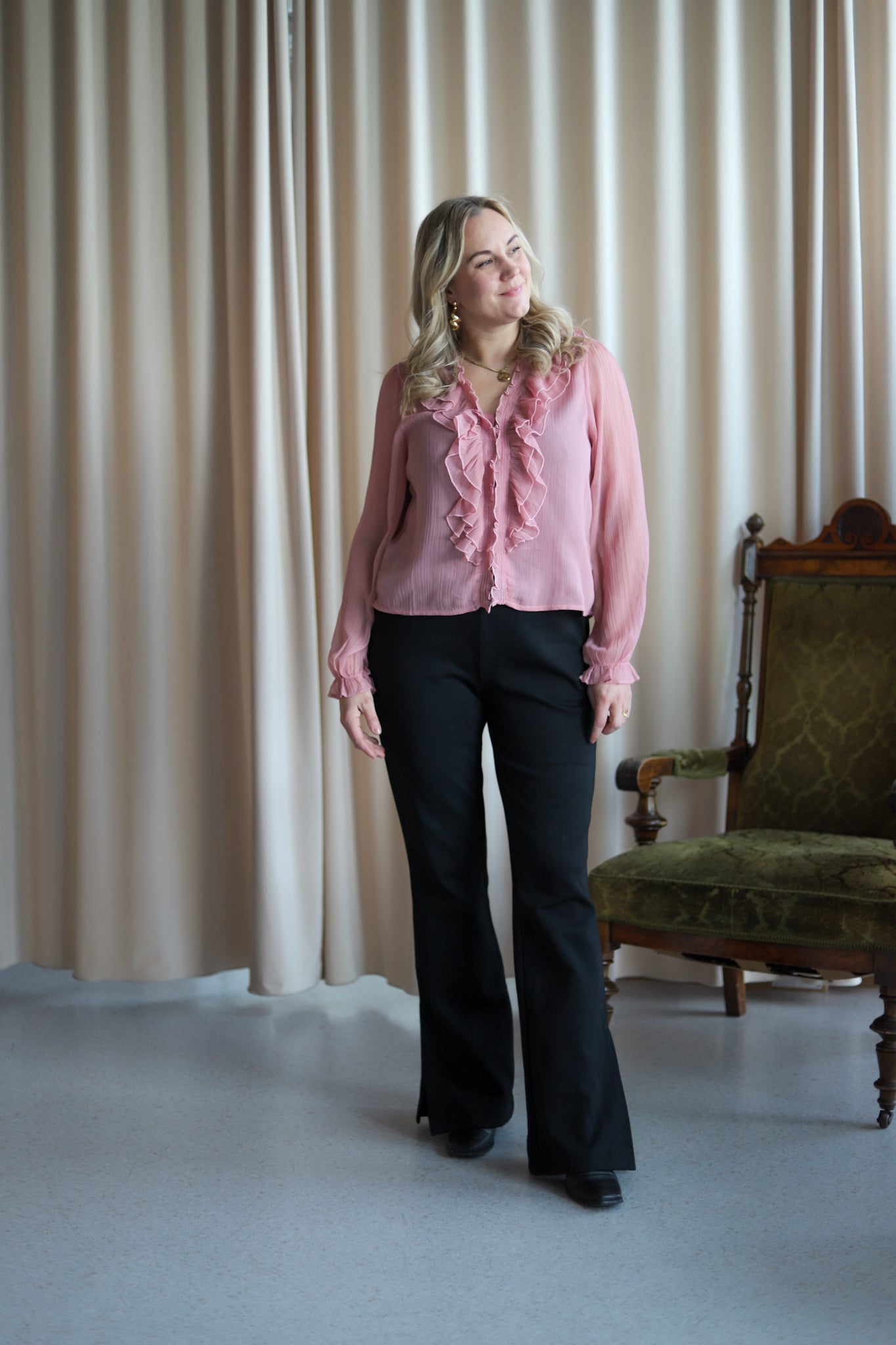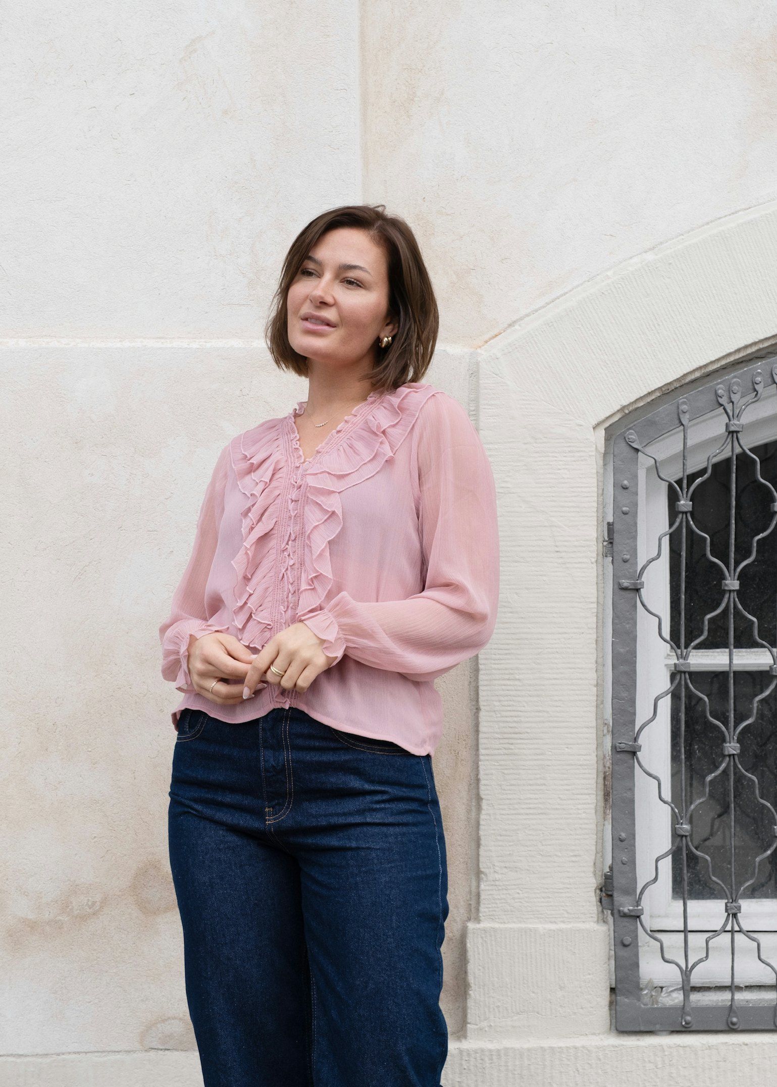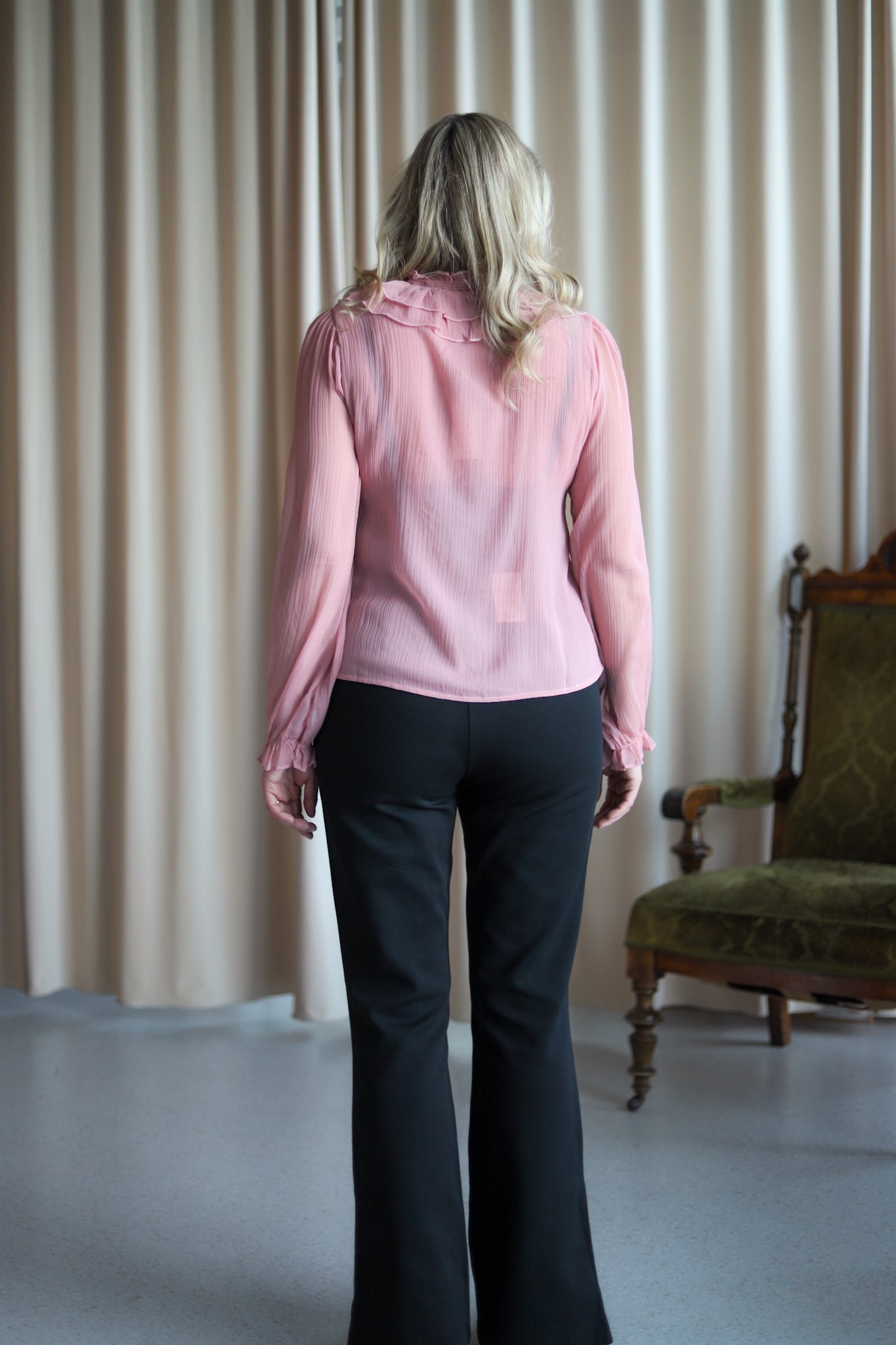 Nydelig chiffon-bluse i lys rosa fra Neo Noir. Modellen er rett med V-hals og lange transparente ermer med elastisk mansjett. Blusen lukkes med små knapper og har delikate volanger langs halsen og fronten. En vinner til hverdags og fest.