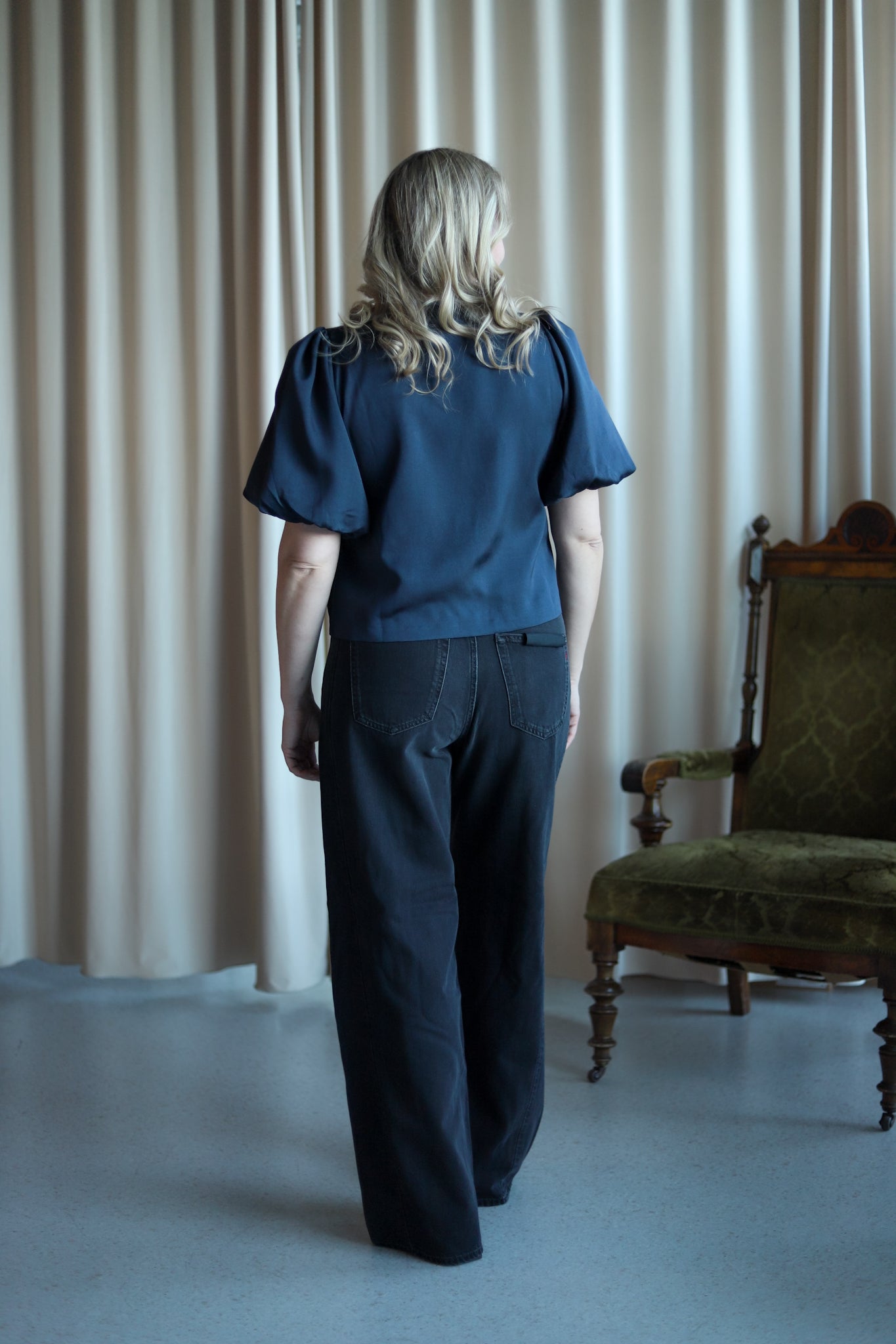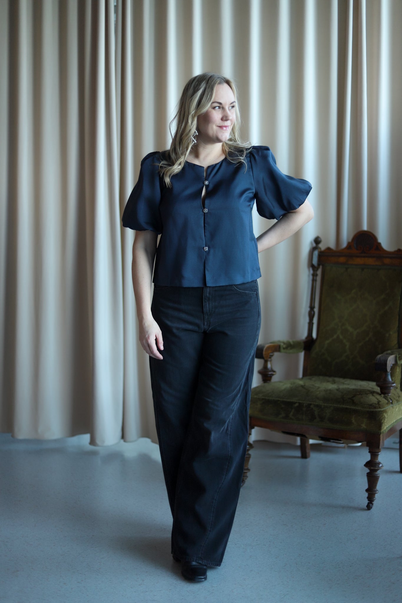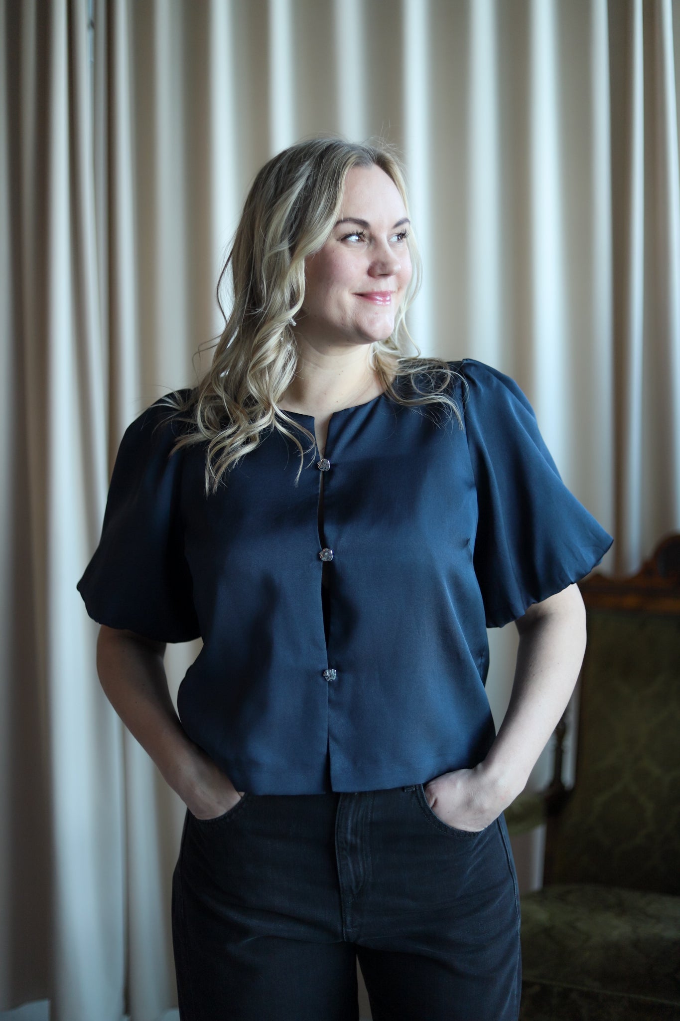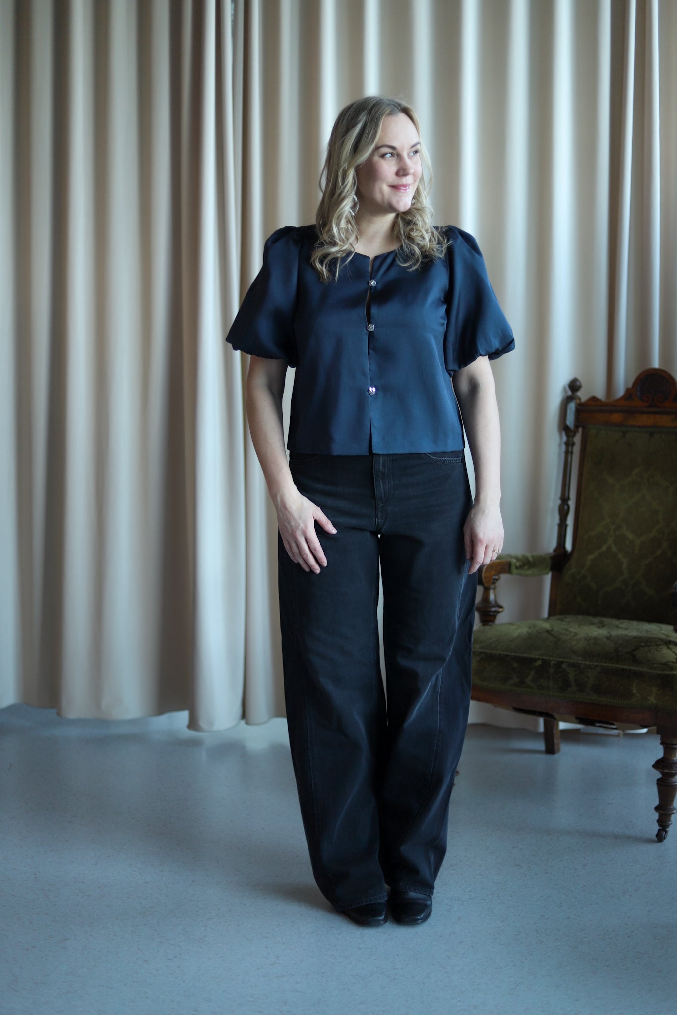 Nydelig satengbluse i mørk blå fra Neo Noir. Modellen er rett med nett lengde og rund hals. Korte ermer med feminin puff i skuldre og elastisk mansjett. Delikat knappestolpe i front med dekorative knapper i sølv. En lekker bluse som lett kan pyntes opp eller ned etter anledning.