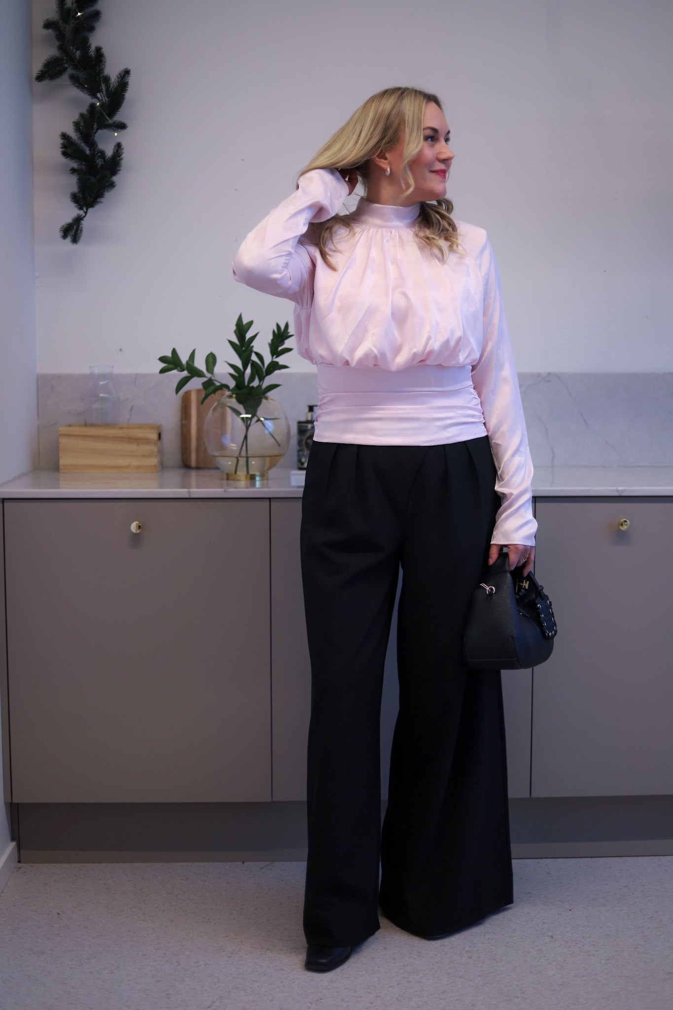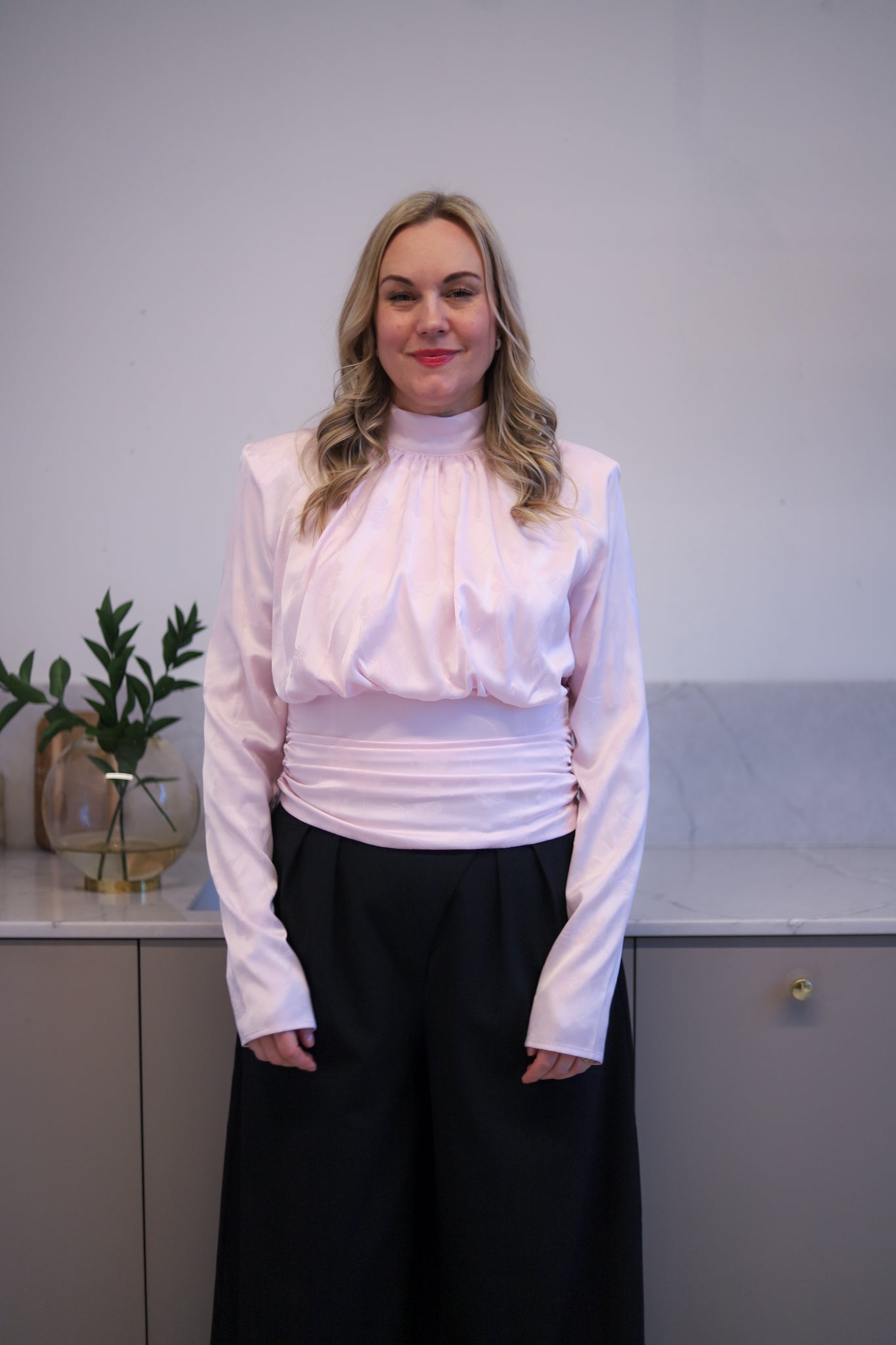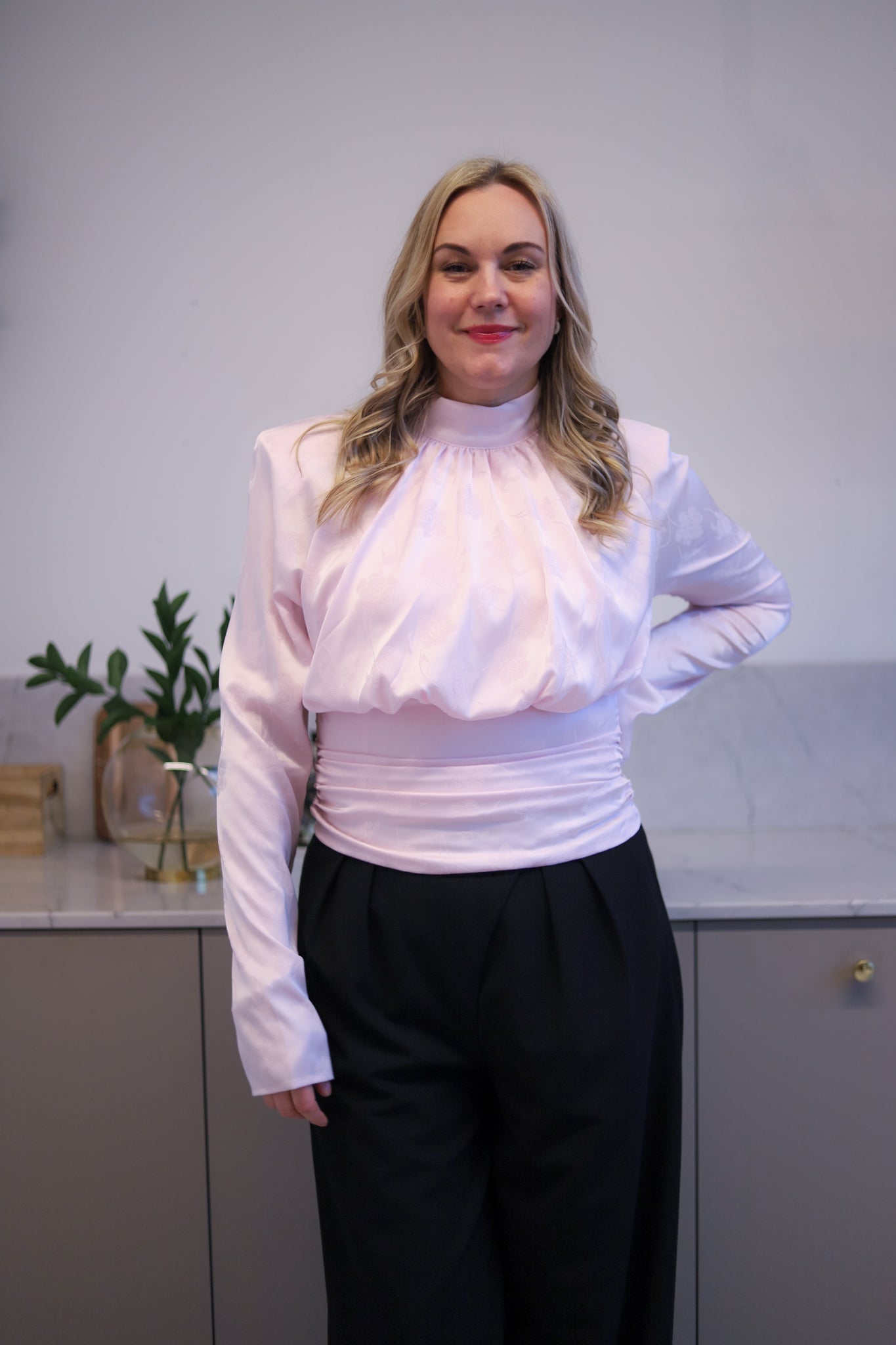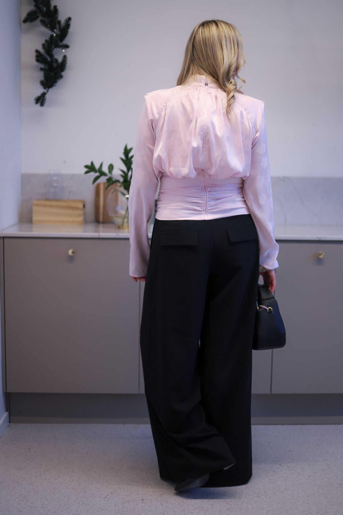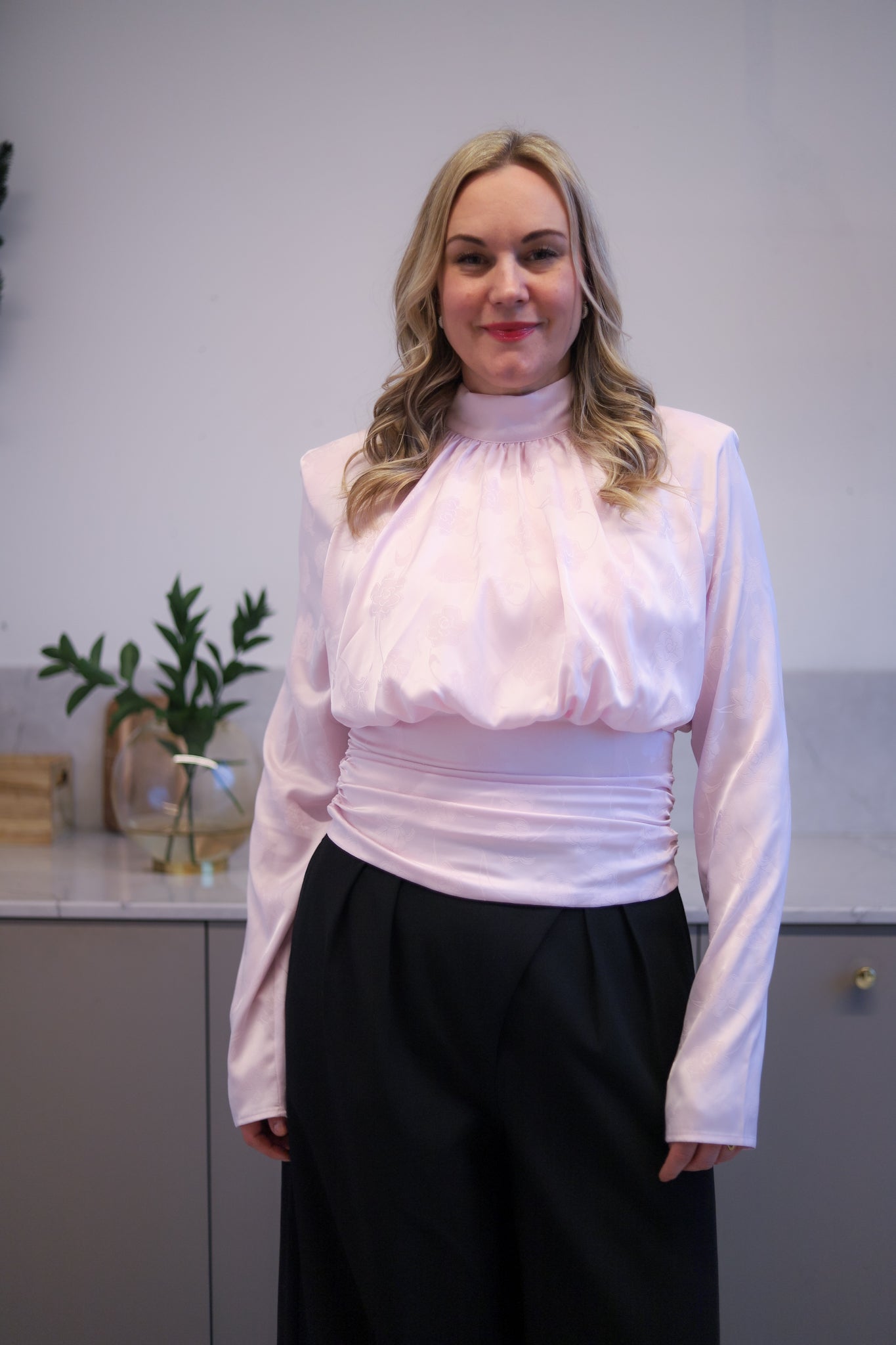 Stilig topp i lys rosa med ton-i-ton print fra Rotate. Modellen er tettsittene i midjen med volum i overdelen og høy hals. Toppen har lekre draperinger med lange raglanermer som smalner inn mot mansjett. Lukkes med glidelås i ryggen. Nydelig til både, jeans, skjørt og dressbukser.