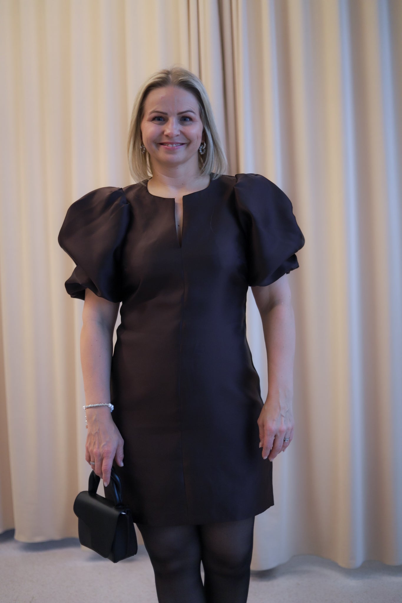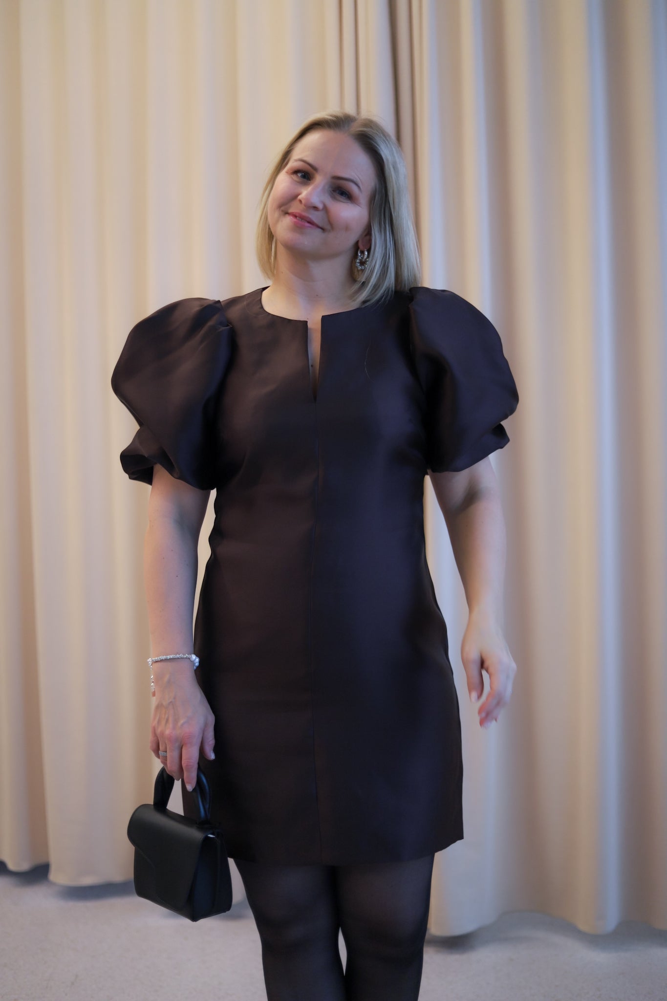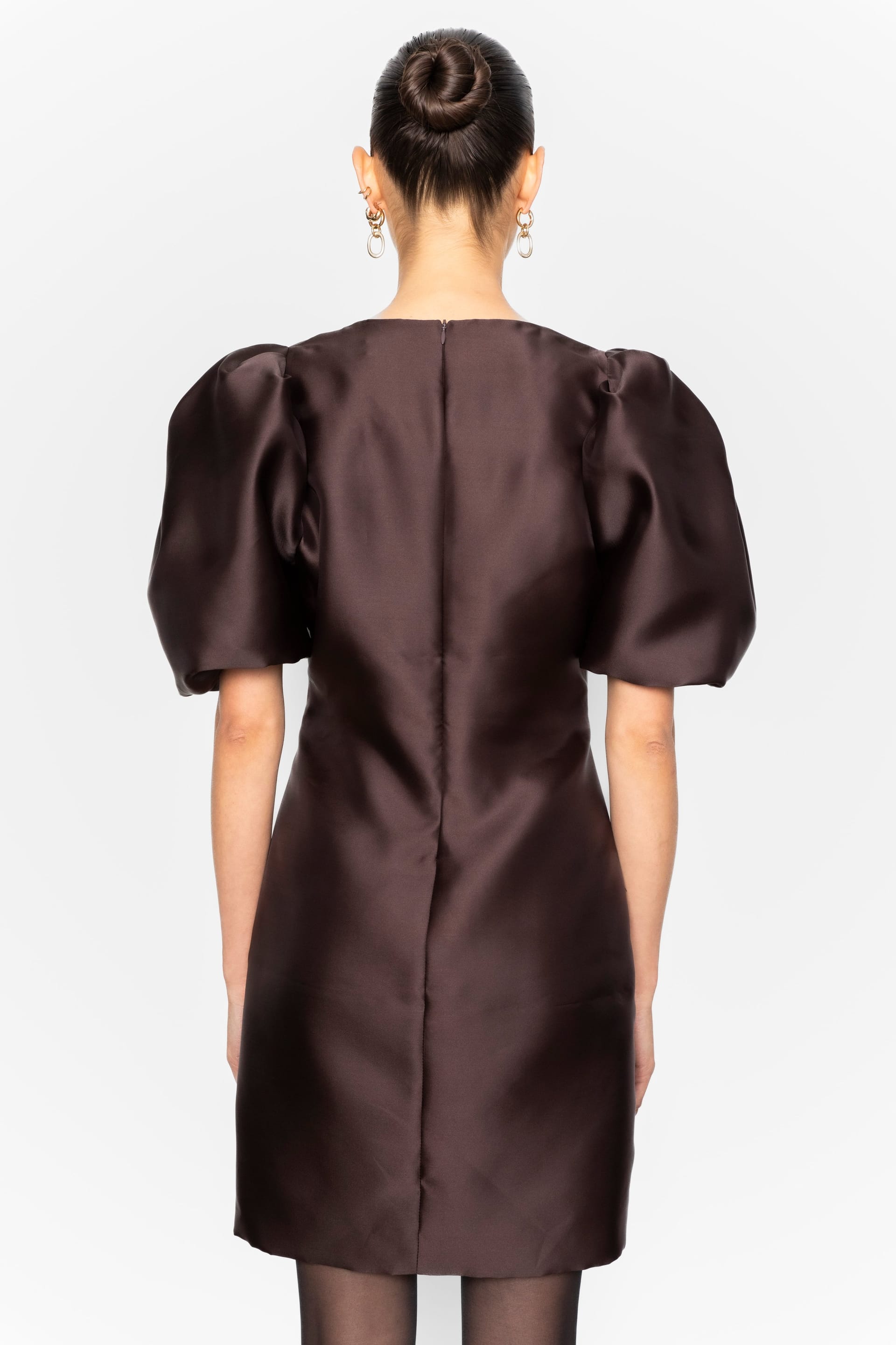 Nydelig minikjole i sesongens lekreste brunfarge med shiny kvalitet fra Camilla Pihl. Tettsittende modell med smal V-hals og voluminøse, korte ermer. En meget flatterende kjole med lengde til midt på låret. Perfekt til sesongens festligheter.