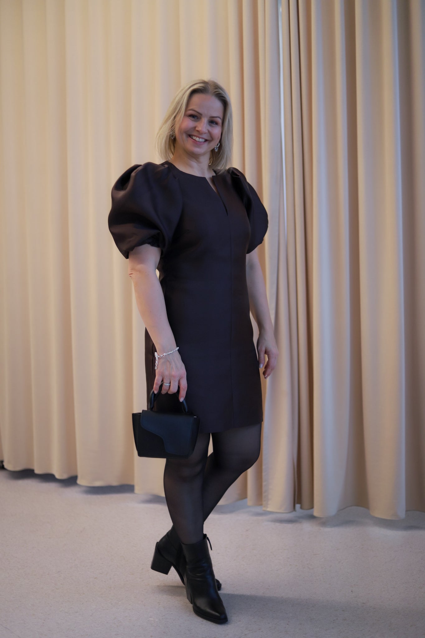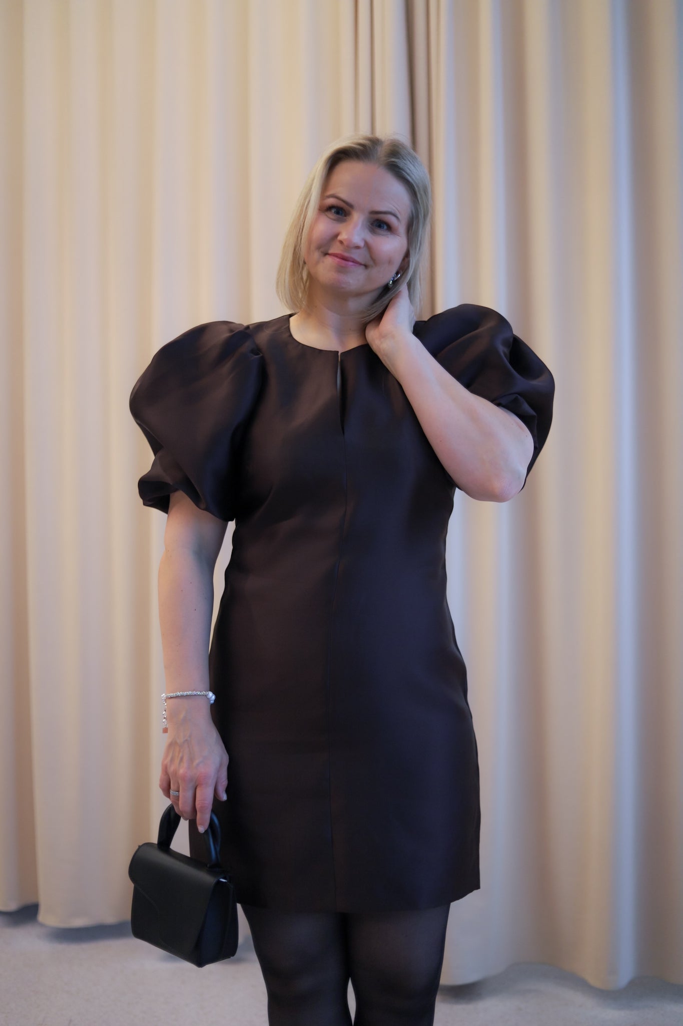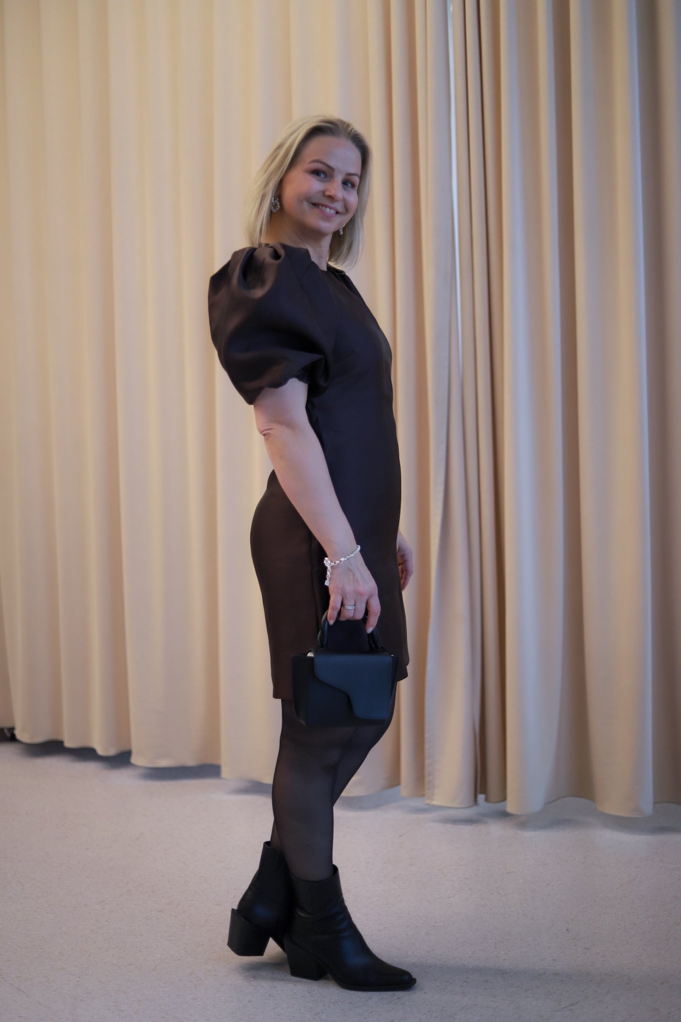 Nydelig minikjole i sesongens lekreste brunfarge med shiny kvalitet fra Camilla Pihl. Tettsittende modell med smal V-hals og voluminøse, korte ermer. En meget flatterende kjole med lengde til midt på låret. Perfekt til sesongens festligheter.