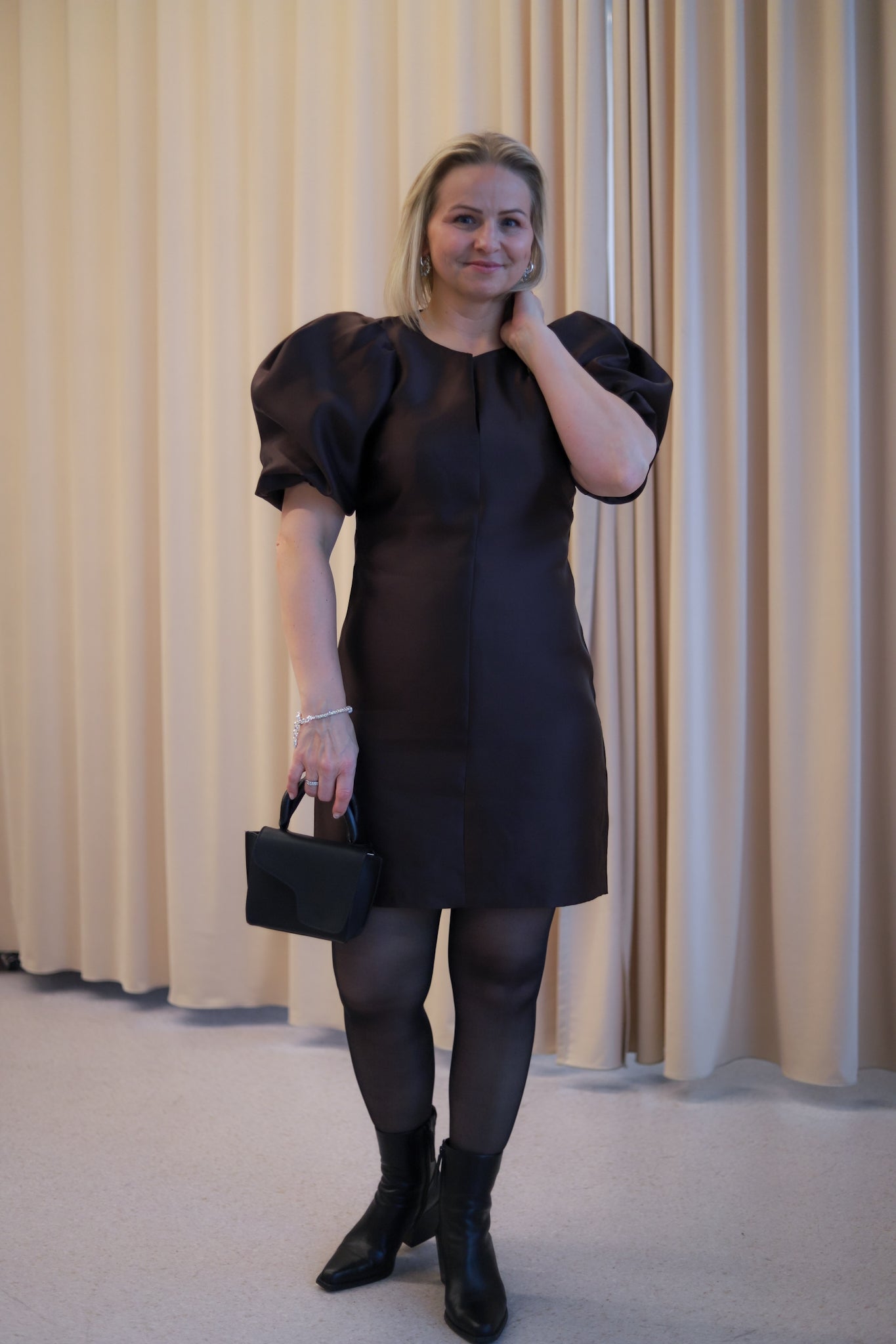 Normal på størrelsen. Malin er 163 cm og har på seg størrelse 38, modellen er 176 cm og har på seg størrelse 36.