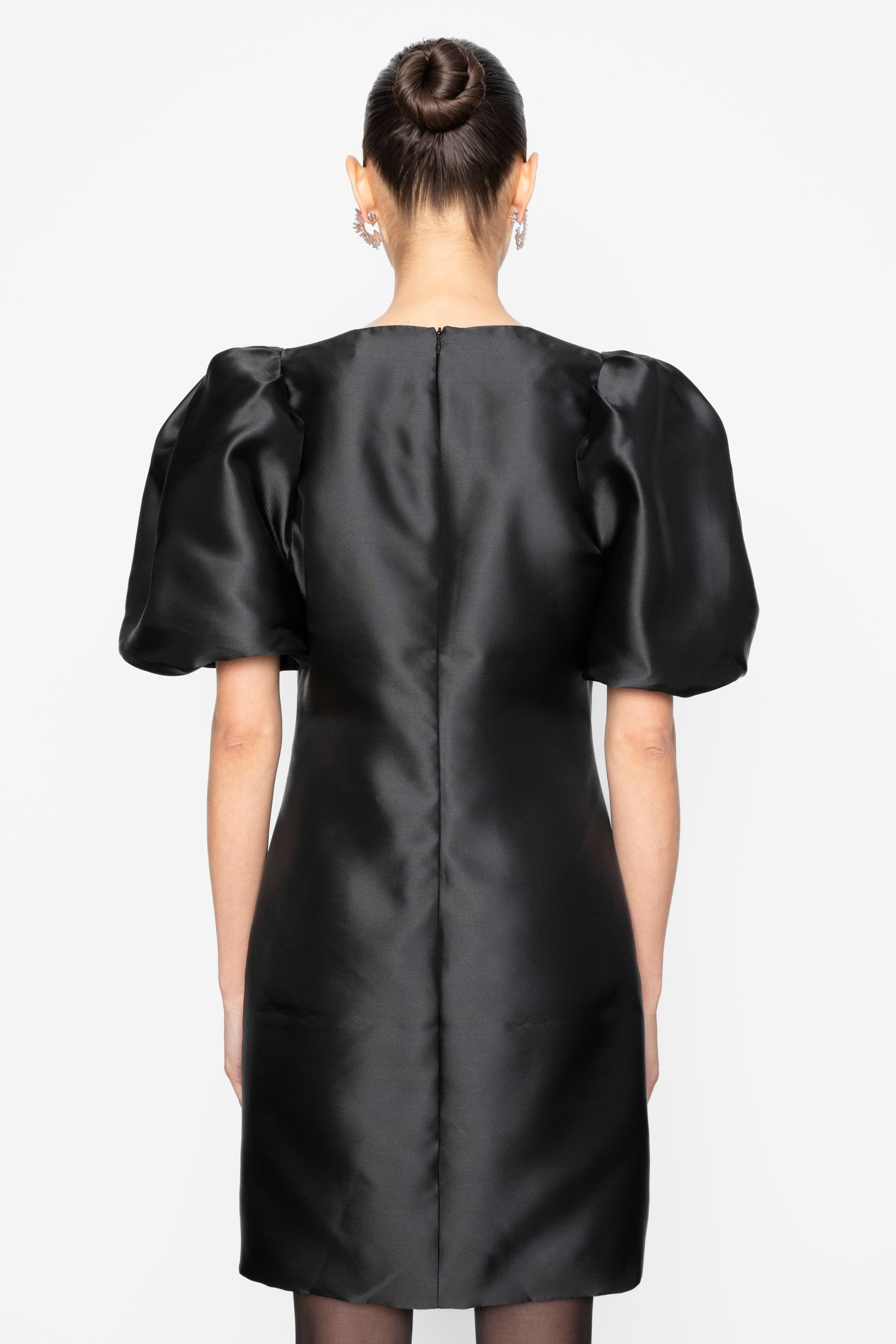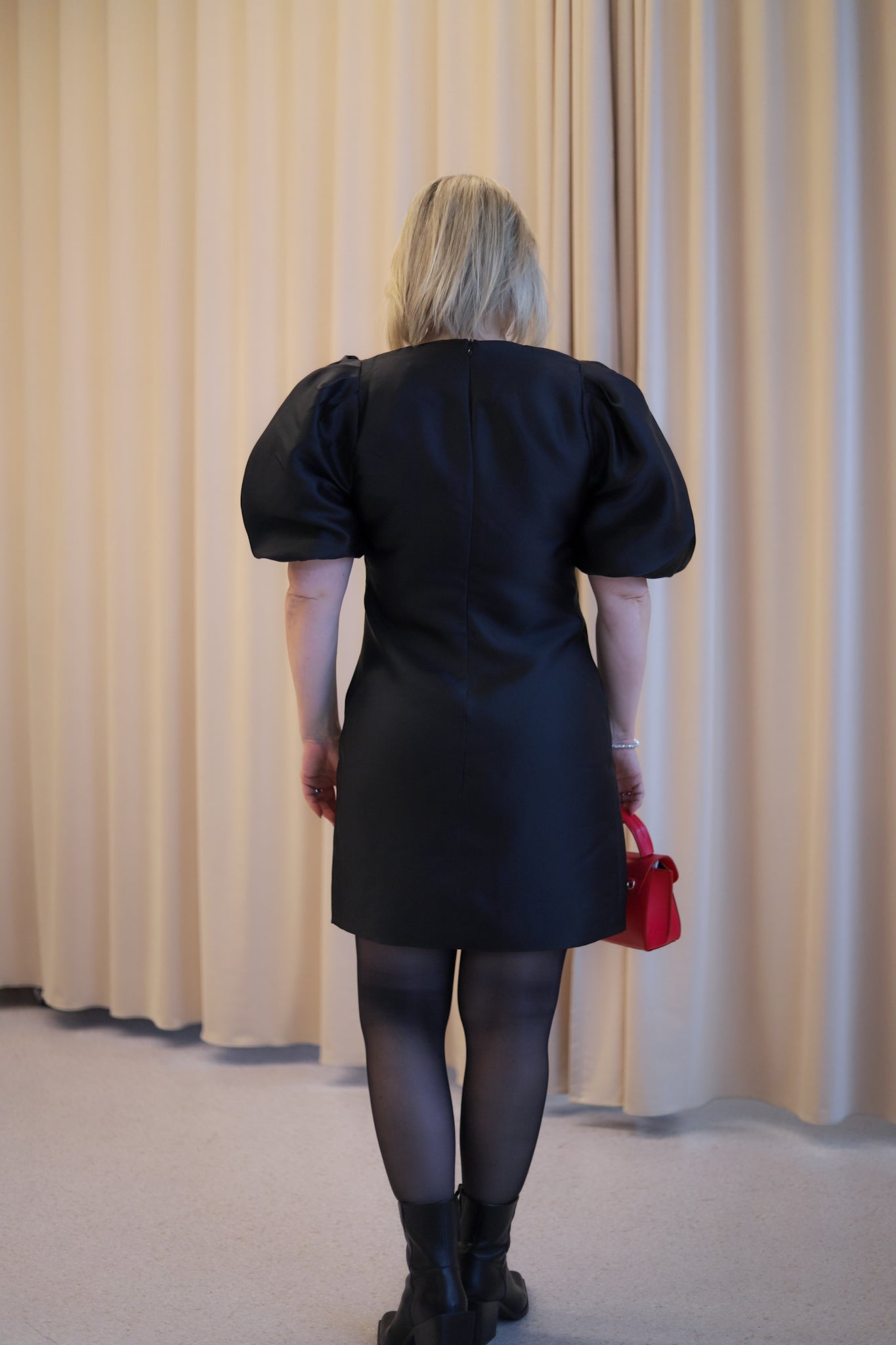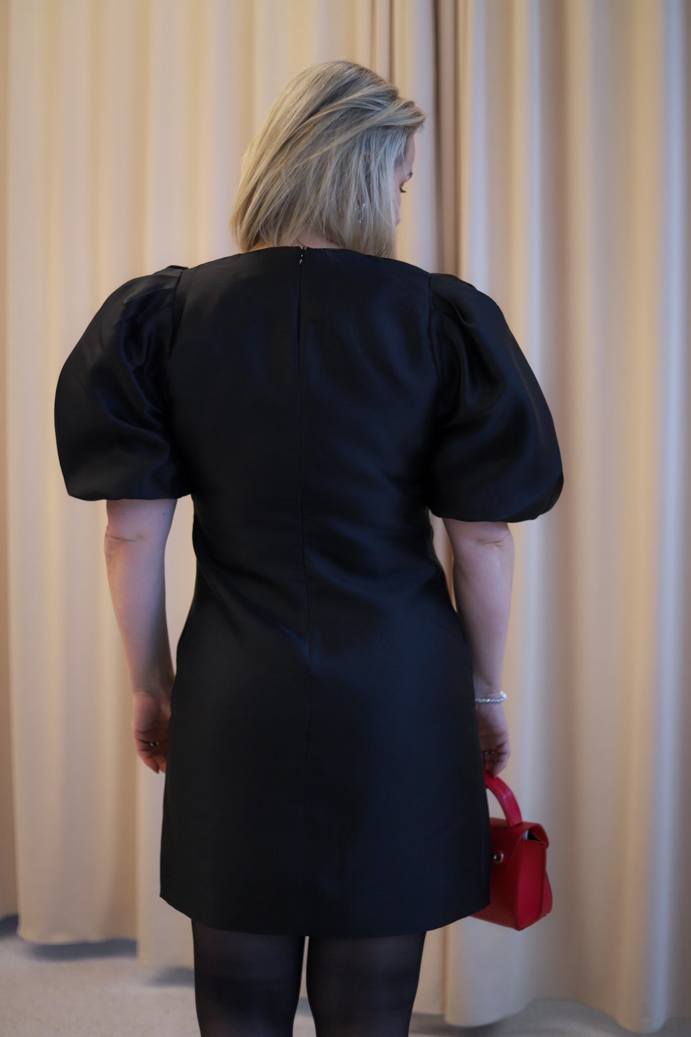 Nydelig minikjole i klassisk sort med shiny kvalitet fra Camilla Pihl. Tettsittende modell med smal V-hals og voluminøse, korte ermer. En meget flatterende kjole med lengde til midt på låret. Perfekt til sesongens festligheter.