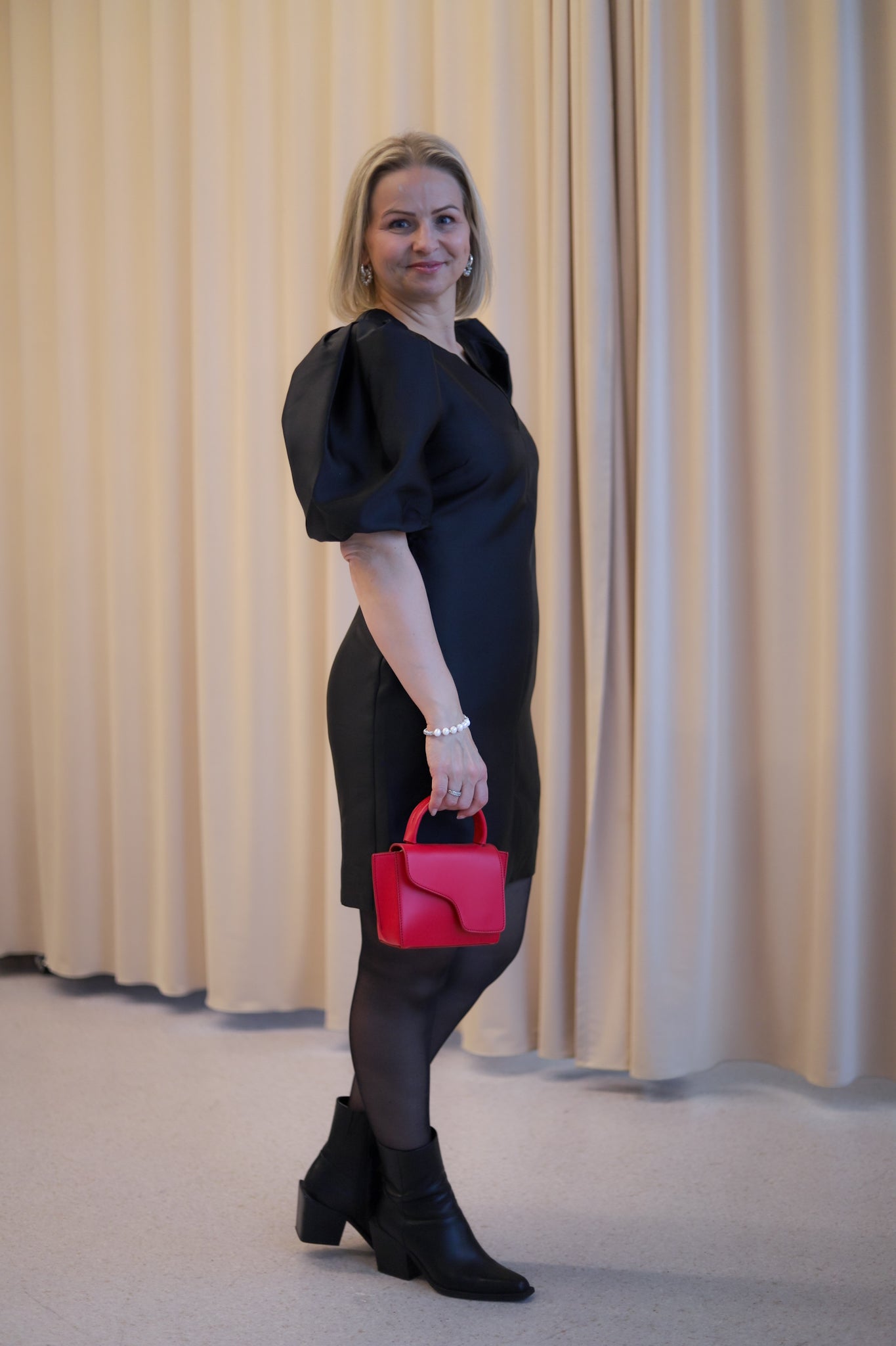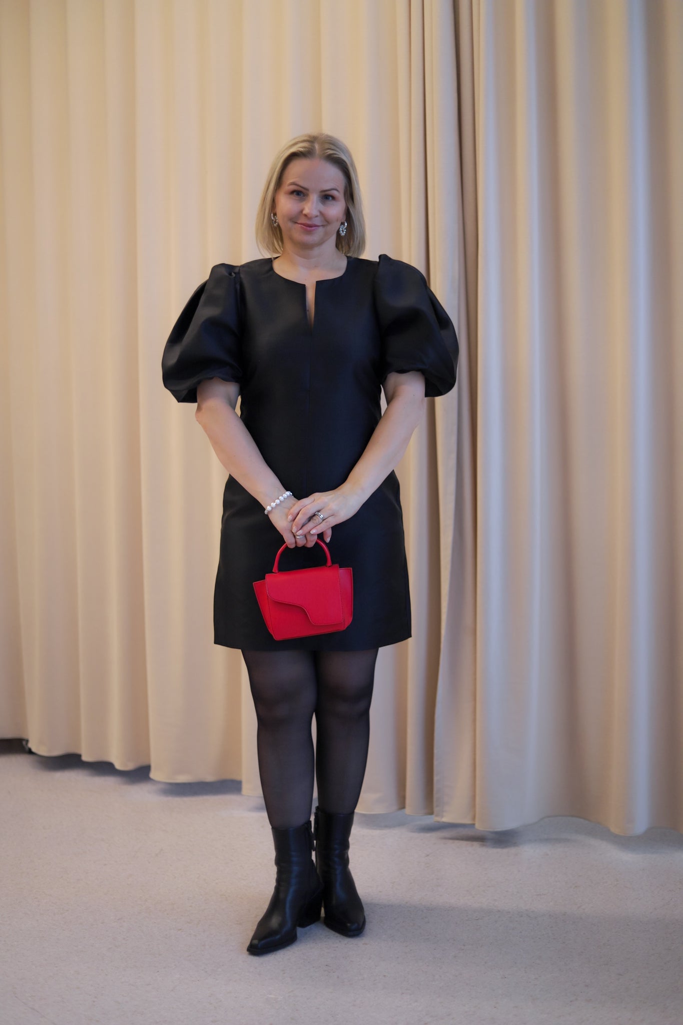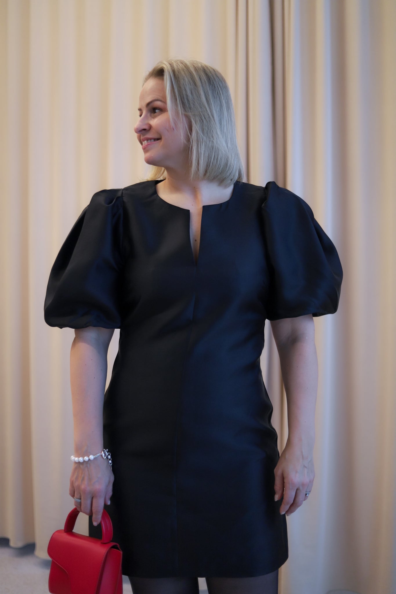 Nydelig minikjole i klassisk sort med shiny kvalitet fra Camilla Pihl. Tettsittende modell med smal V-hals og voluminøse, korte ermer. En meget flatterende kjole med lengde til midt på låret. Perfekt til sesongens festligheter.
