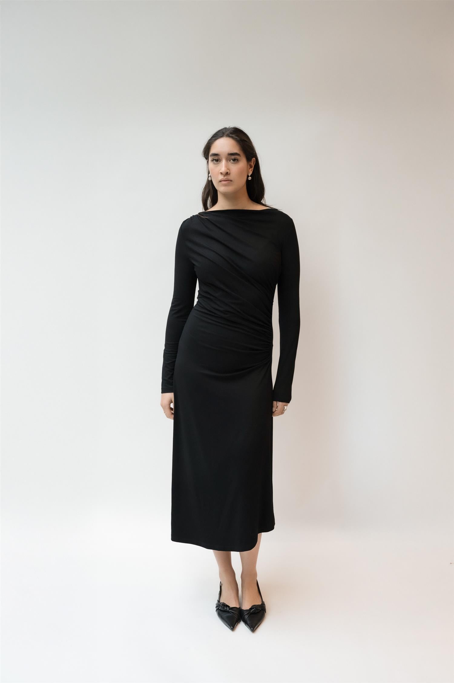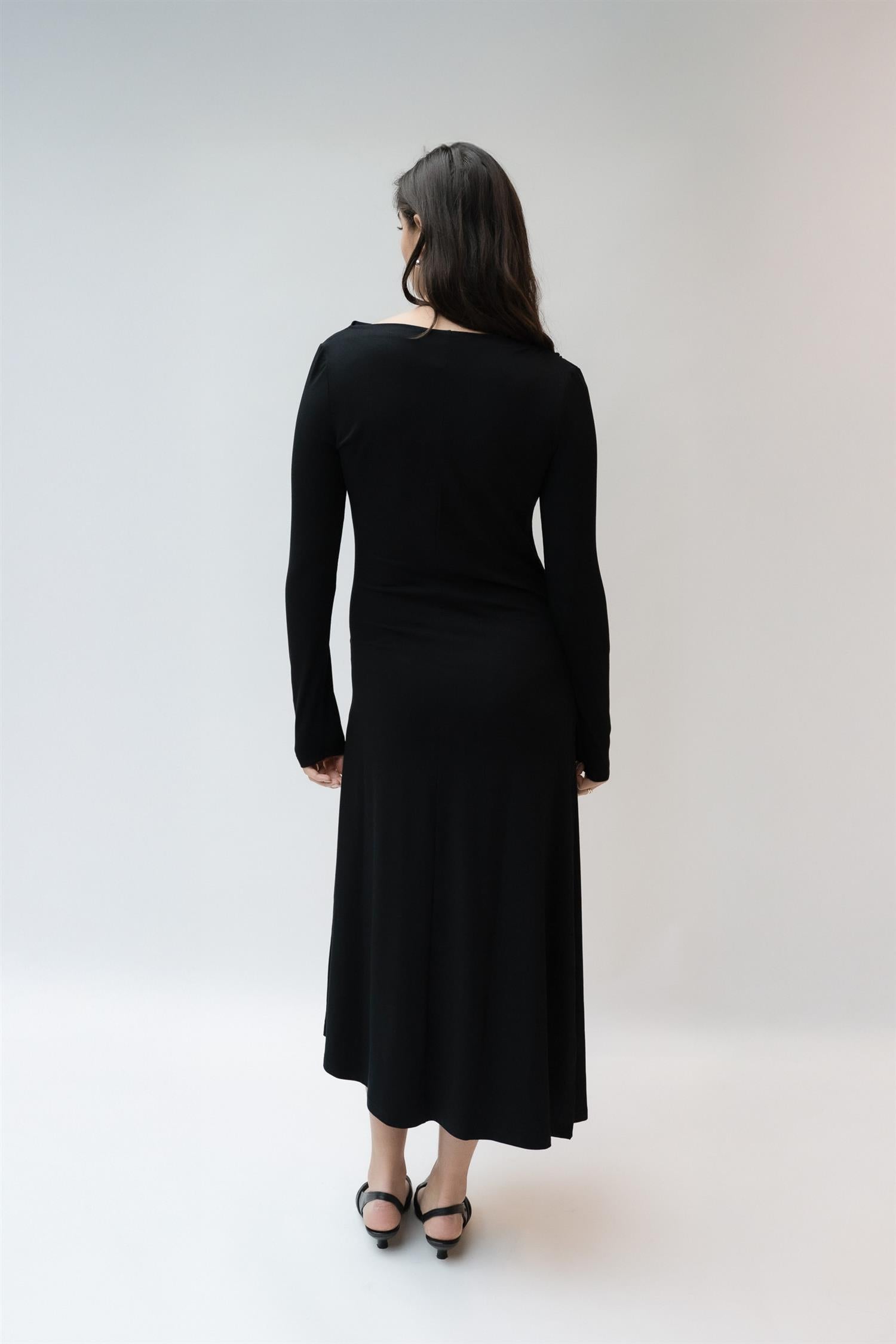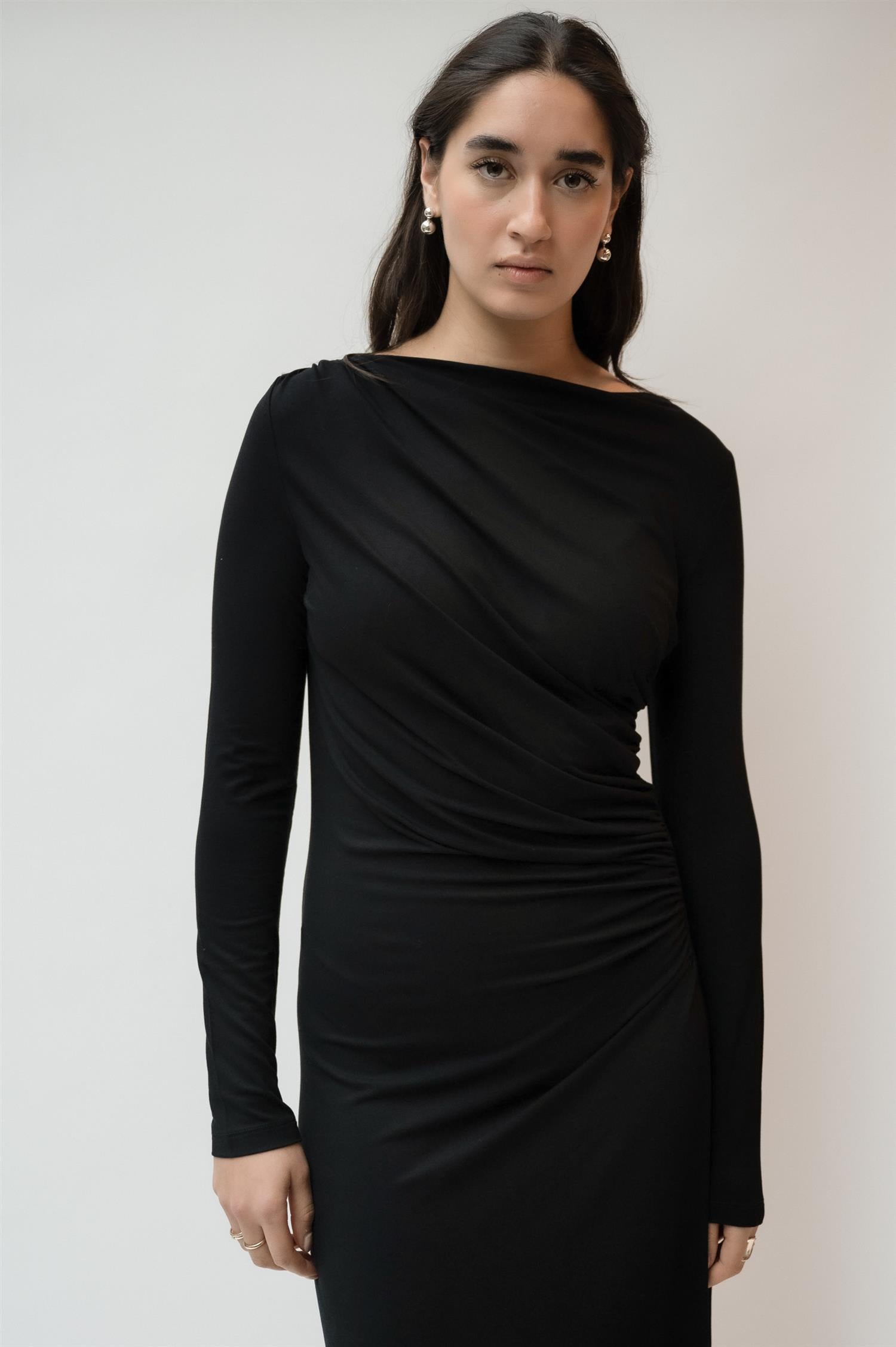 Elegant midikjole i klassisk sort fra Viveh. Modellen er tettsittende med lange ermer og en bred båthals for en flatterende silhuett. Den har delikate draperinger over brystet, og faller løst fra hoftene for et avslappet, men likevel skredersydd look. Laget i Viveh sin signatur ECOVERO™ viskosejersey, som gir en myk følelse med fast struktur og naturlig støtte. Perfekt kjole for både hverdagsbruk og festlige anledninger.
