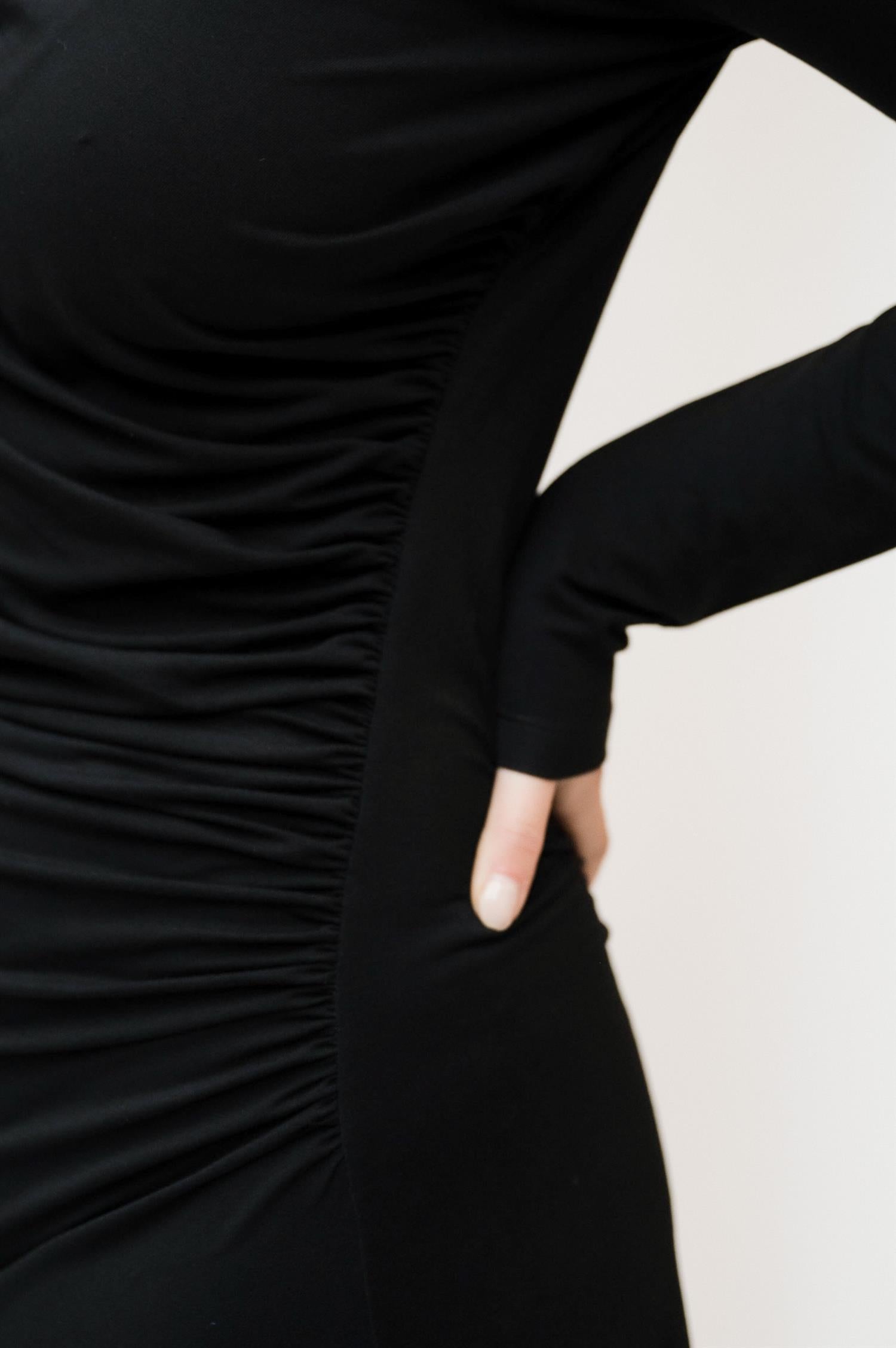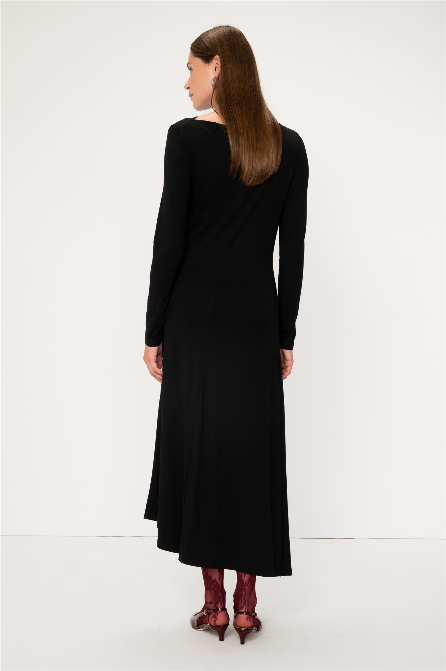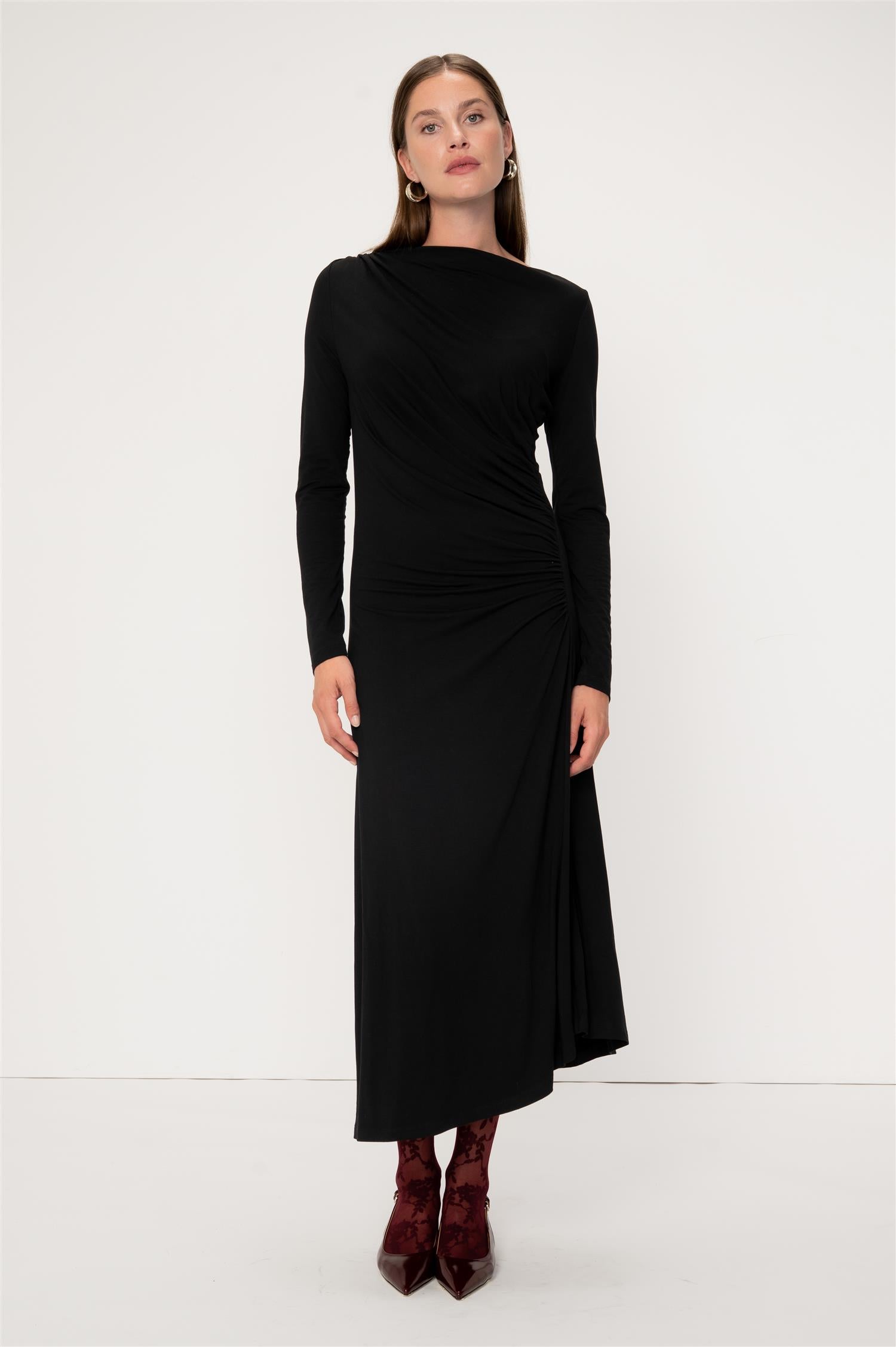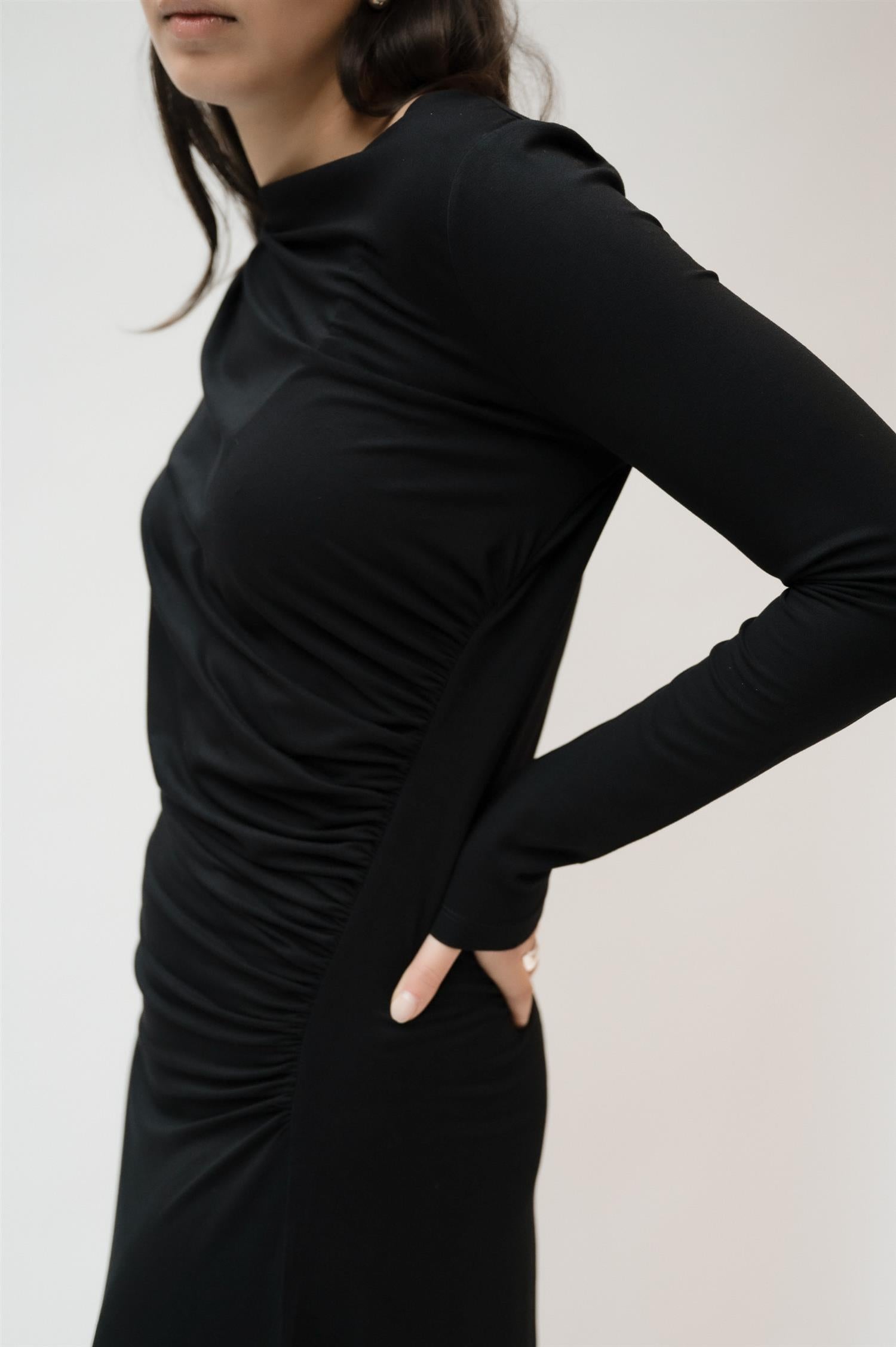 Elegant midikjole i klassisk sort fra Viveh. Modellen er tettsittende med lange ermer og en bred båthals for en flatterende silhuett. Den har delikate draperinger over brystet, og faller løst fra hoftene for et avslappet, men likevel skredersydd look. Laget i Viveh sin signatur ECOVERO™ viskosejersey, som gir en myk følelse med fast struktur og naturlig støtte. Perfekt kjole for både hverdagsbruk og festlige anledninger.