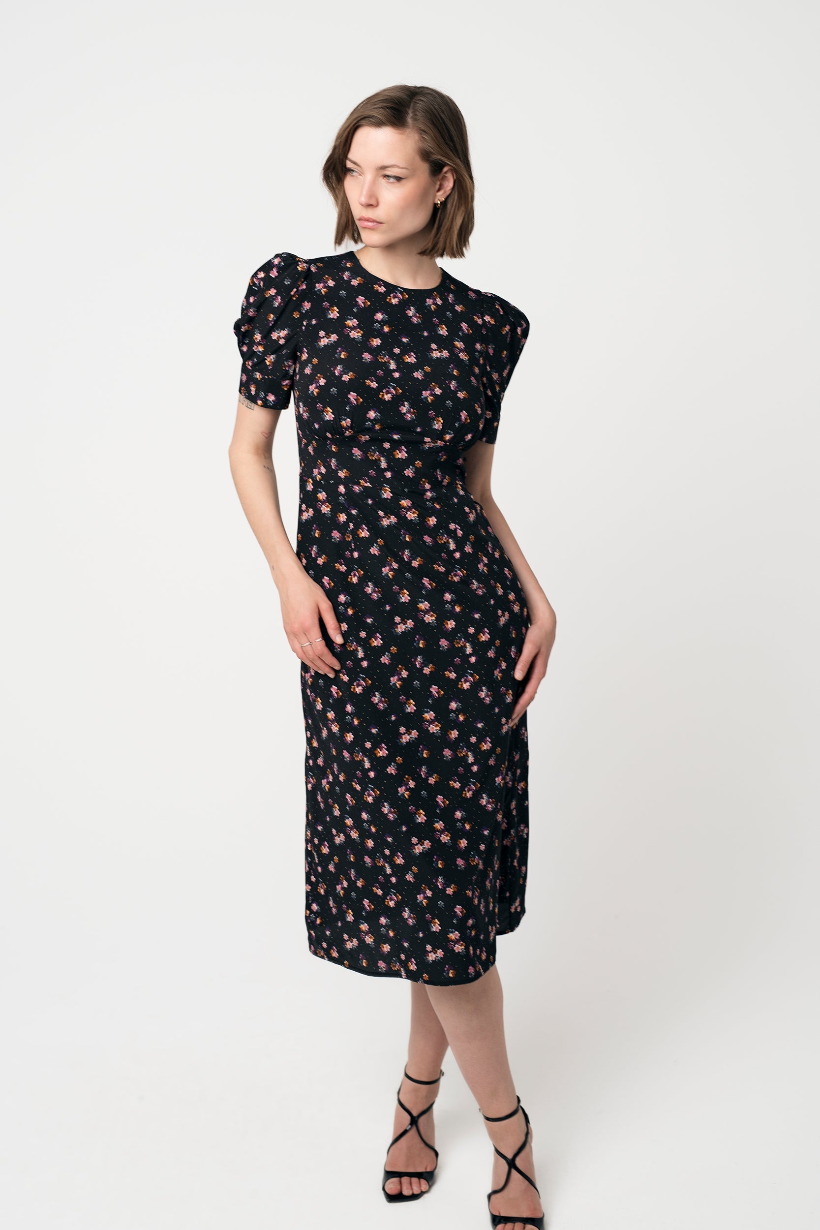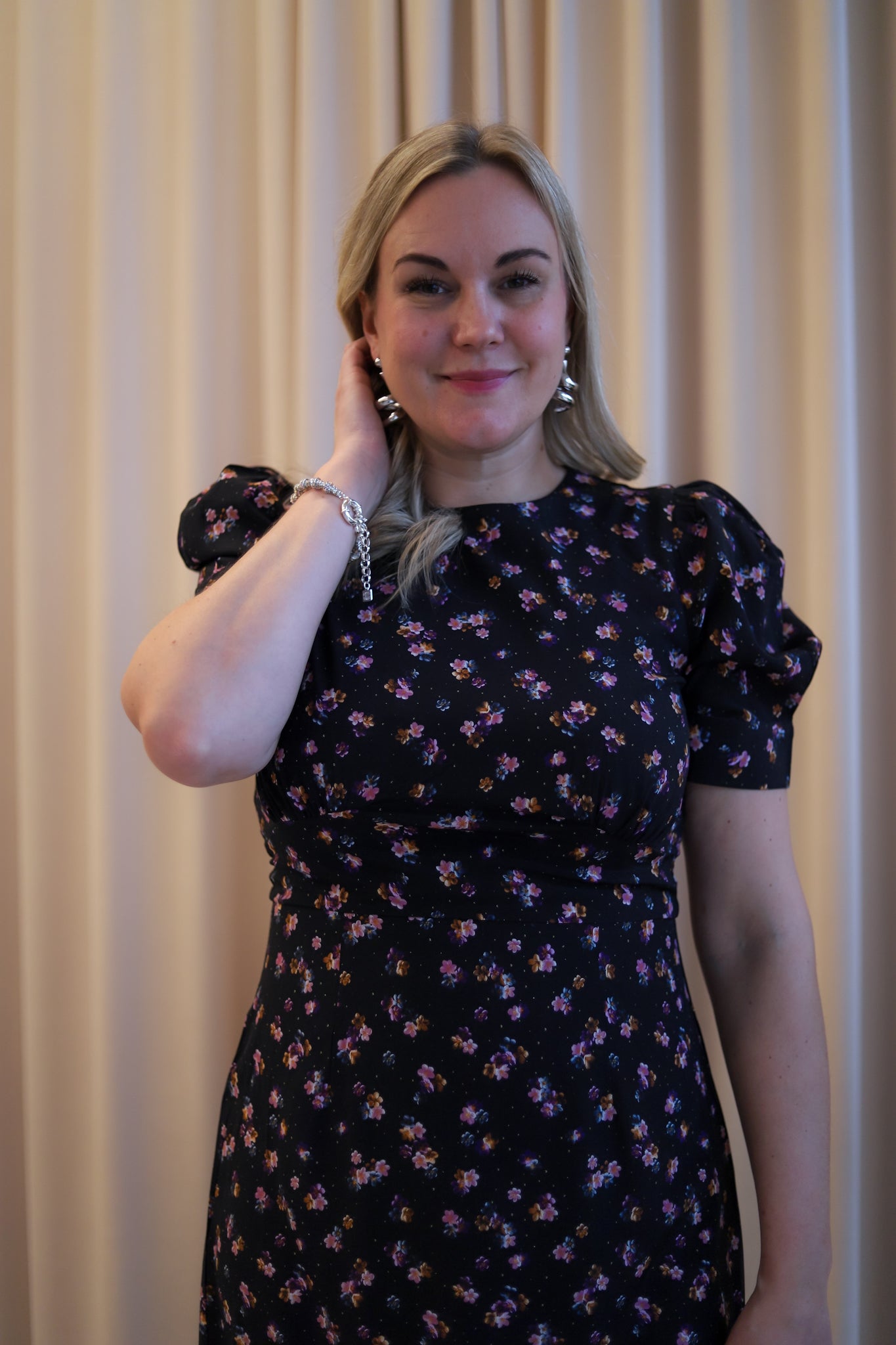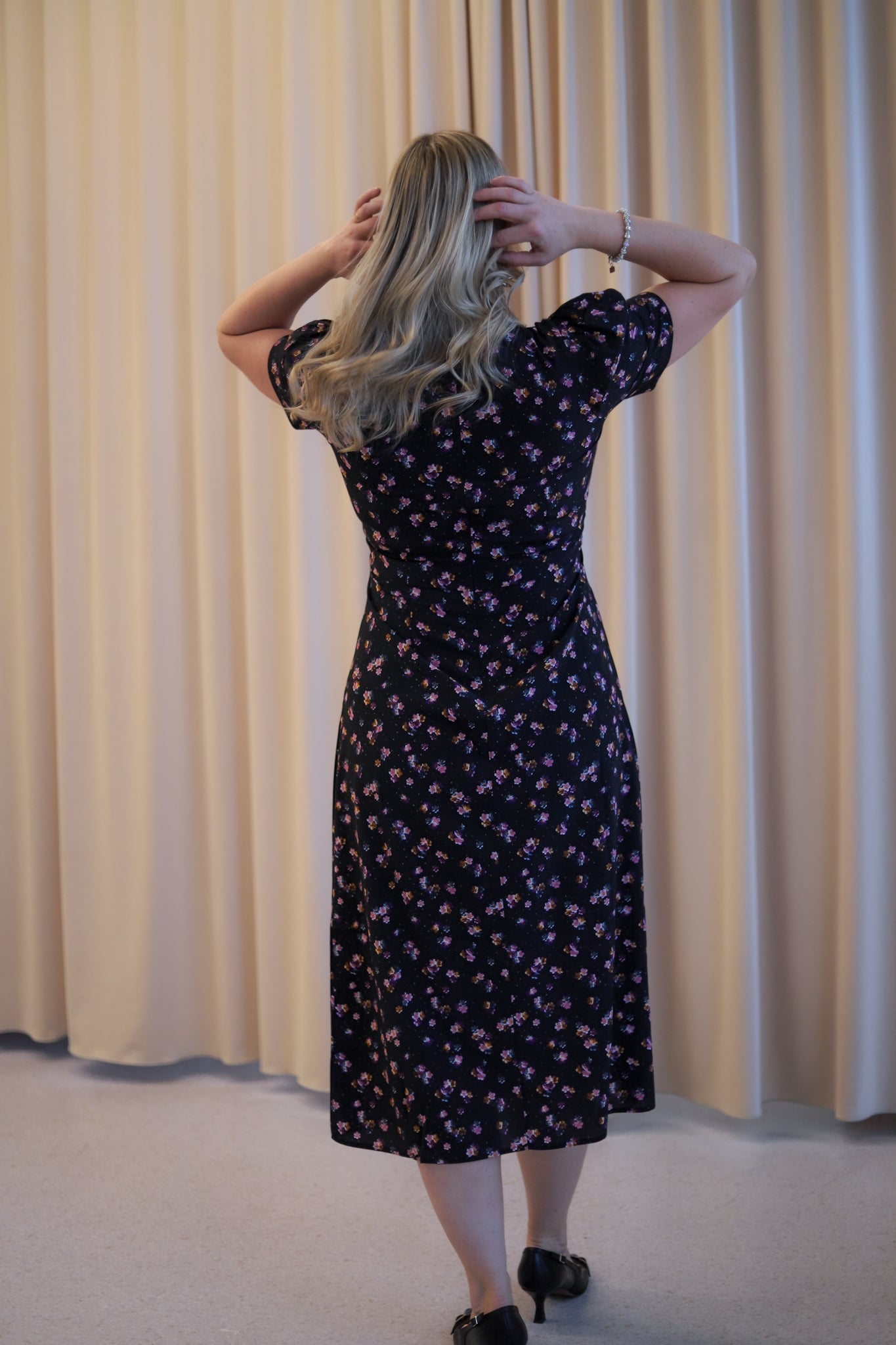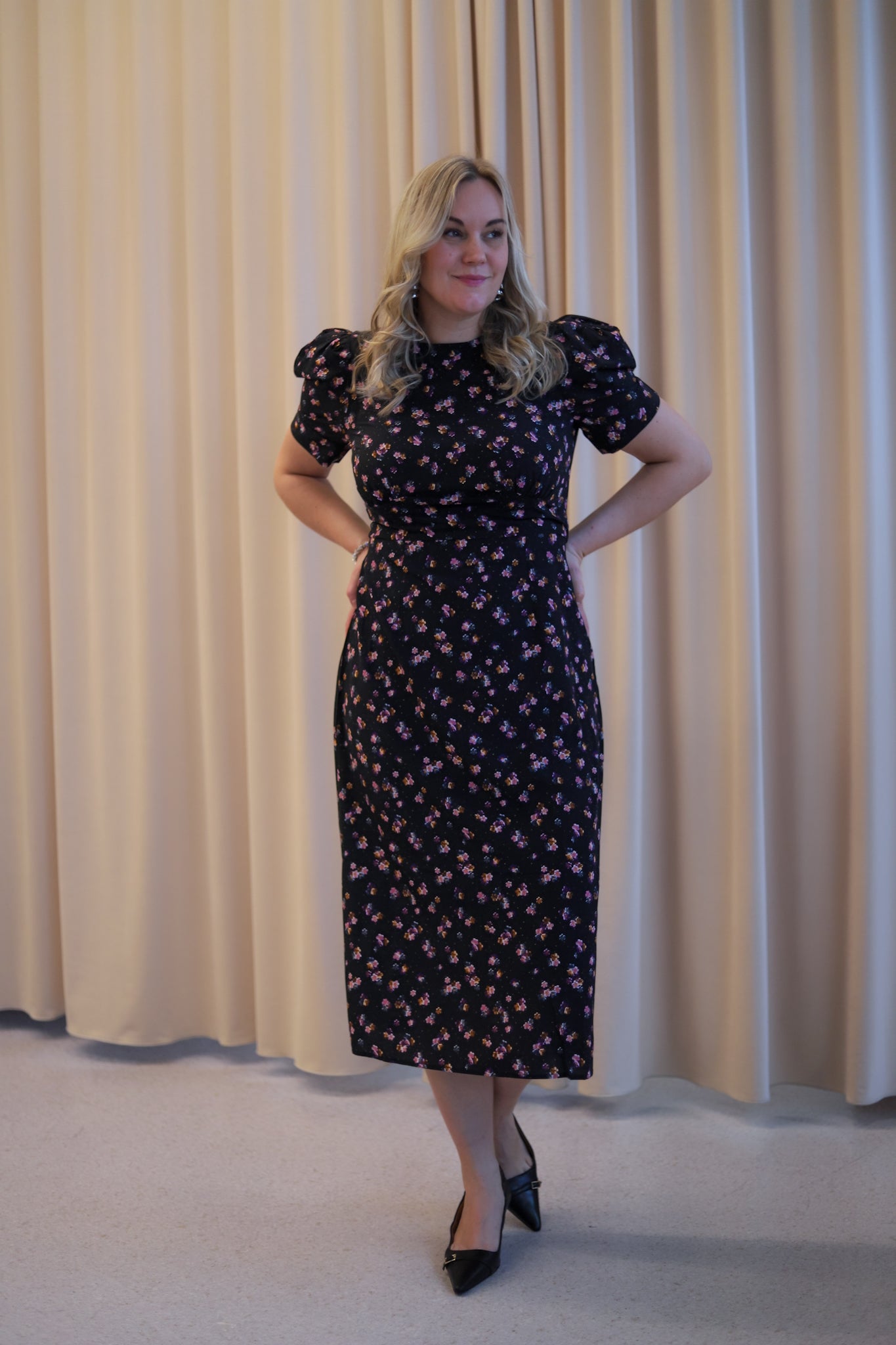 Delikat midikjole i stretchy silkekrepp med sort bunn og småblomstret print fra Pia Tjelta. Modellen er tettsittende med skjørt som slipper litt fra hoften. Kjolen har rund hals, korte puffermer og lukkes med skjult glidelås bak. Flatterende kjole i fantastisk silkemiks.