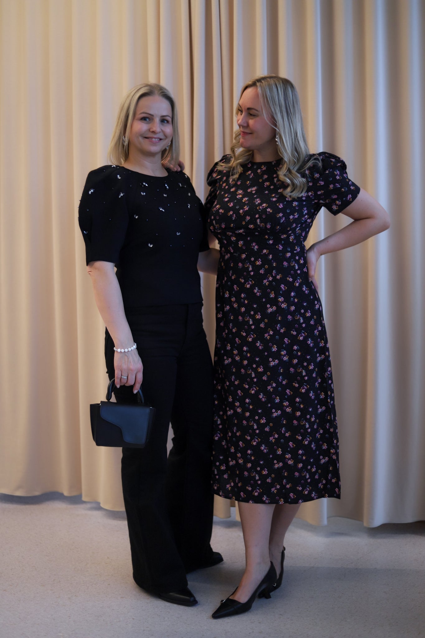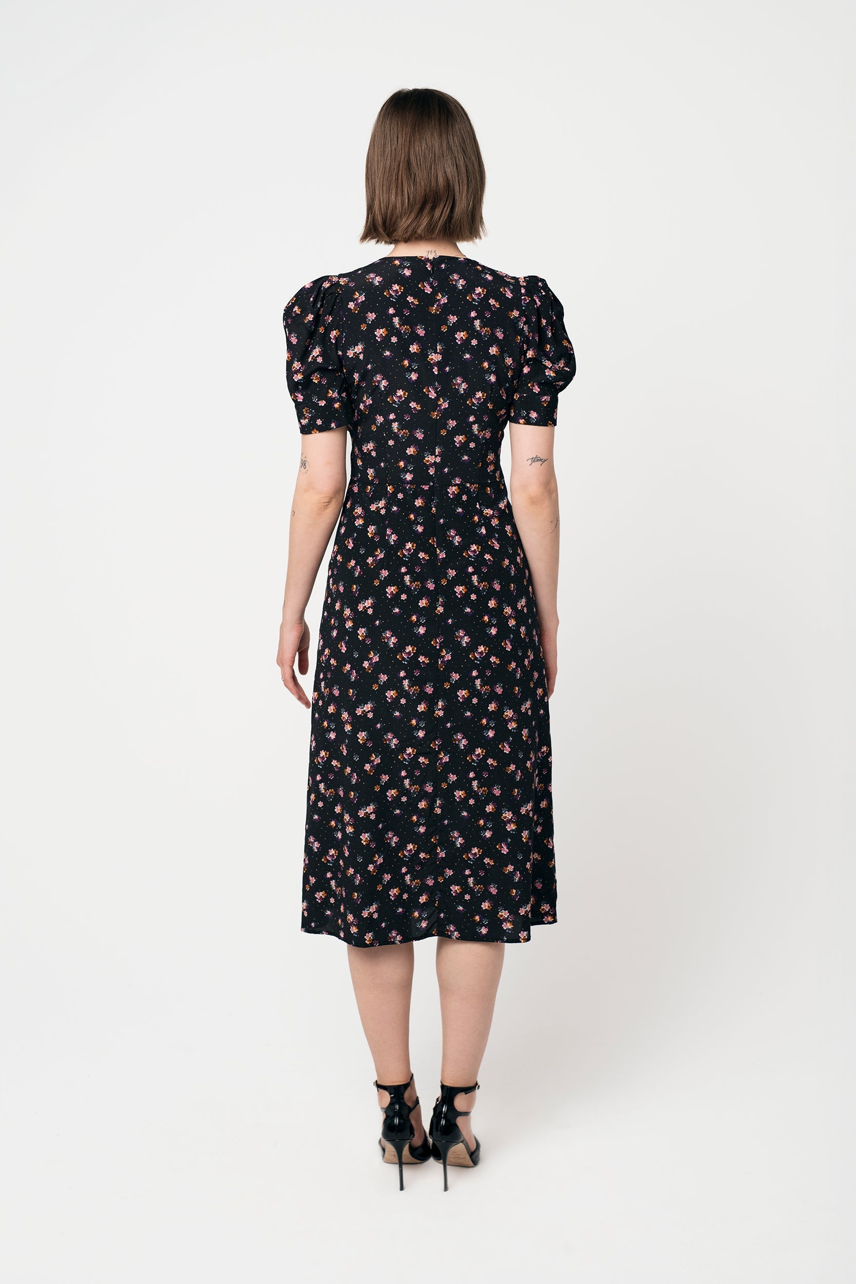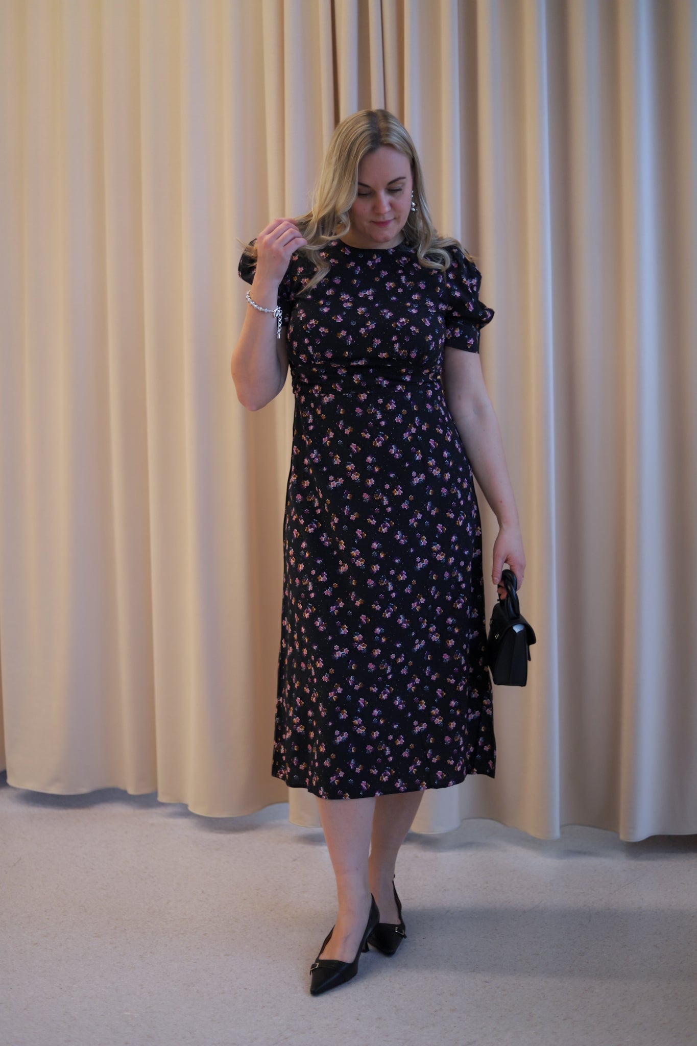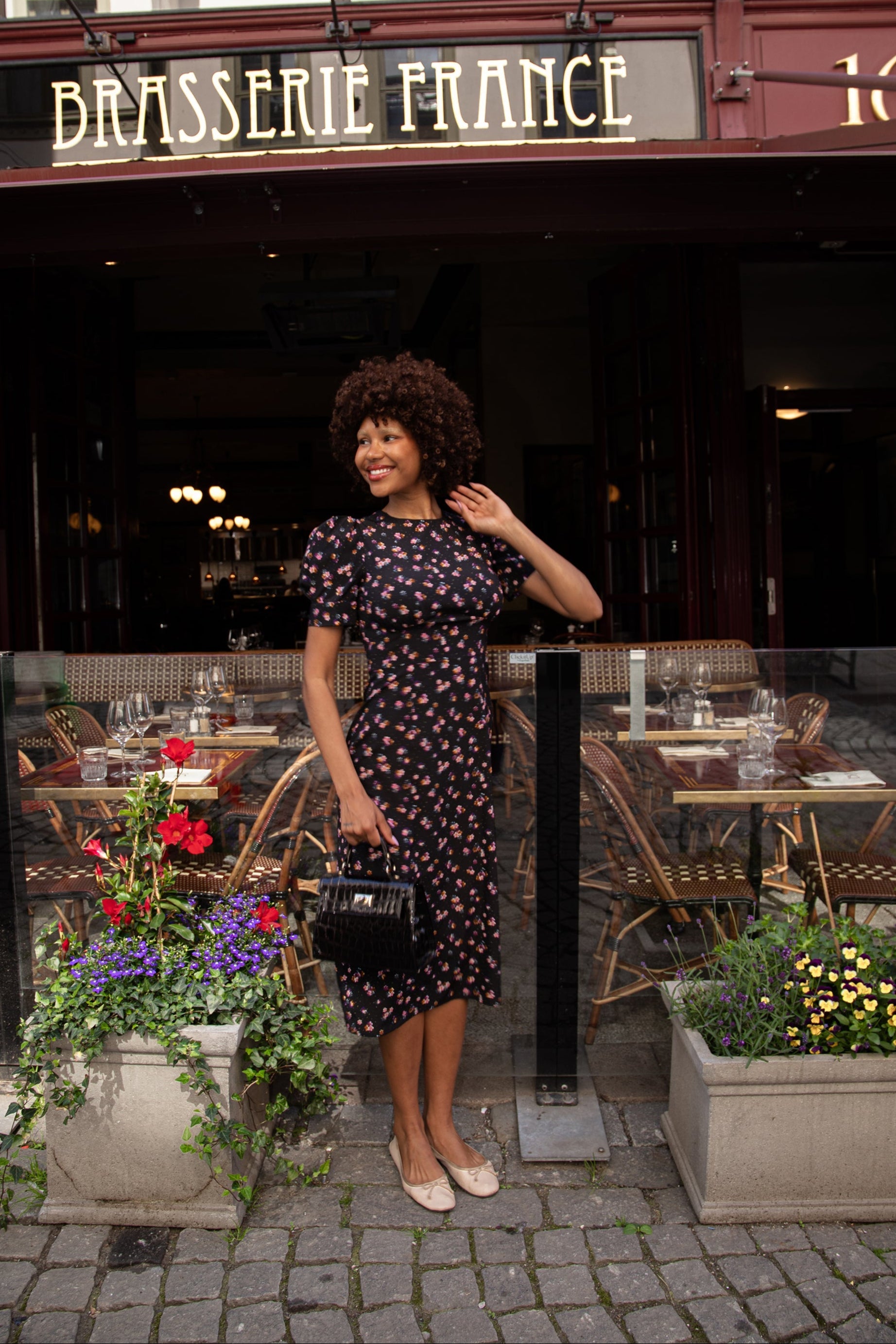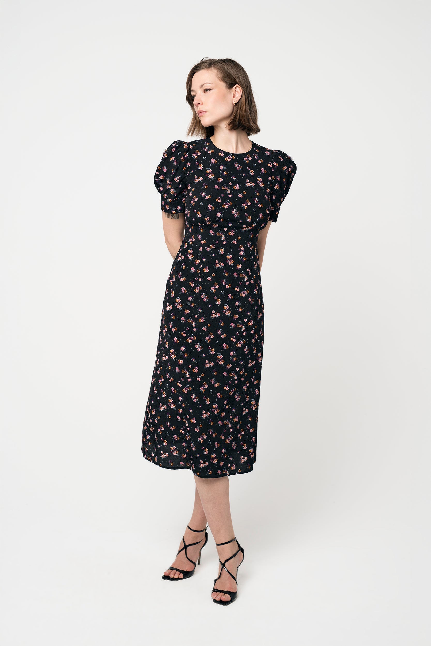 Delikat midikjole i stretchy silkekrepp med sort bunn og småblomstret print fra Pia Tjelta. Modellen er tettsittende med skjørt som slipper litt fra hoften. Kjolen har rund hals, korte puffermer og lukkes med skjult glidelås bak. Flatterende kjole i fantastisk silkemiks.