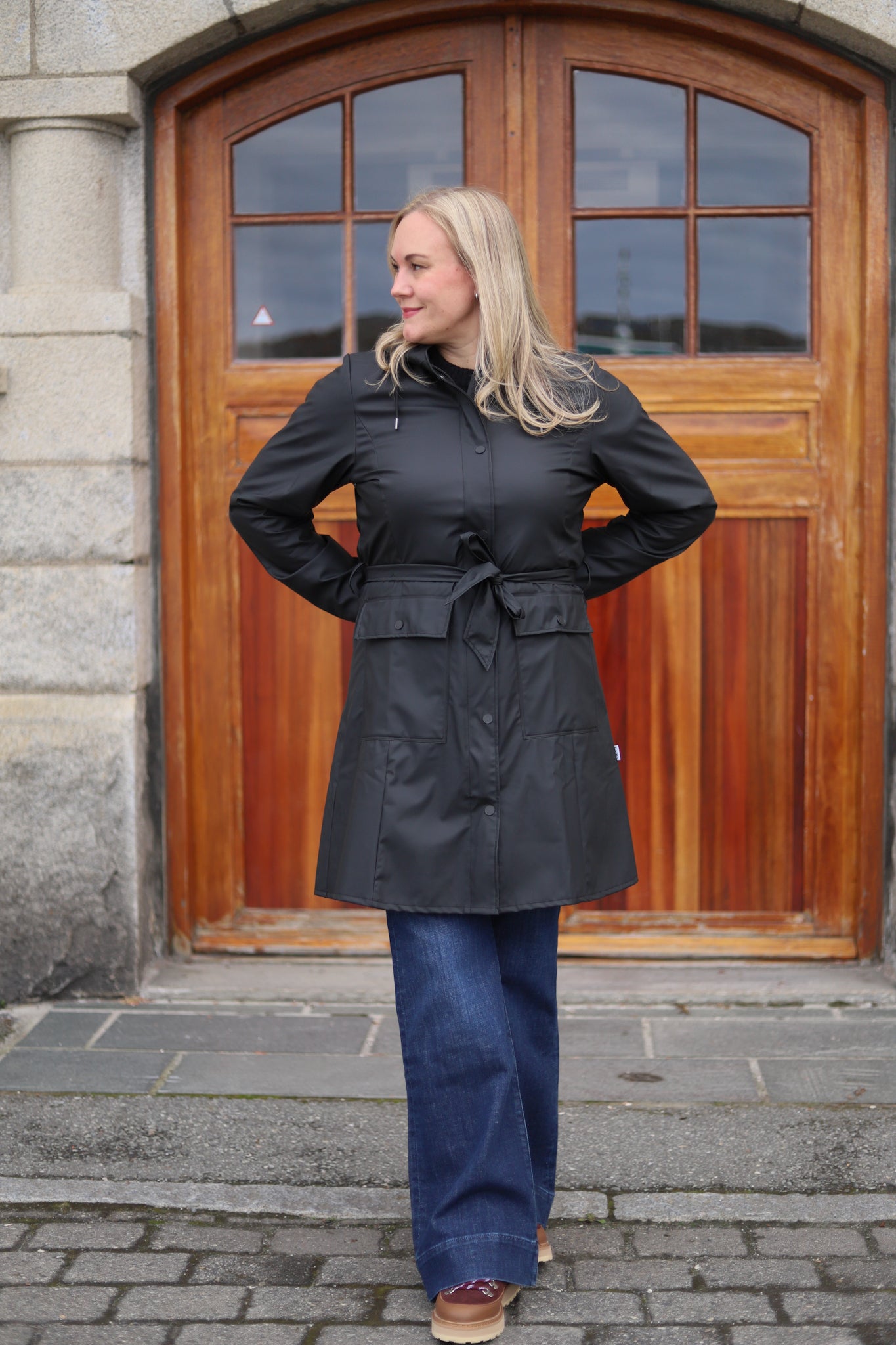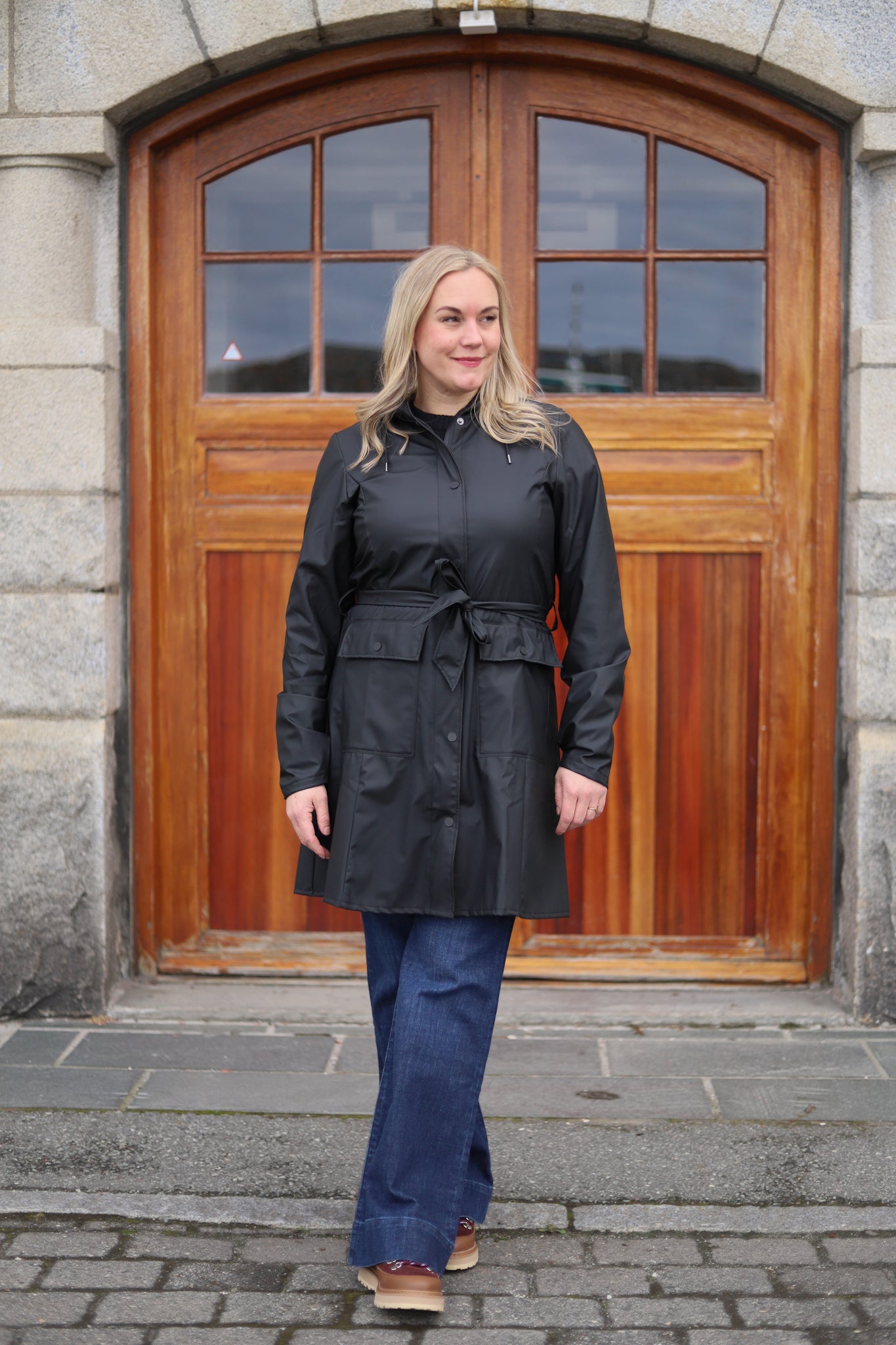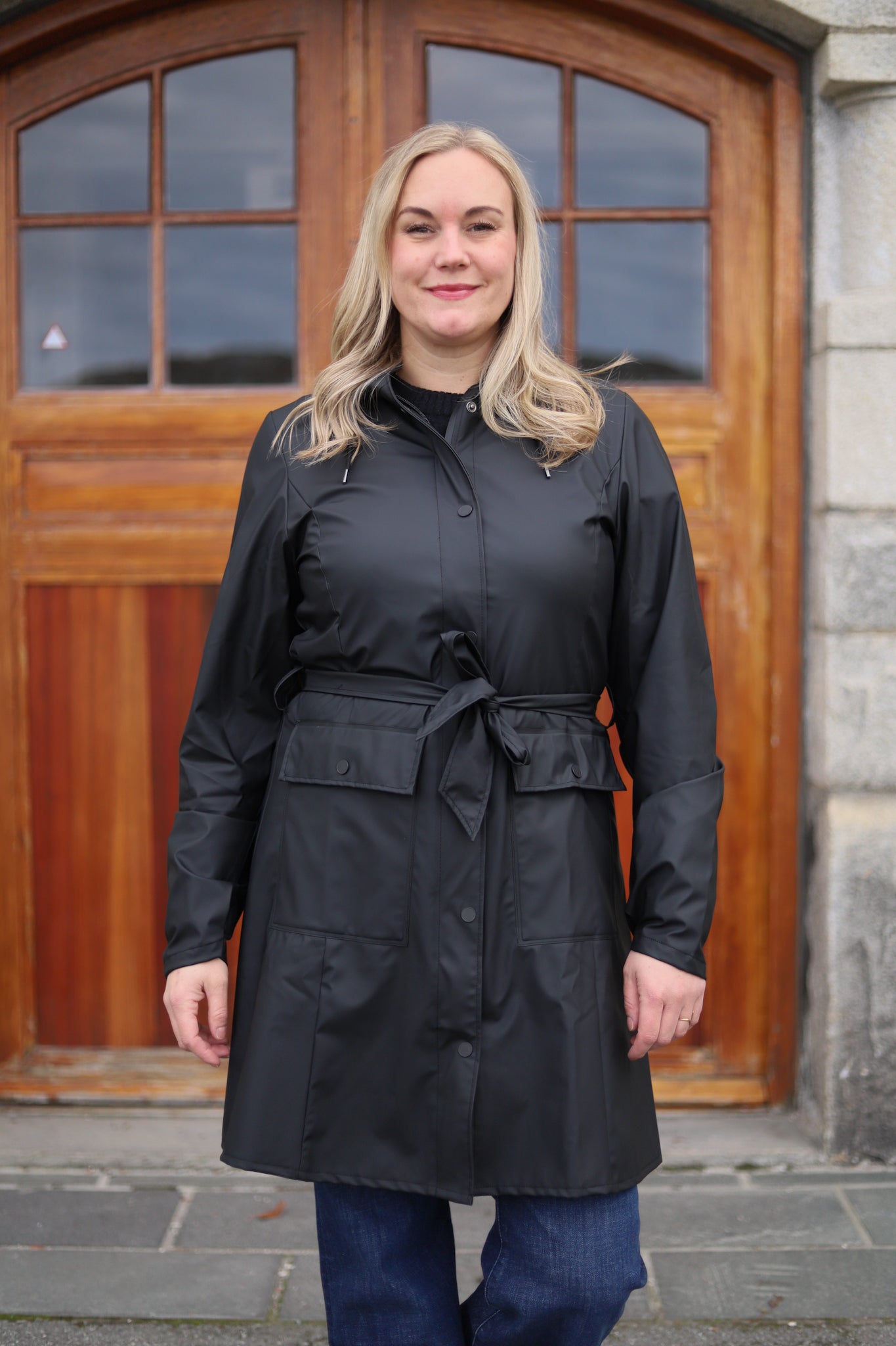 Vanntett regnjakke i deilig myk kvalitet fra Rains. Trenchcoat stil, med a-fasong og knytebelte i livet. Jakken er lett i vekt og har en flott matt finish. En jakke med høy funksjonalitet kombinert med et feminint og minimalistisk design. Glidelås med stormklaff lags fronten og hette med brem og snøring. Klafflommer i hoftehøyde og justerbare mansjetter. Jakken er vanntett, vindtett, har sveisede sømmer og ventilering under armene. Her i klassisk sort. Perfekt urban og trendy jakke på farten, uansett vær!