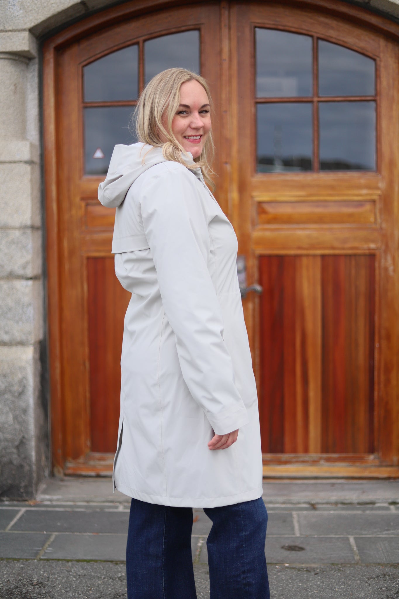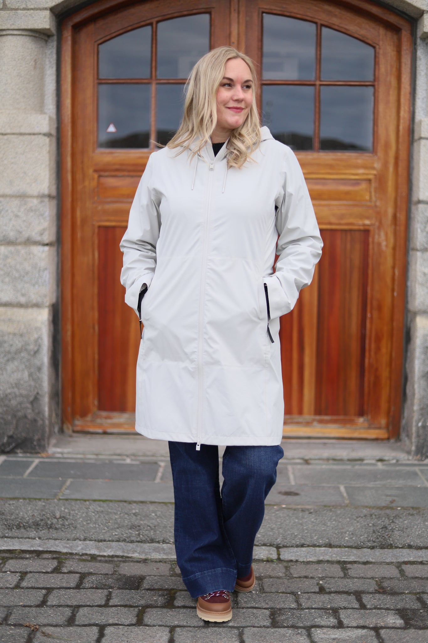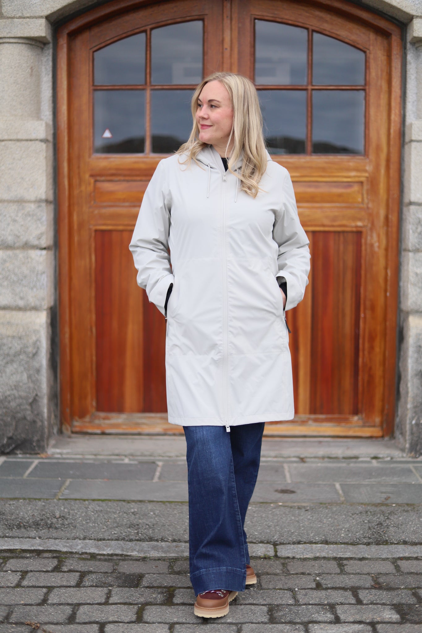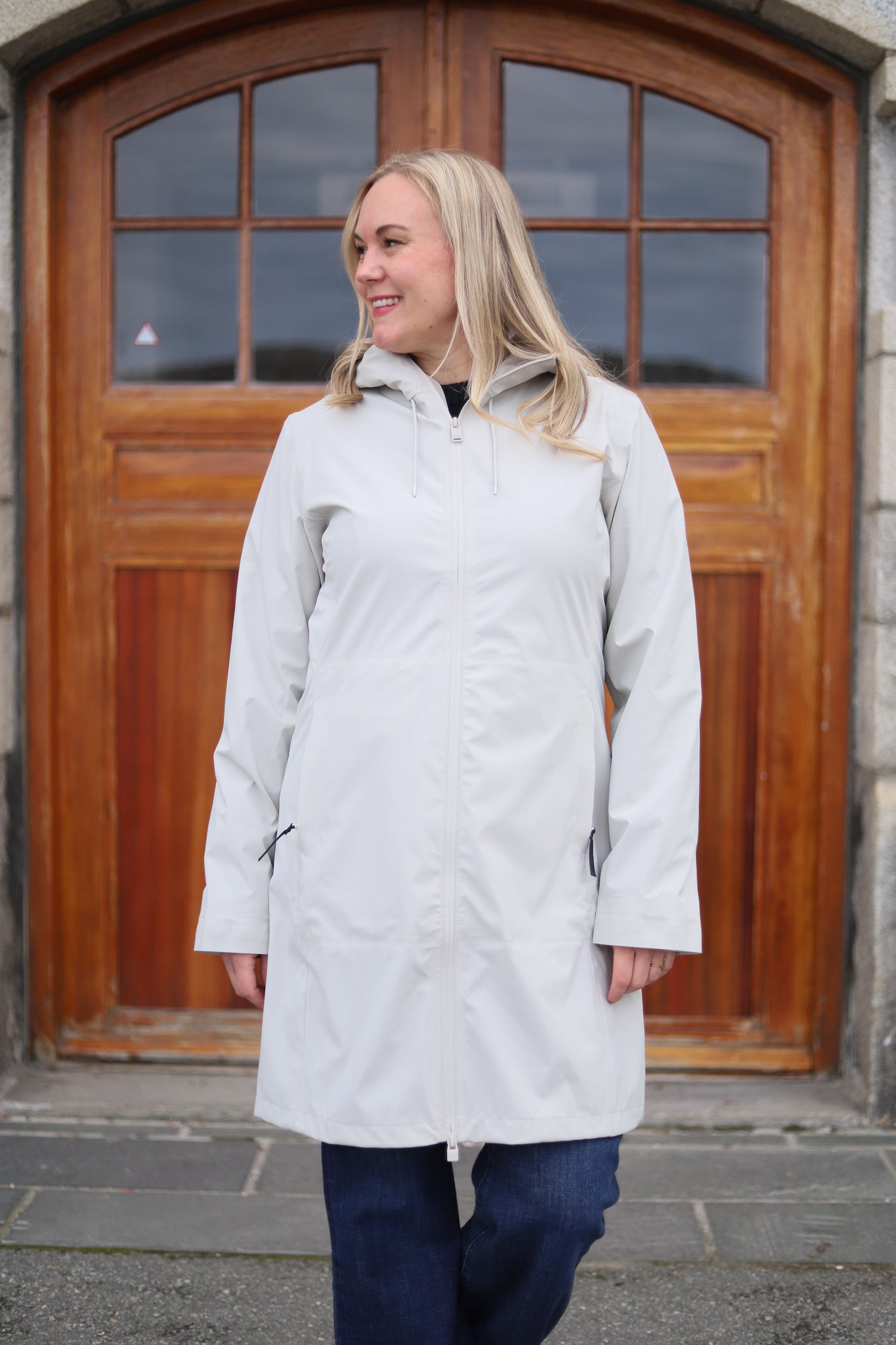 Stilig regnjakke i offhvite fra Rains. Modellen er rett med lengde til knærne, glidelåslukking i front og en hette med snorjustering. Denne jakken er designet med glidelåslommer i siden og tekniske stormmansjetter i jersey. Jakken kombinerer høy funksjonalitet med en livsstilsteknologisk estetikk og er laget av mykt og lett 3L-stoff med teipede sømmer og en matt overflate. Myk og behagelig jakke i vanntett og pustende materiale.