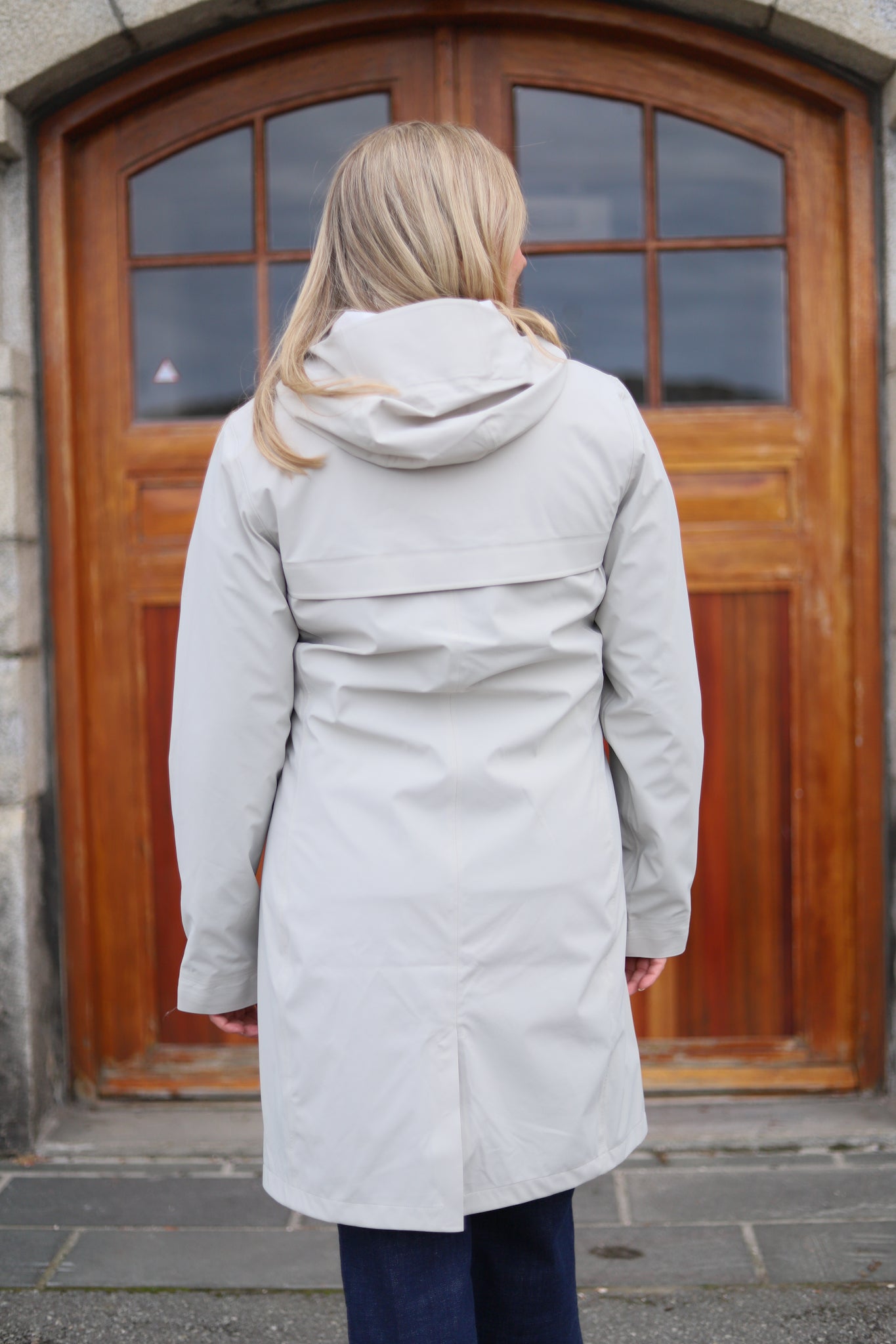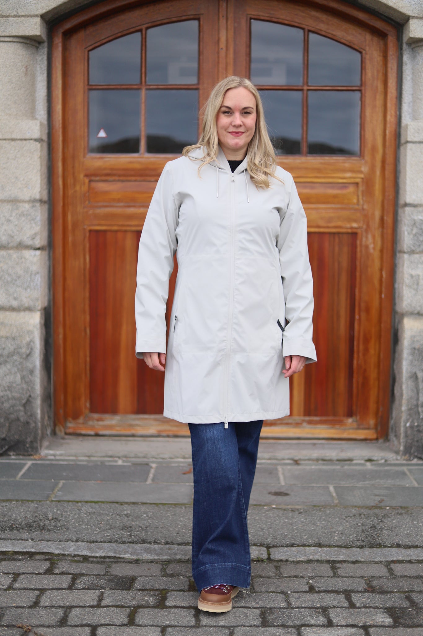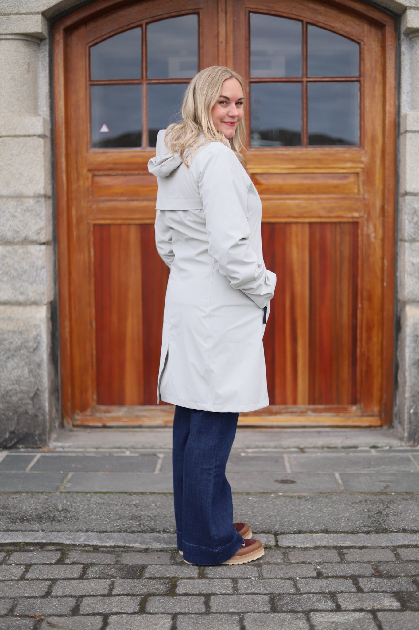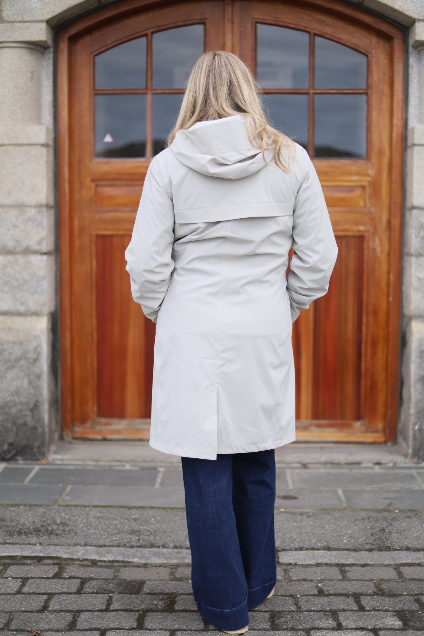 Stilig regnjakke i offhvite fra Rains. Modellen er rett med lengde til knærne, glidelåslukking i front og en hette med snorjustering. Denne jakken er designet med glidelåslommer i siden og tekniske stormmansjetter i jersey. Jakken kombinerer høy funksjonalitet med en livsstilsteknologisk estetikk og er laget av mykt og lett 3L-stoff med teipede sømmer og en matt overflate. Myk og behagelig jakke i vanntett og pustende materiale.
