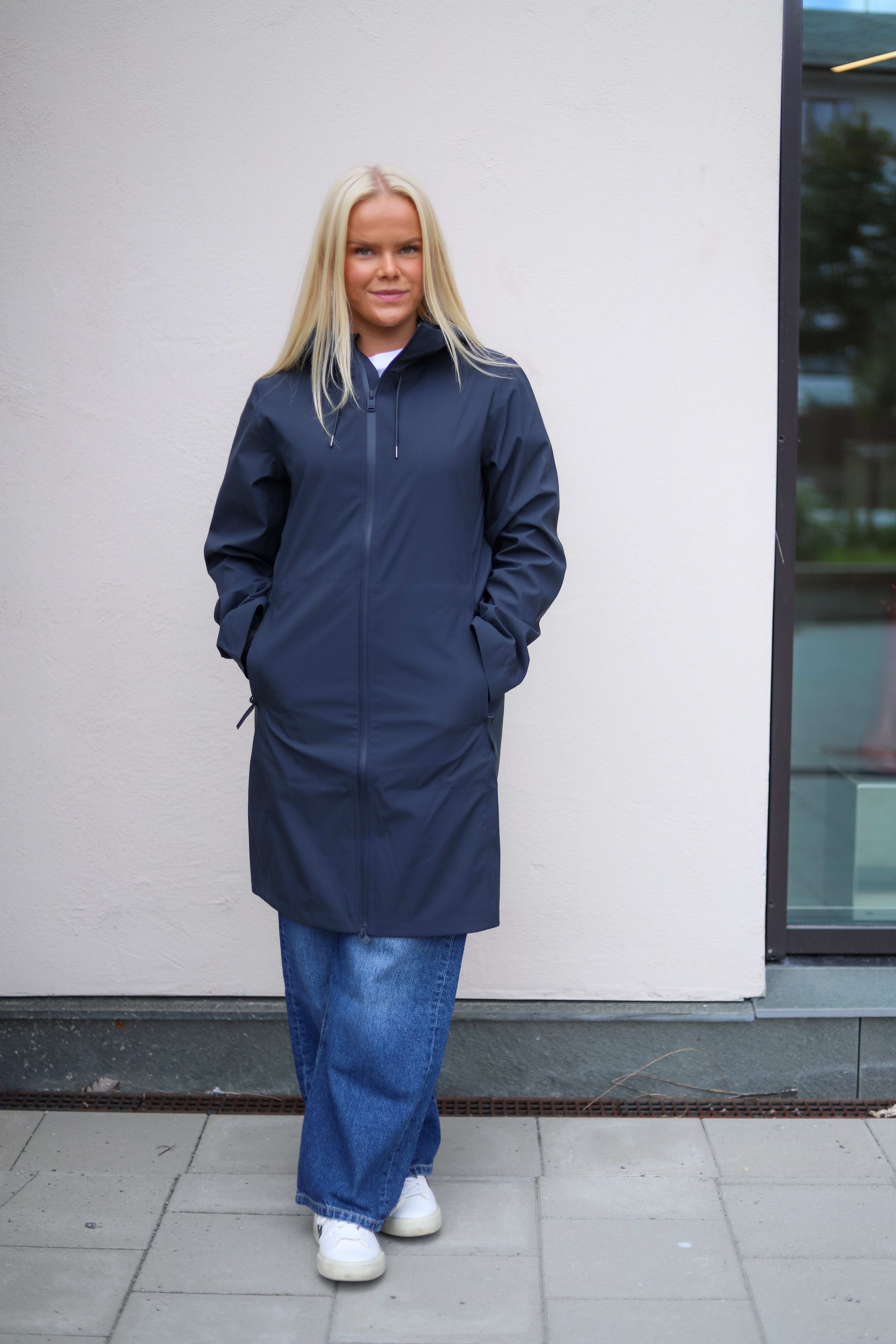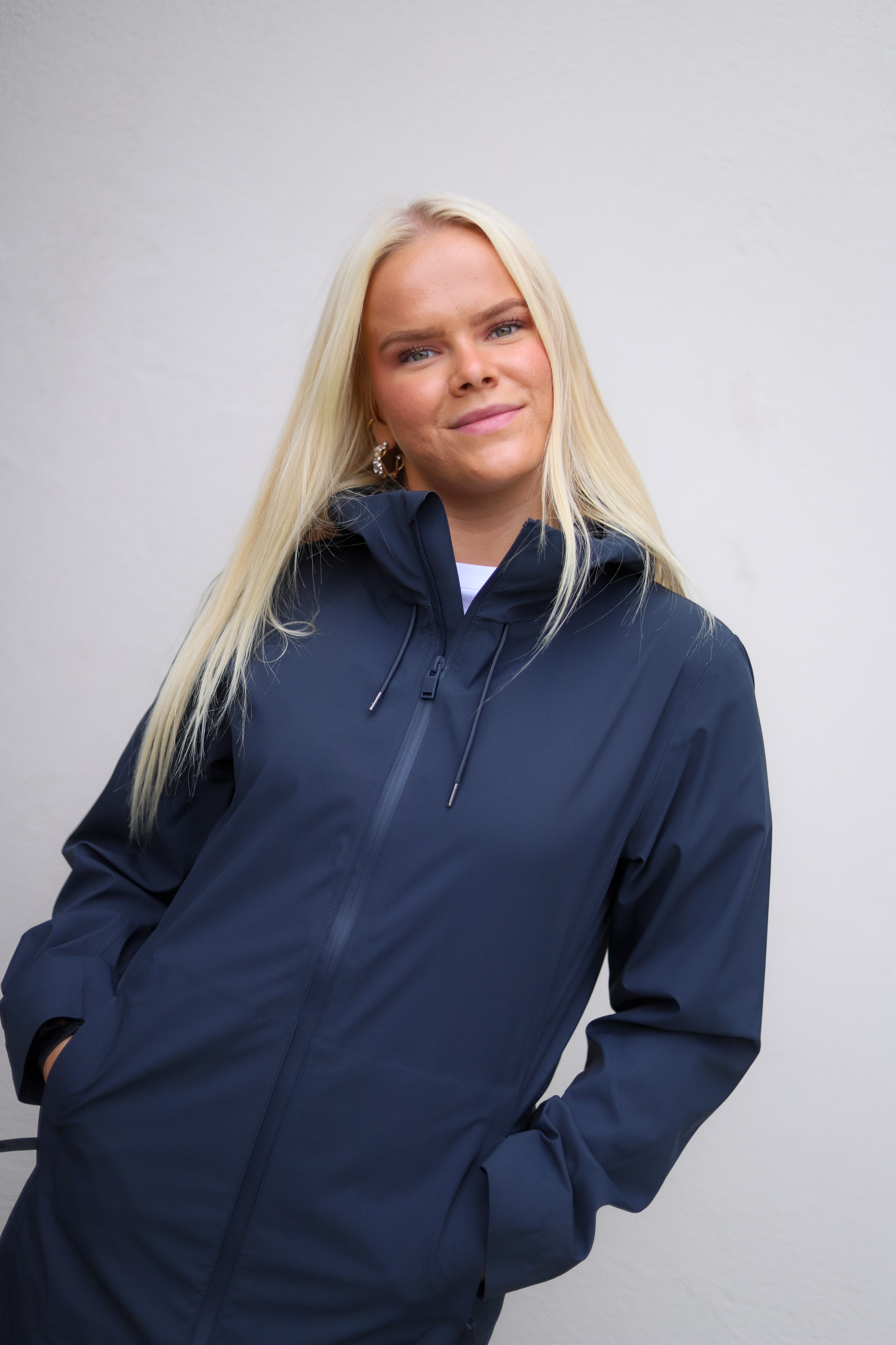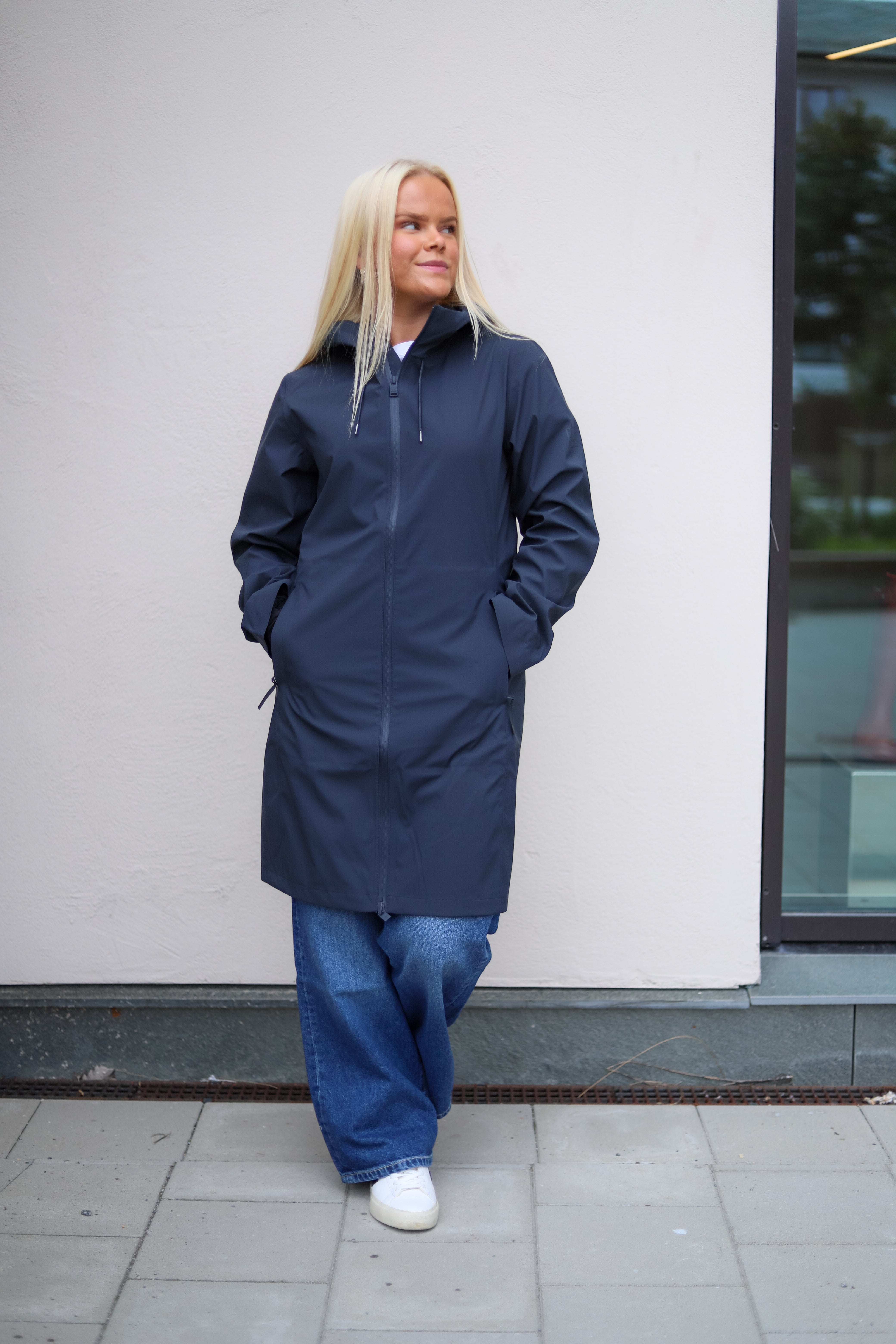 Stilig regnjakke i mørk blå fra Rains. Modellen er rett med lengde til knærne, glidelåslukking i front og en hette med snorjustering. Denne jakken er designet med glidelåslommer i siden og tekniske stormmansjetter i jersey. Jakken kombinerer høy funksjonalitet med en livsstilsteknologisk estetikk og er laget av mykt og lett 3L-stoff med teipede sømmer og en matt overflate. Myk og behagelig jakke i vanntett og pustende materiale.