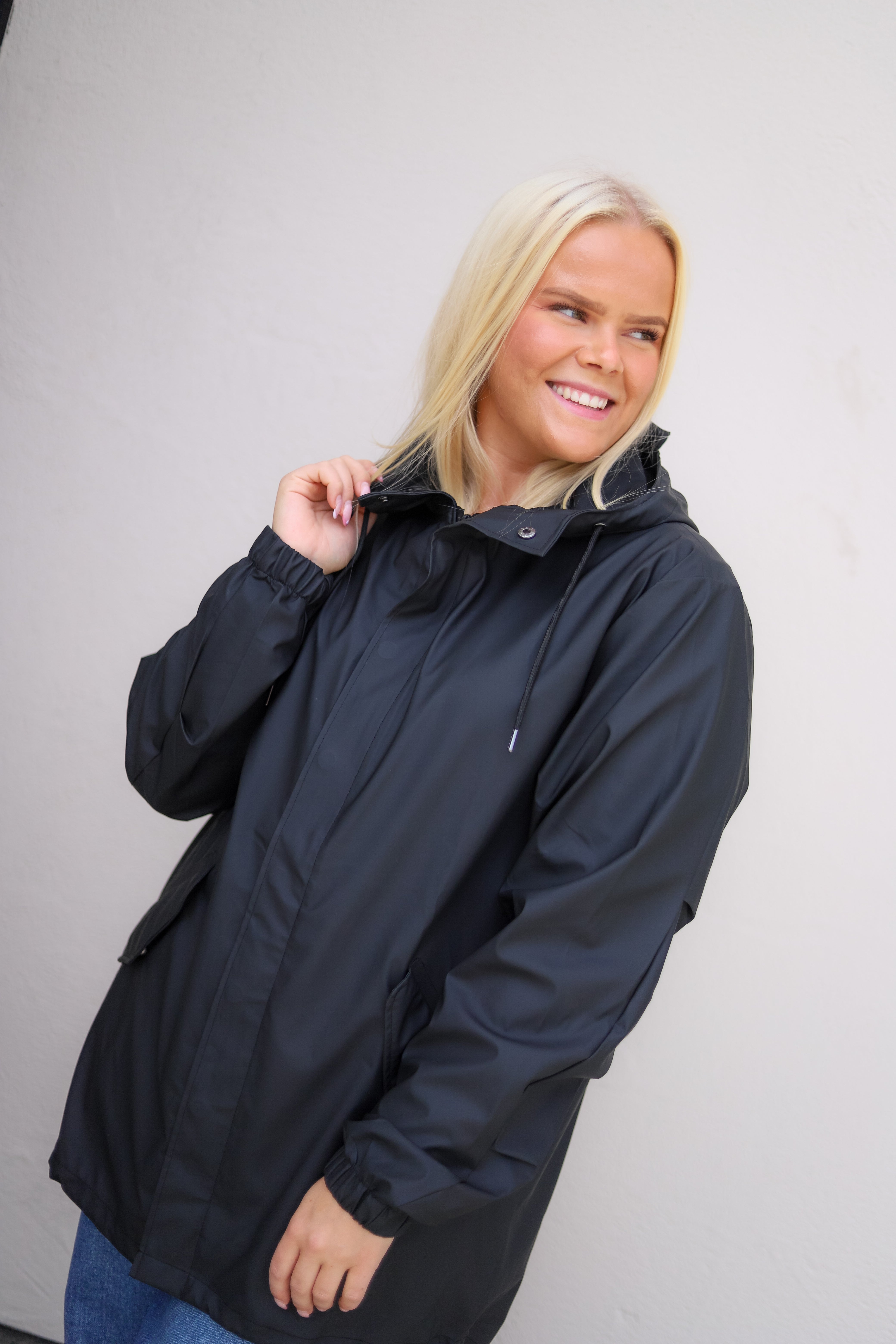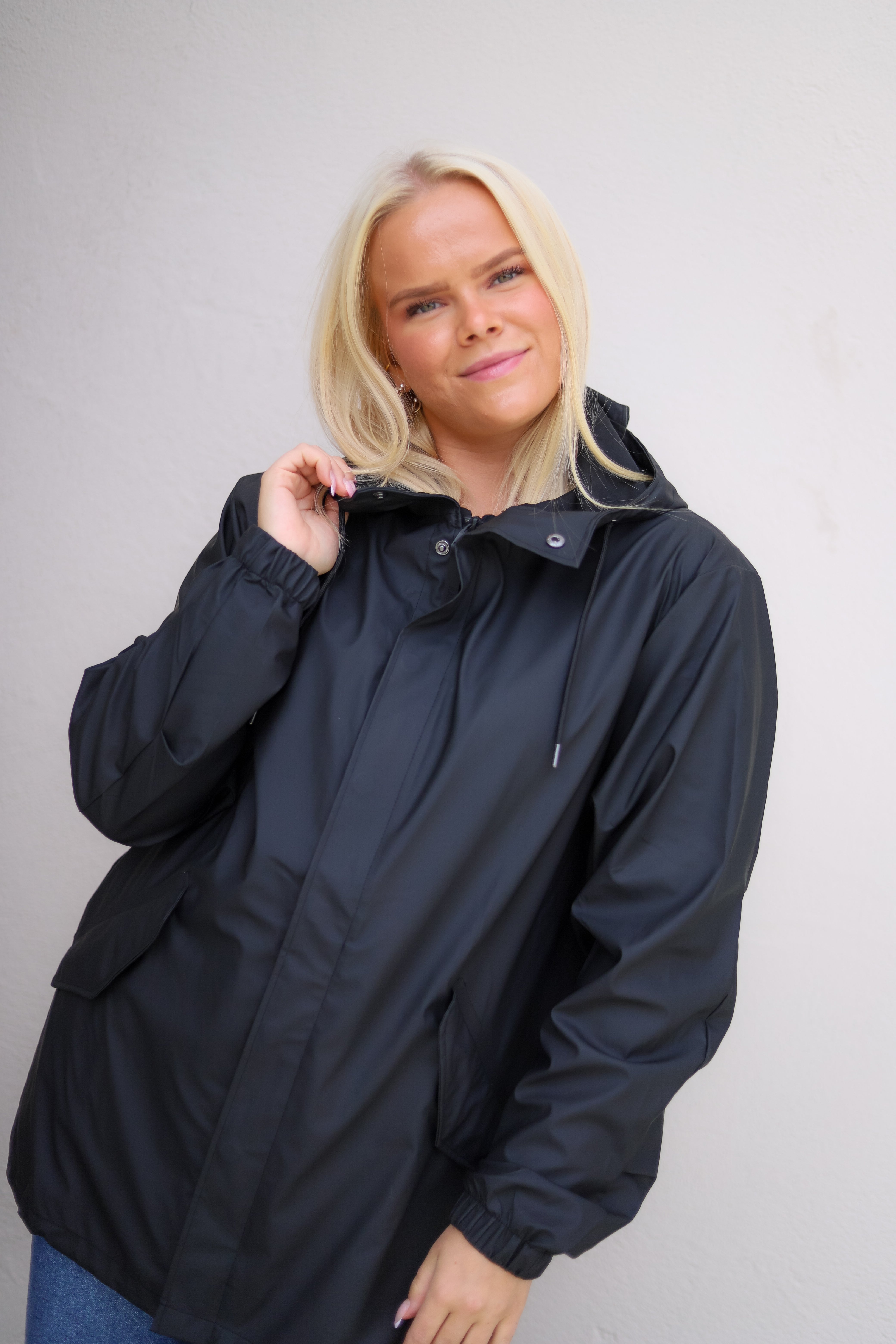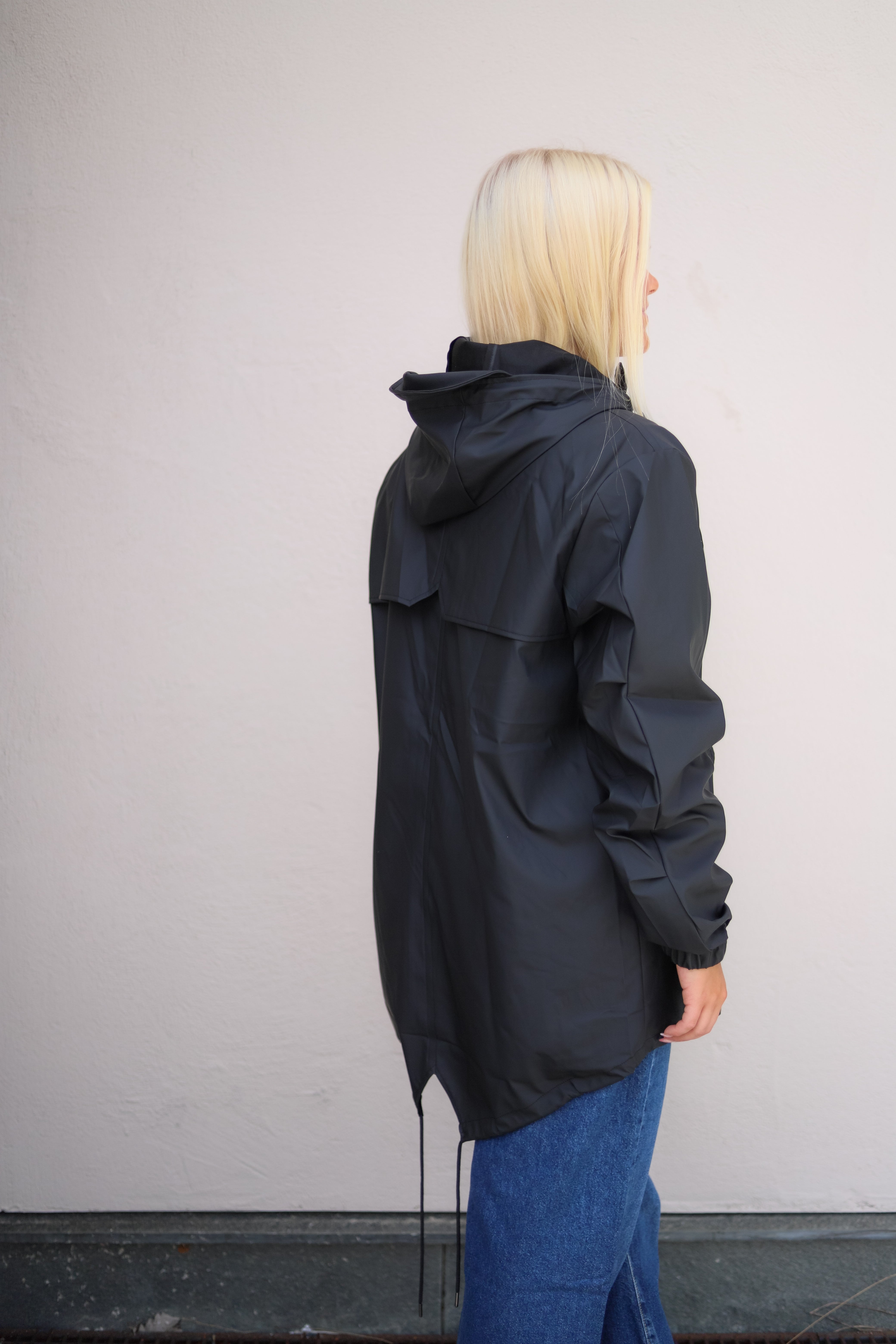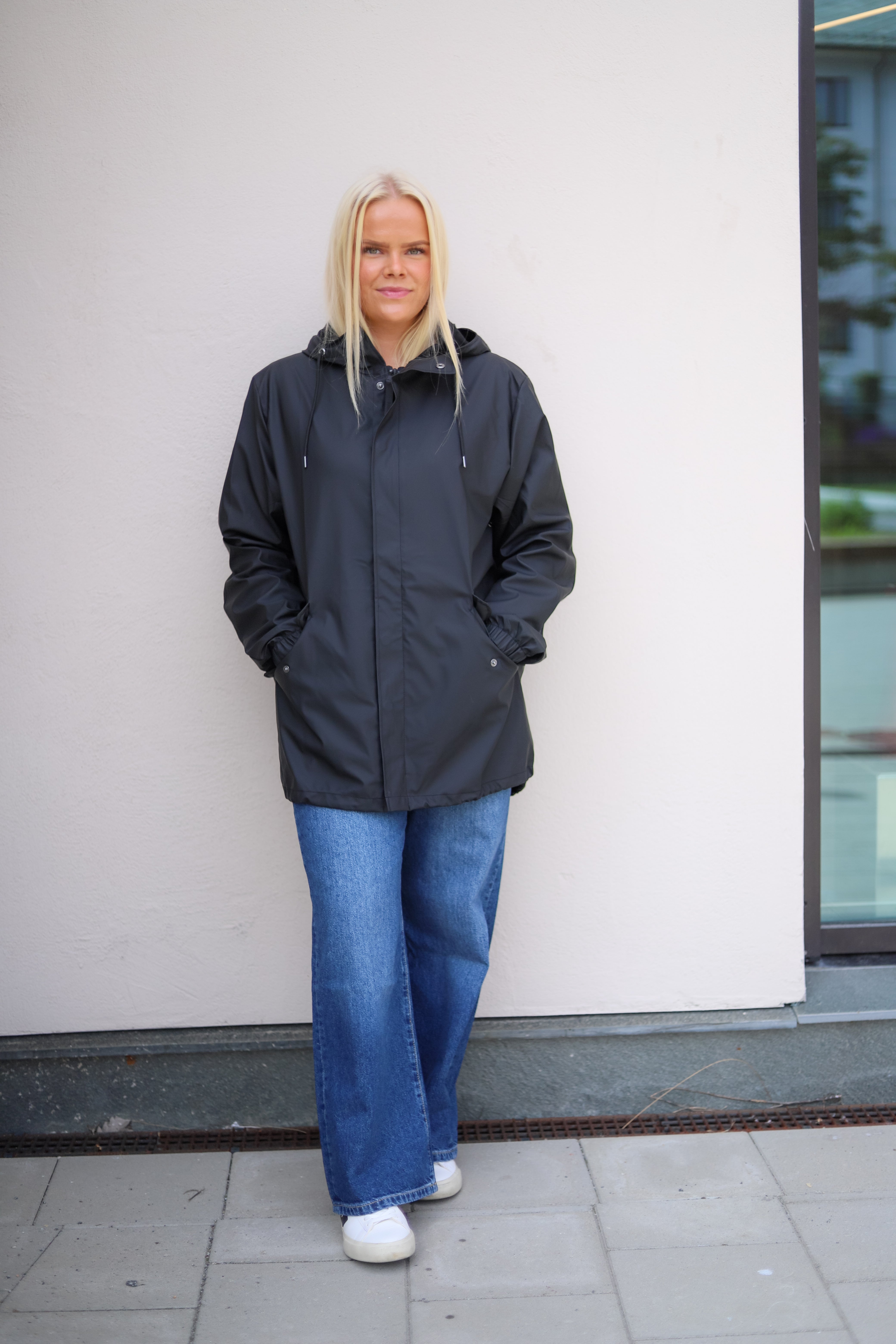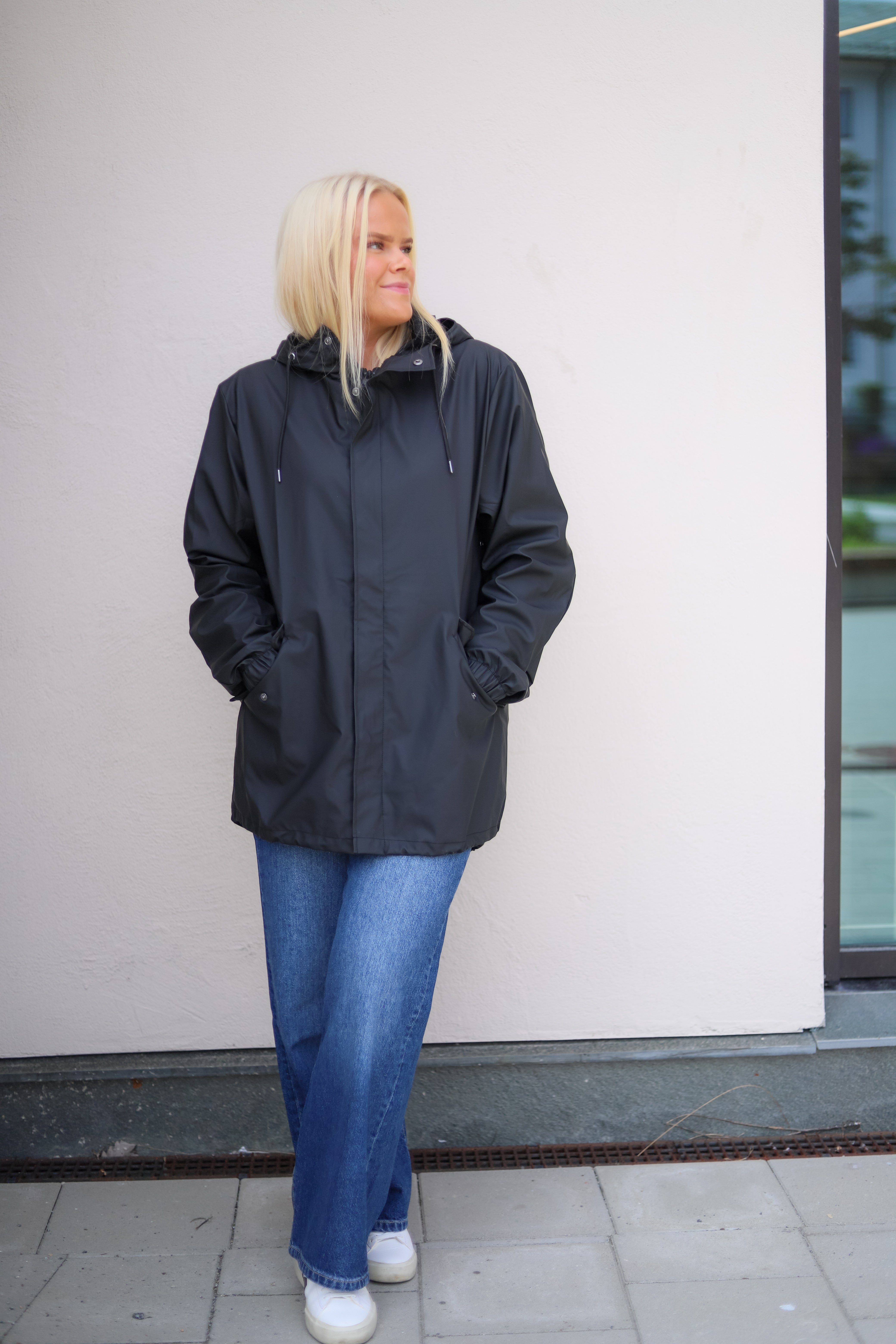Vanntett regnjakke i deilig myk kvalitet fra Rains. Modellen er rett med god hoftelengde og justerbar knyting i hem. Jakken er lett i vekt og har en flott finish. En jakke med høy funksjonalitet kombinert med et minimalistisk design. Glidelås og skjulte knapper lags fronten. Hette med justering, klafflommer i hoftehøyde og elastiske mansjetter. Jakken er vanntett, vindtett, har sveisede sømmer og ventilering under armene. Her i klassisk sort. Perfekt urban og trendy jakke på farten, uansett vær!