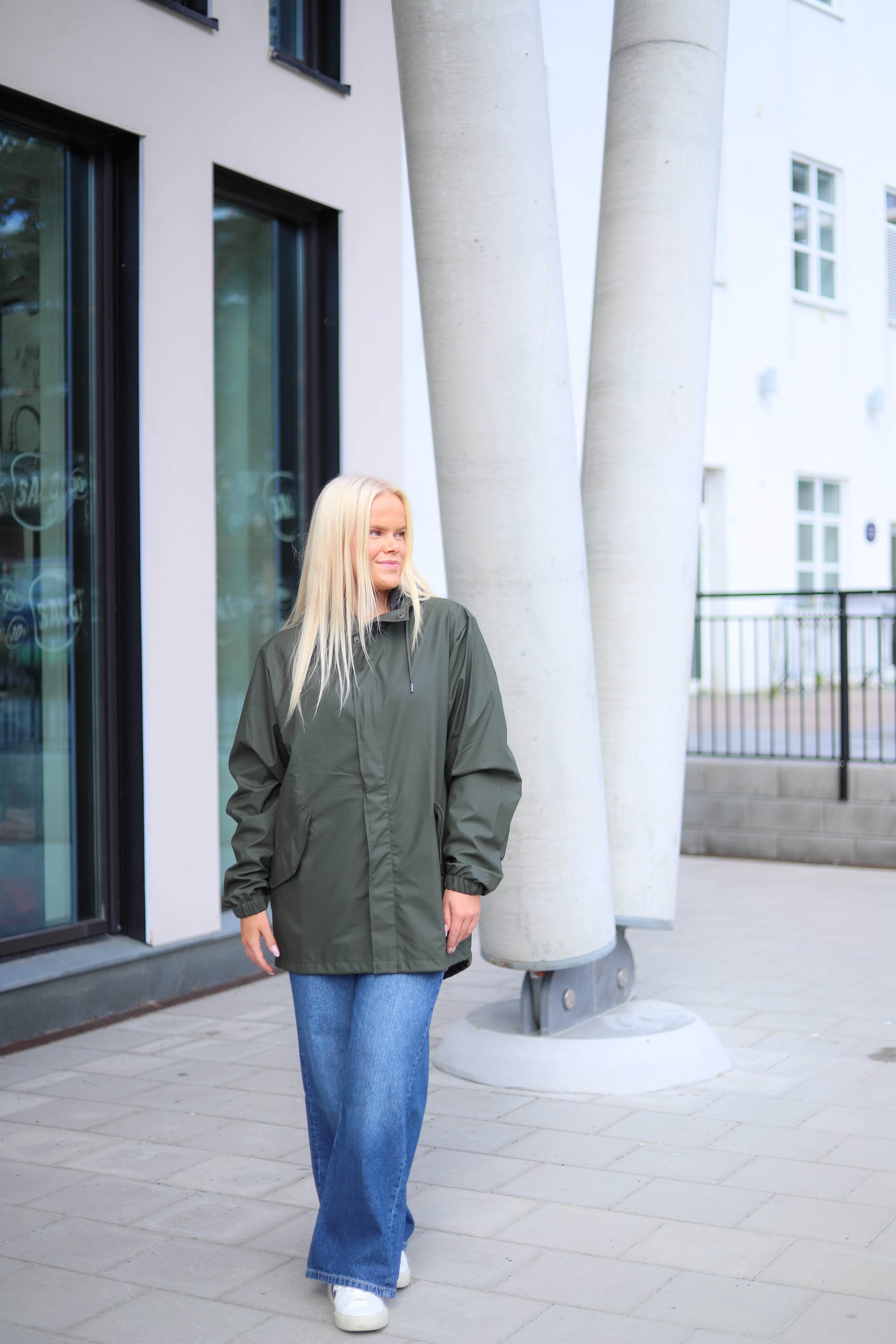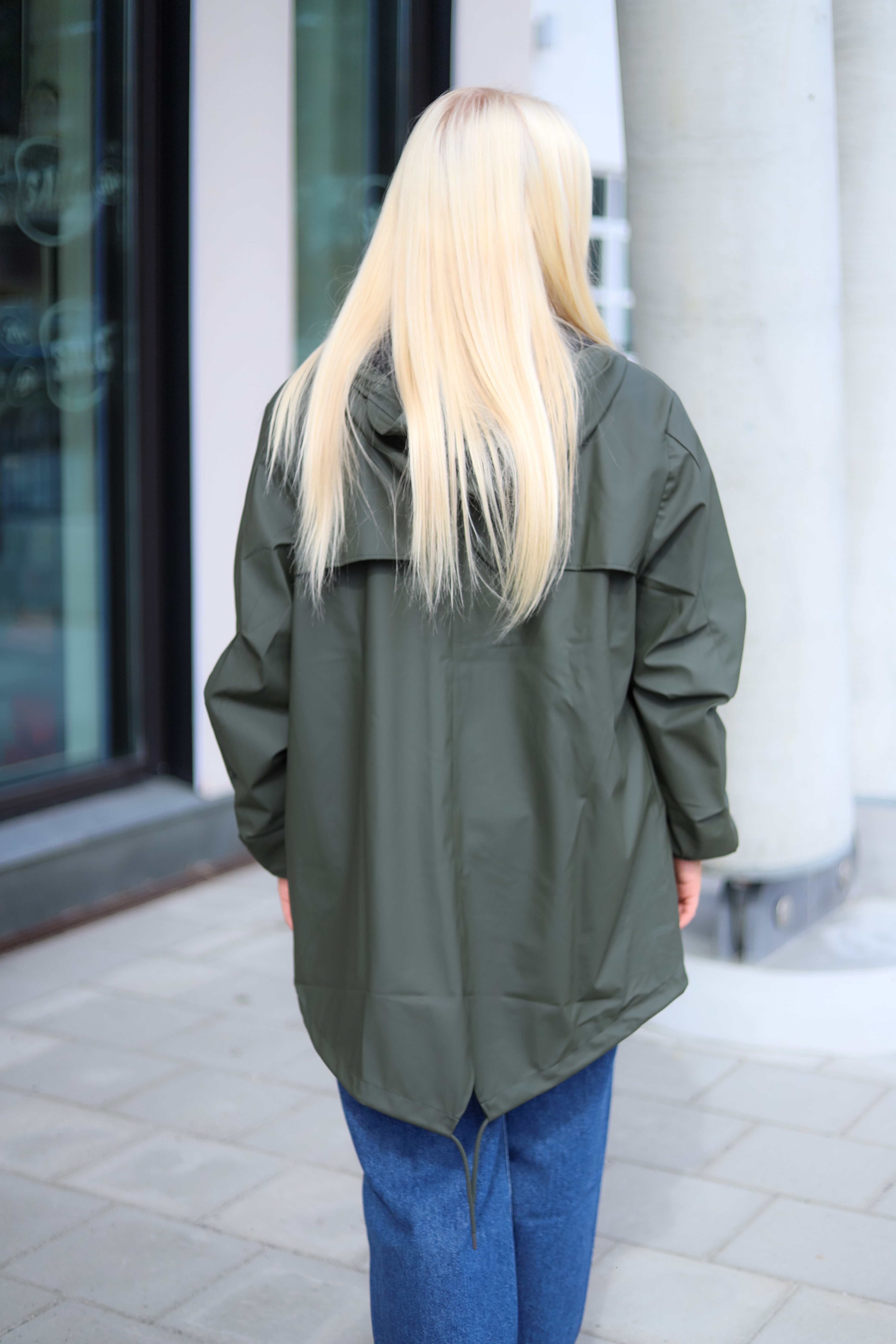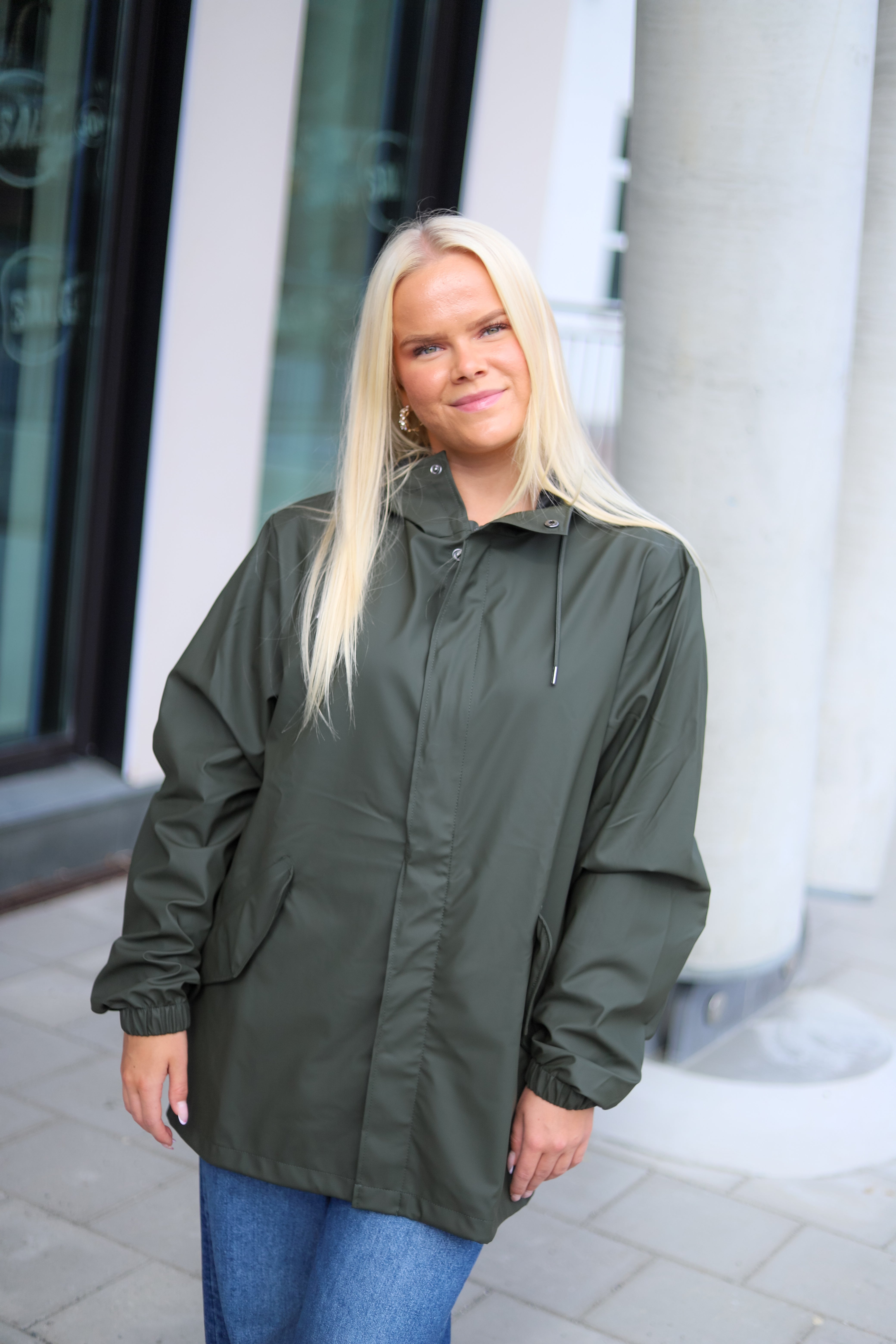 Vanntett regnjakke i deilig myk kvalitet fra Rains. Modellen er rett med god hoftelengde og justerbar knyting i hem. Jakken er lett i vekt og har en flott finish. En jakke med høy funksjonalitet kombinert med et minimalistisk design. Glidelås og skjulte knapper lags fronten. Hette med justering, klafflommer i hoftehøyde og elastiske mansjetter. Jakken er vanntett, vindtett, har sveisede sømmer og ventilering under armene. Her i mørk grønn. Perfekt urban og trendy jakke på farten, uansett vær!