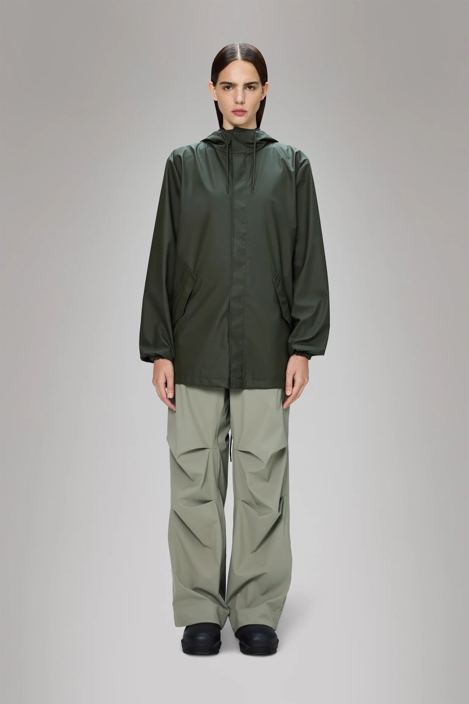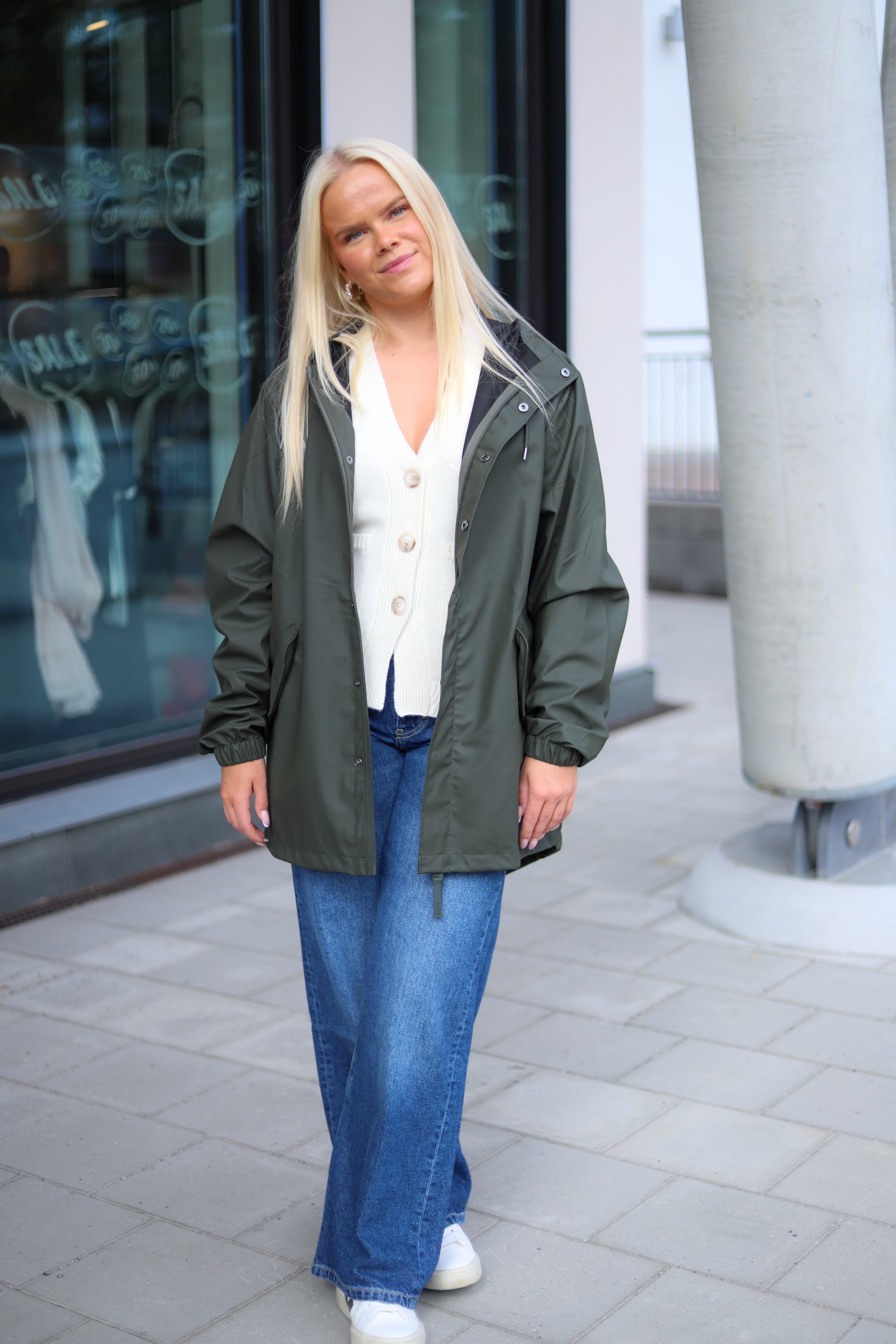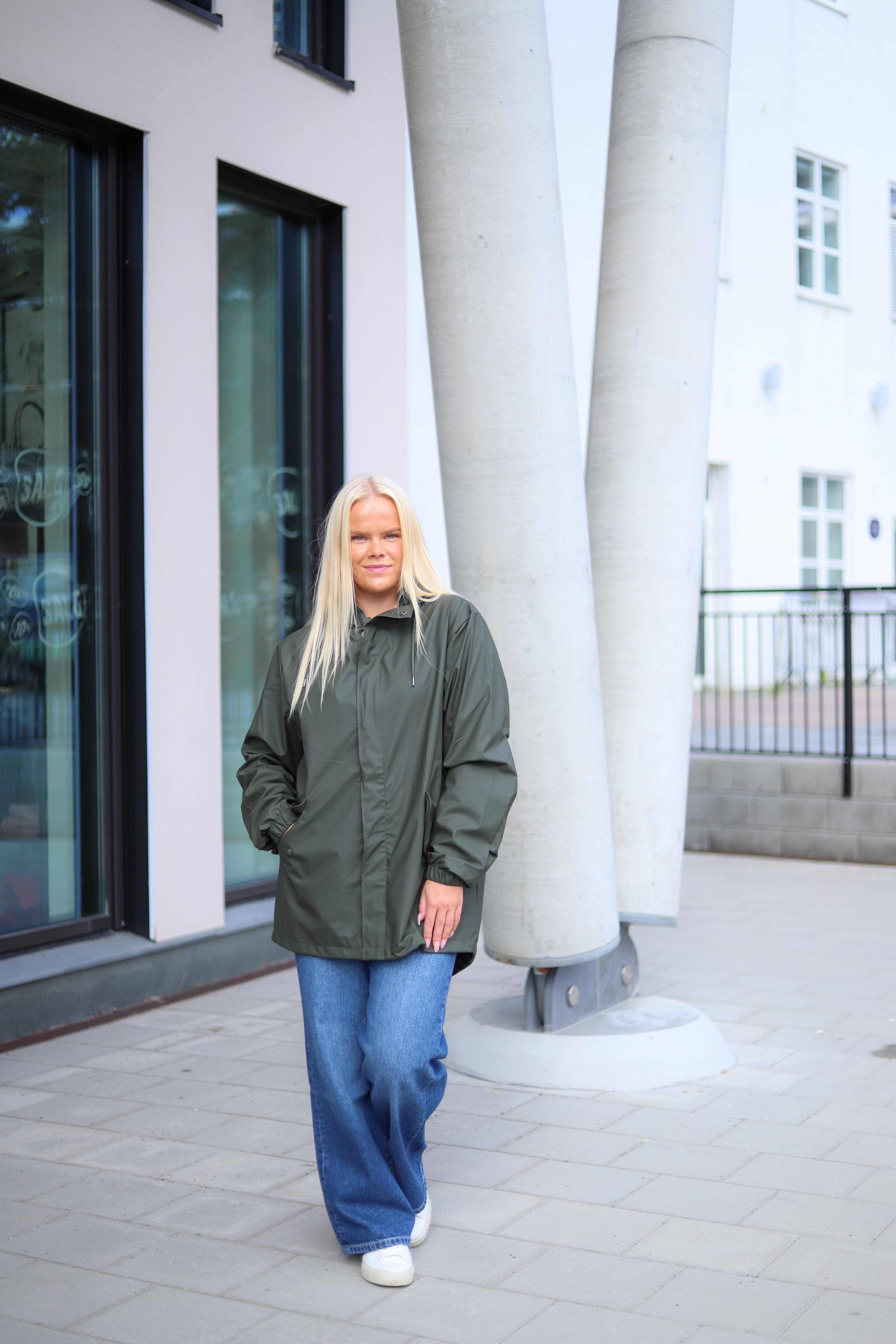 Vanntett regnjakke i deilig myk kvalitet fra Rains. Modellen er rett med god hoftelengde og justerbar knyting i hem. Jakken er lett i vekt og har en flott finish. En jakke med høy funksjonalitet kombinert med et minimalistisk design. Glidelås og skjulte knapper lags fronten. Hette med justering, klafflommer i hoftehøyde og elastiske mansjetter. Jakken er vanntett, vindtett, har sveisede sømmer og ventilering under armene. Her i mørk grønn. Perfekt urban og trendy jakke på farten, uansett vær!
