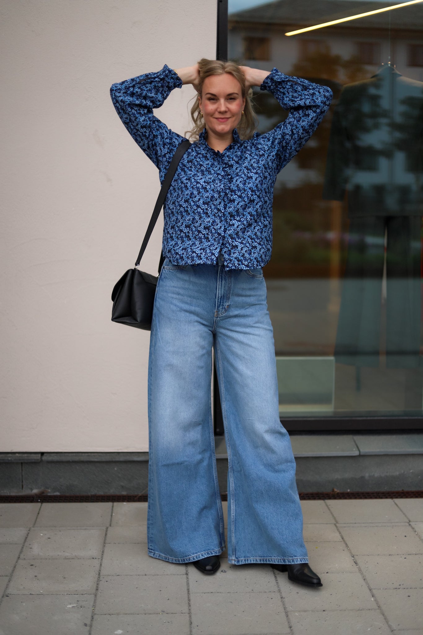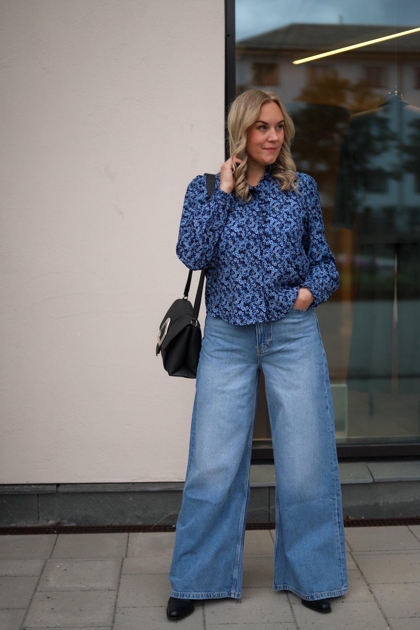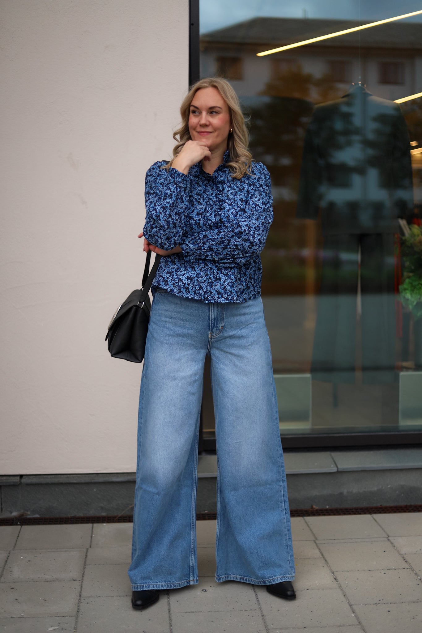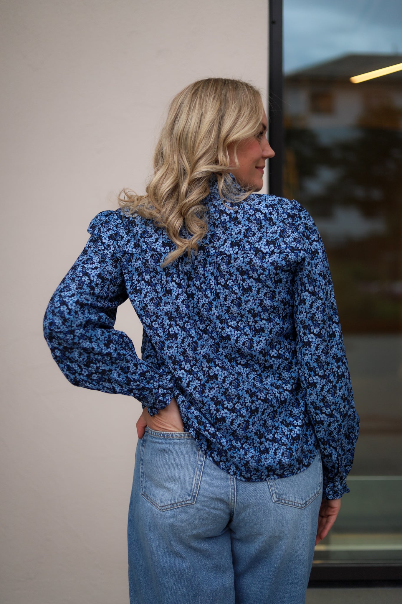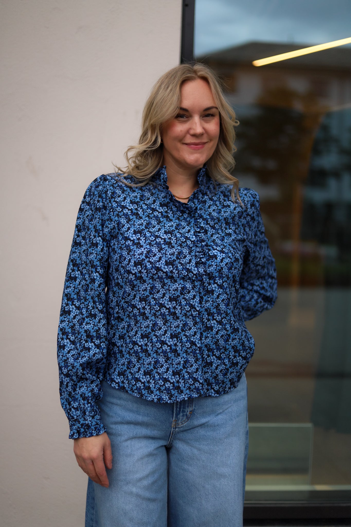 Lekker bluse i blomstrende blåtoner fra Raus. Blusen har en avslappet passform, pen lengde og buet hem. Lange ermer og knappestolpe med trukne knapper i front. Søte små frills i hals, på mansjetter og i kragen gir blusen et lekent og feminin preg. Elegant navy bunnfarge dekket av blå blomster. Laget i en viskosemiks som føles myk og behagelig på. Den ultimate blusen i garderoben.