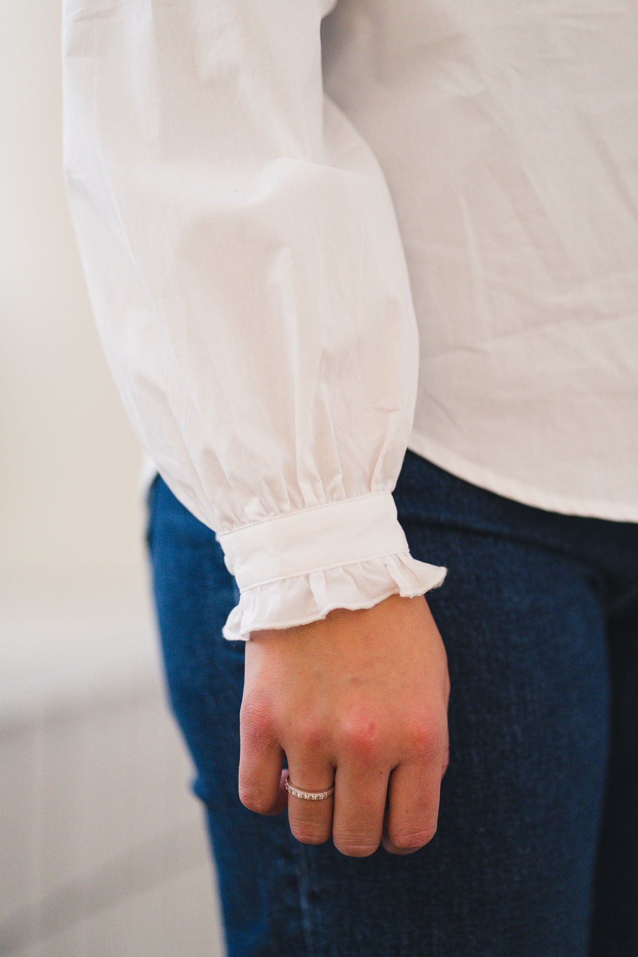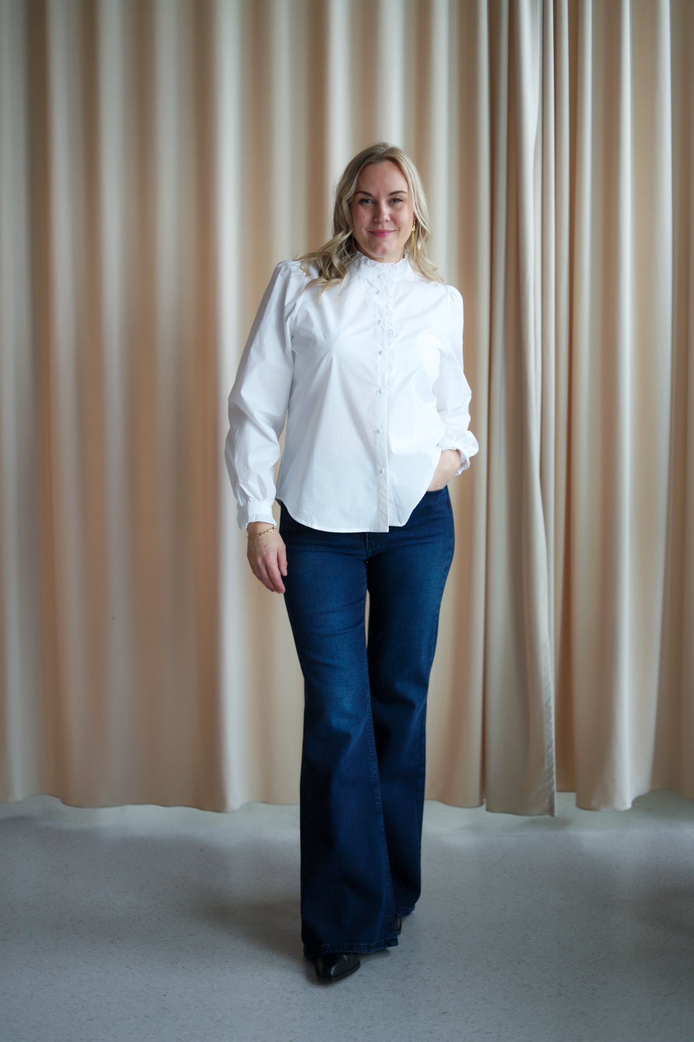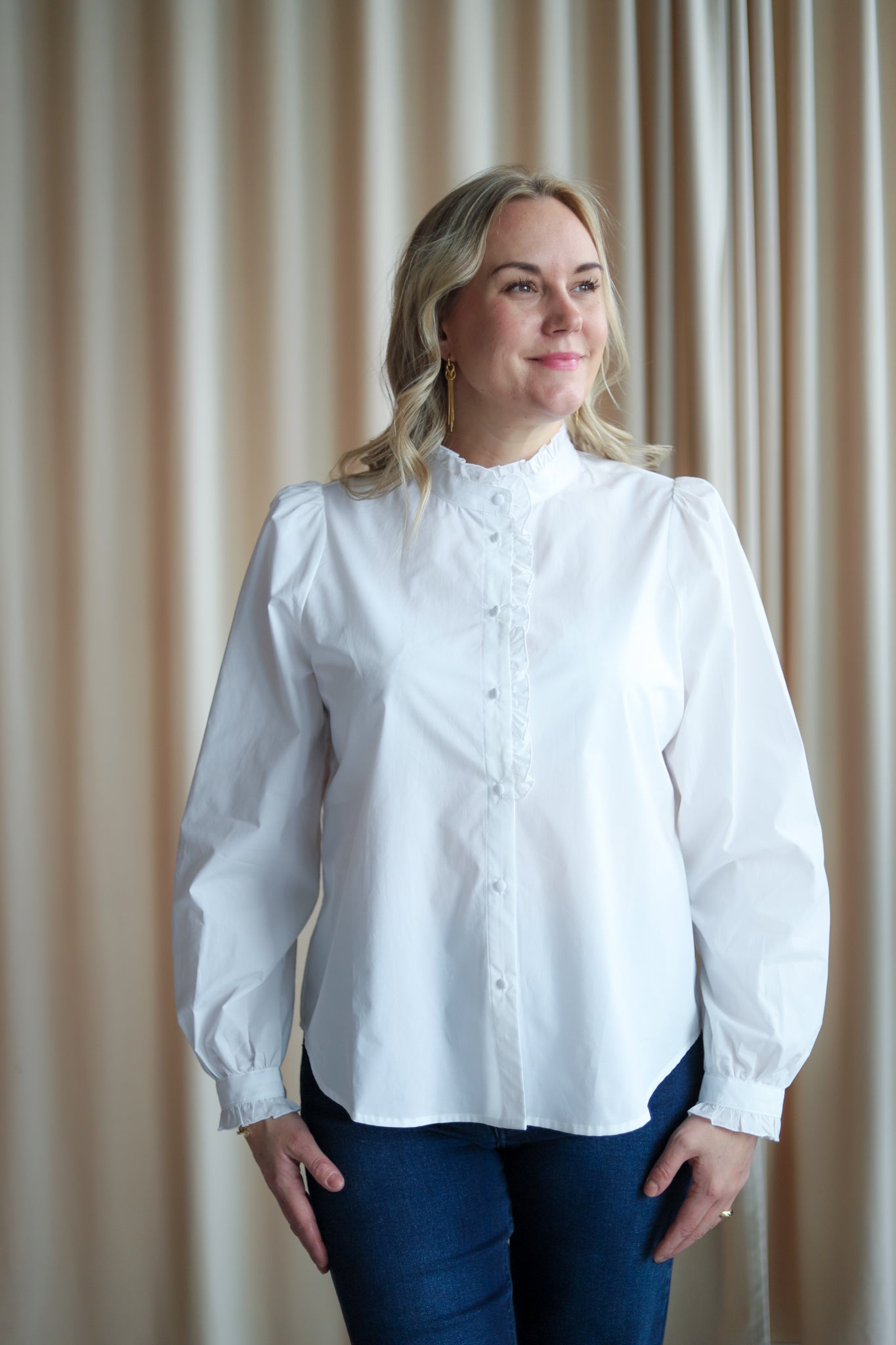 Allsidig skjorte i klassisk hvit fra Raus. Skjorten har en avslappet passform, pen lengde og buet hem. Lange ermer og knappestolpe med trukne knapper i front. Søte små frills i hals, på mansjetter og i kragen gir blusen et lekent og feminin preg. Den ultimate blusen i sesongens garderobe.