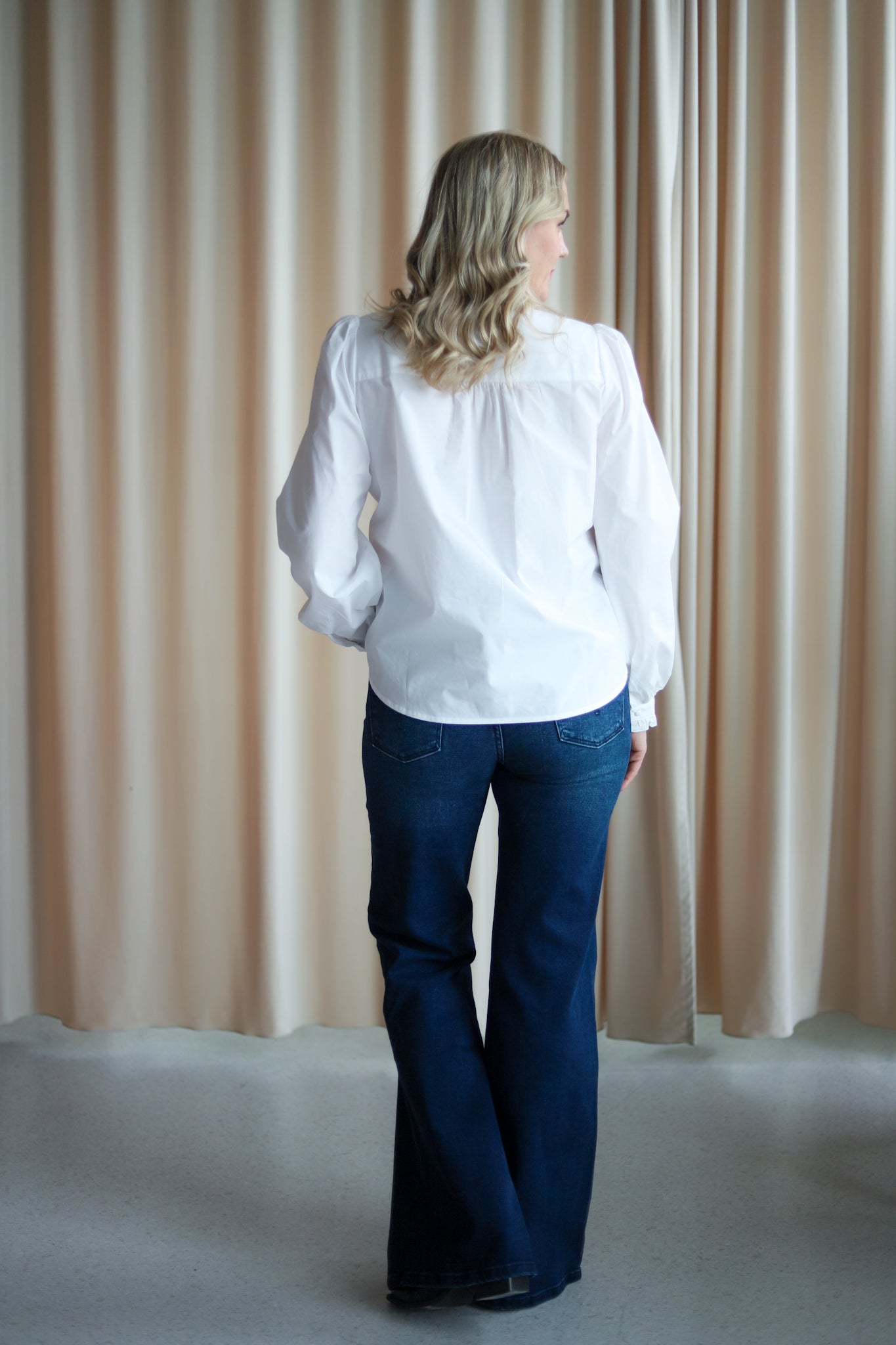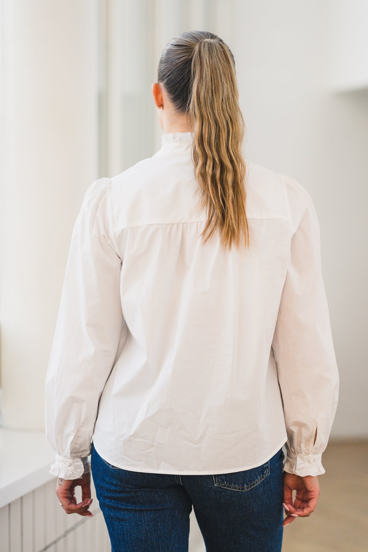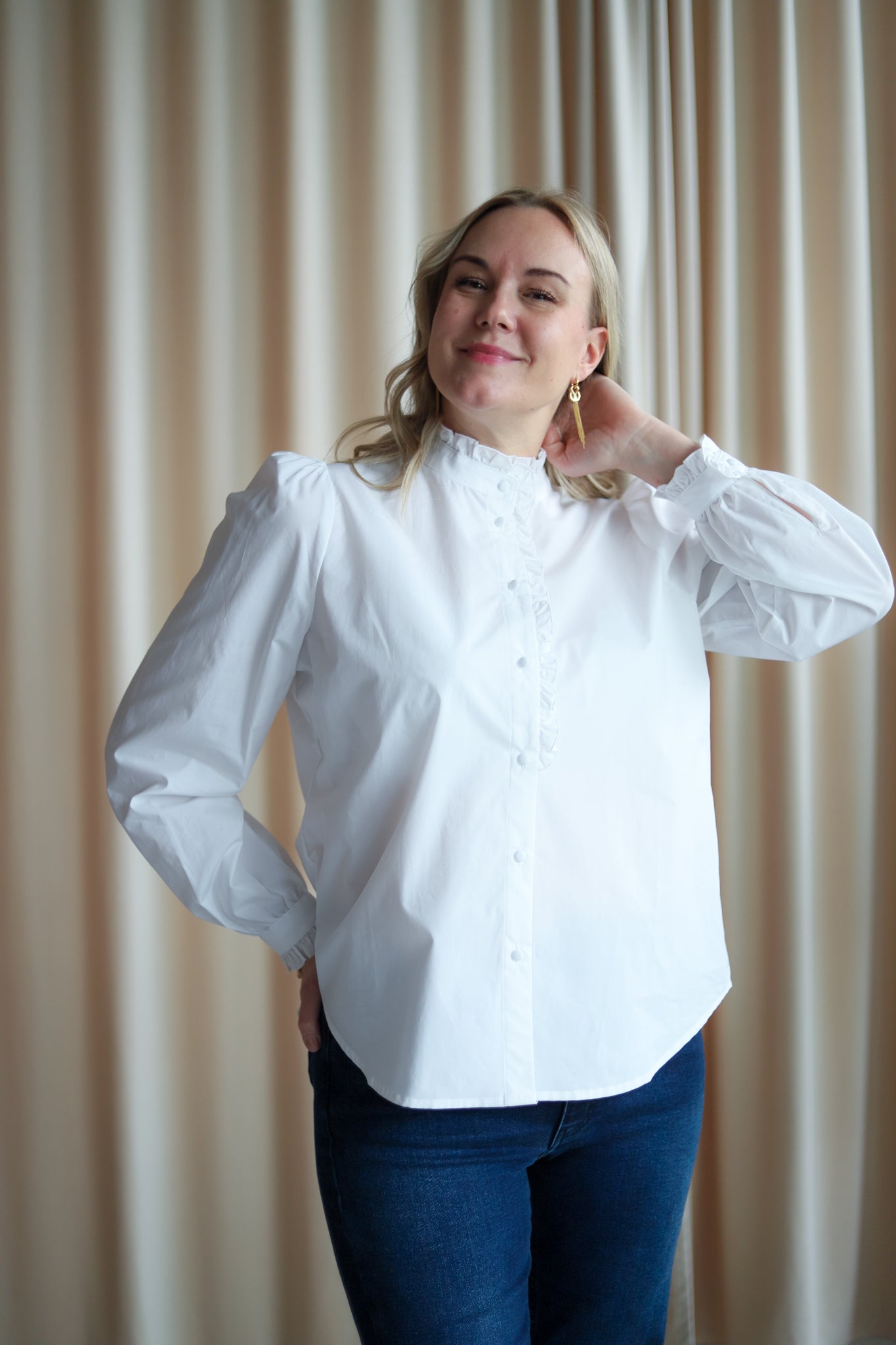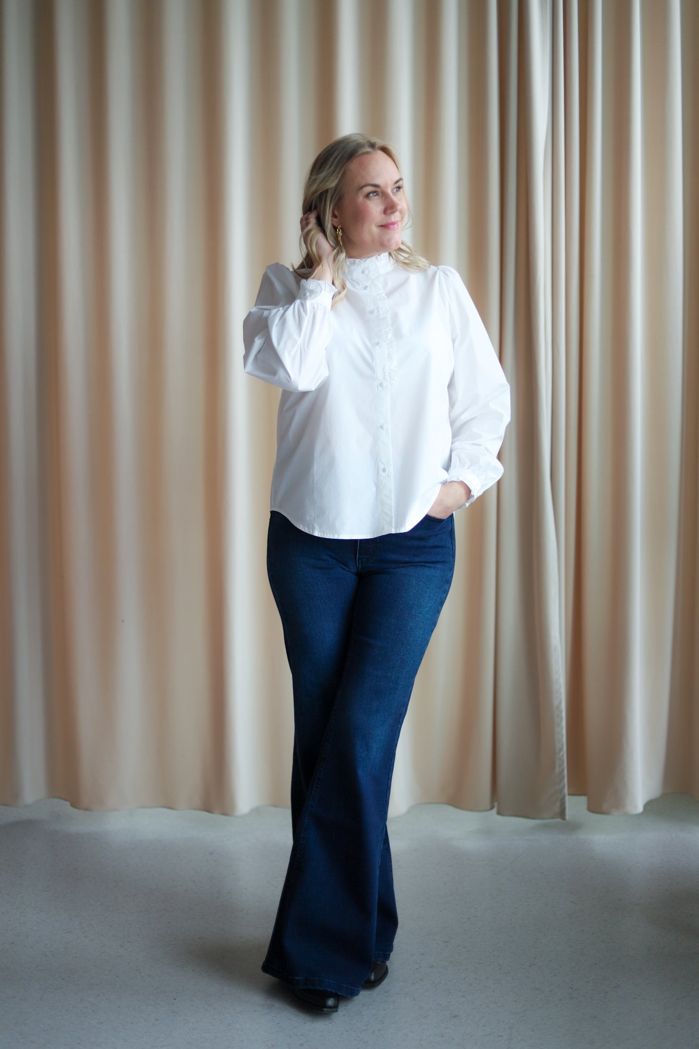 Allsidig skjorte i klassisk hvit fra Raus. Skjorten har en avslappet passform, pen lengde og buet hem. Lange ermer og knappestolpe med trukne knapper i front. Søte små frills i hals, på mansjetter og i kragen gir blusen et lekent og feminin preg. Den ultimate blusen i sesongens garderobe.