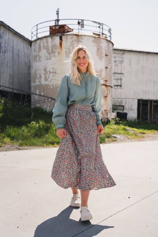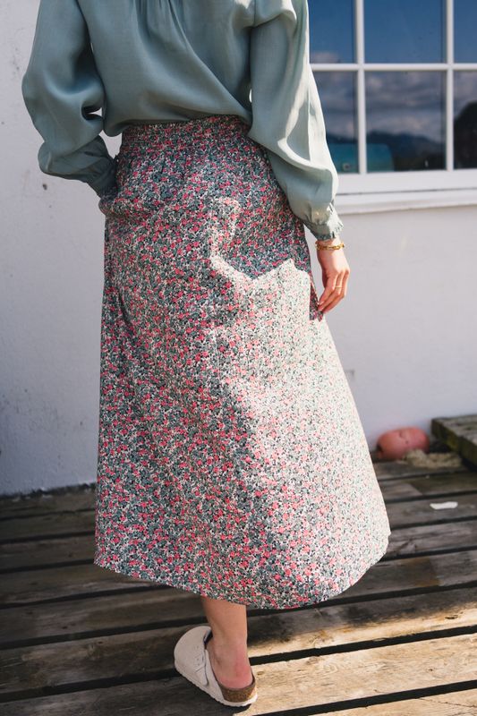 Lekkert skjørt med flerfarget blomsterprint fra Raus. Skjørtet har midi lengde og volum. Komfortabel passform i myk viskose med strikk bak i midjen som gir en behagelig og fleksibel passform. Kombiner skjørtet med en pen bluse eller til sesongens strikk. Det ultimate vår og sommerskjørtet, et must-have i garderoben!