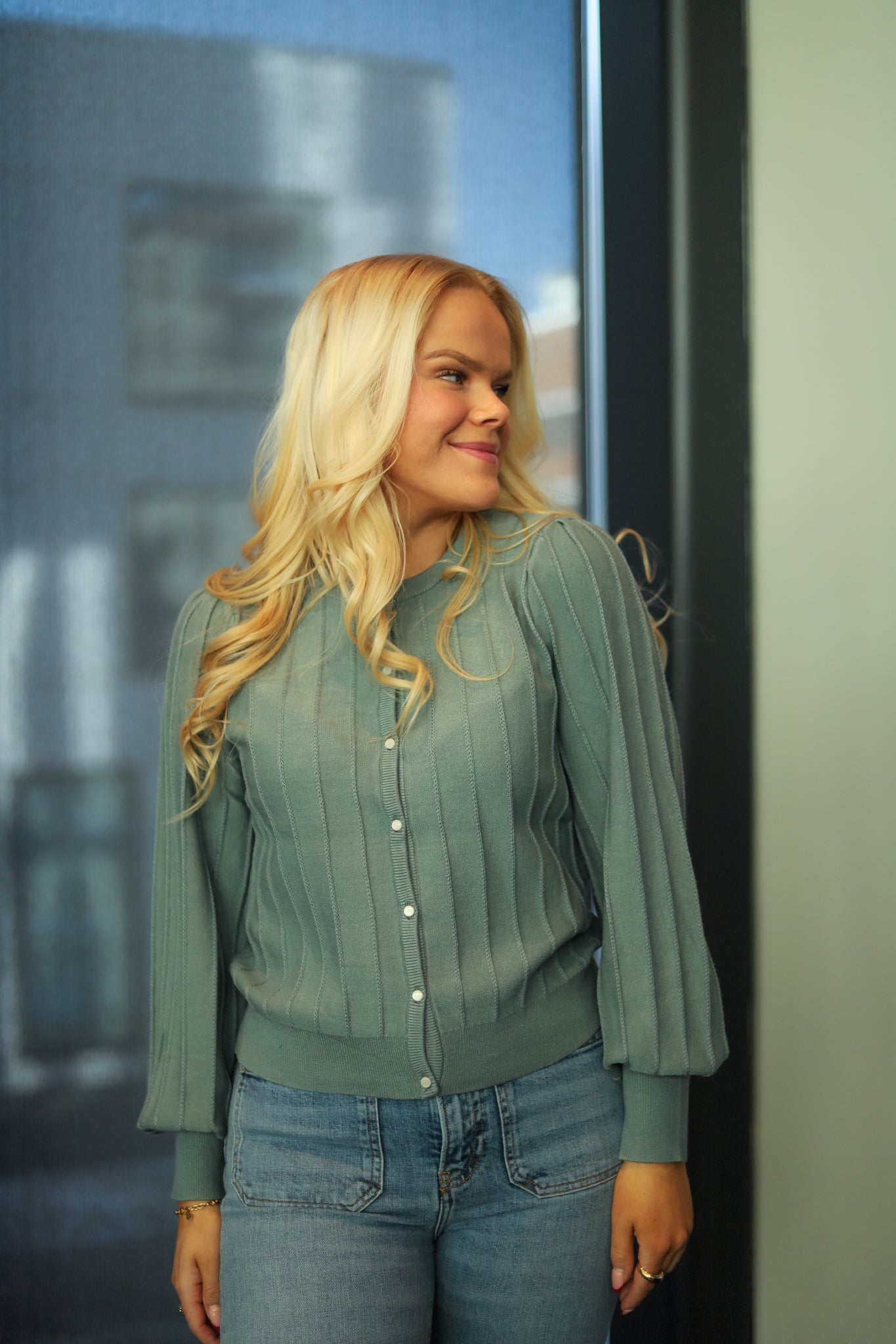 Tidløs strikk i dus grønn fra Raus. Modellen er rett med rund hals og har lange ermer med smal mansjett. Lys knappestolpe i front og pen hoftelengde. Behagelig og myk strikk i viskoseblanding. Med delikat vrangstrikket struktur. En must have i garderoben.