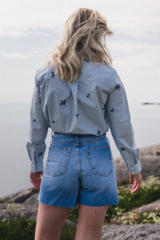 Søt bluse med hvit bunn, blå striper og broderte blomster fra Raus. Modellen er rett med klassisk skjortekrage og knappestolpe i front. Den har lange ermer med knapper i mansjett. Klassisk og feminin skjorte i en lett bomullskvalitet som føles behagelig mot huden - perfekt både til hverdags og mer pyntede anledninger. En garderobefavoritt!