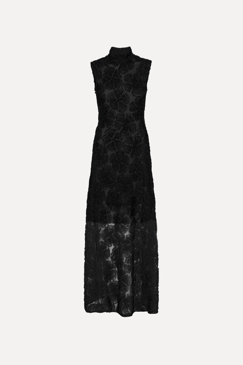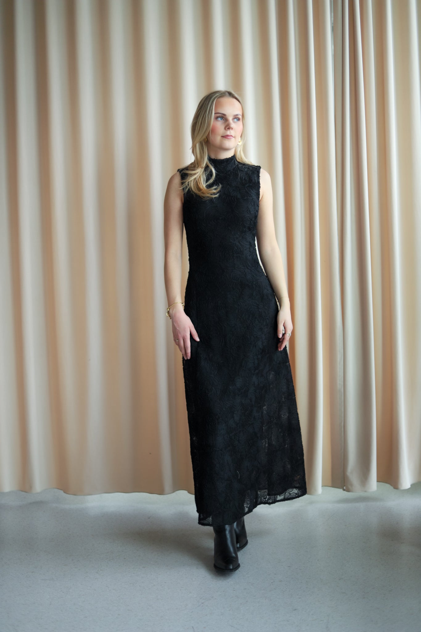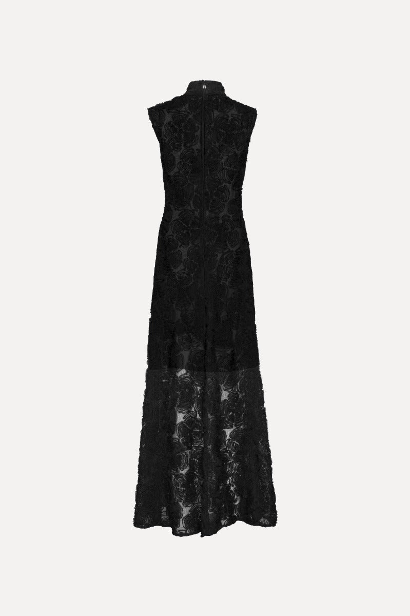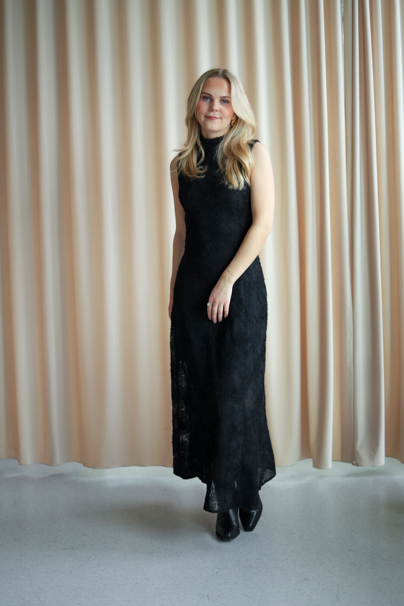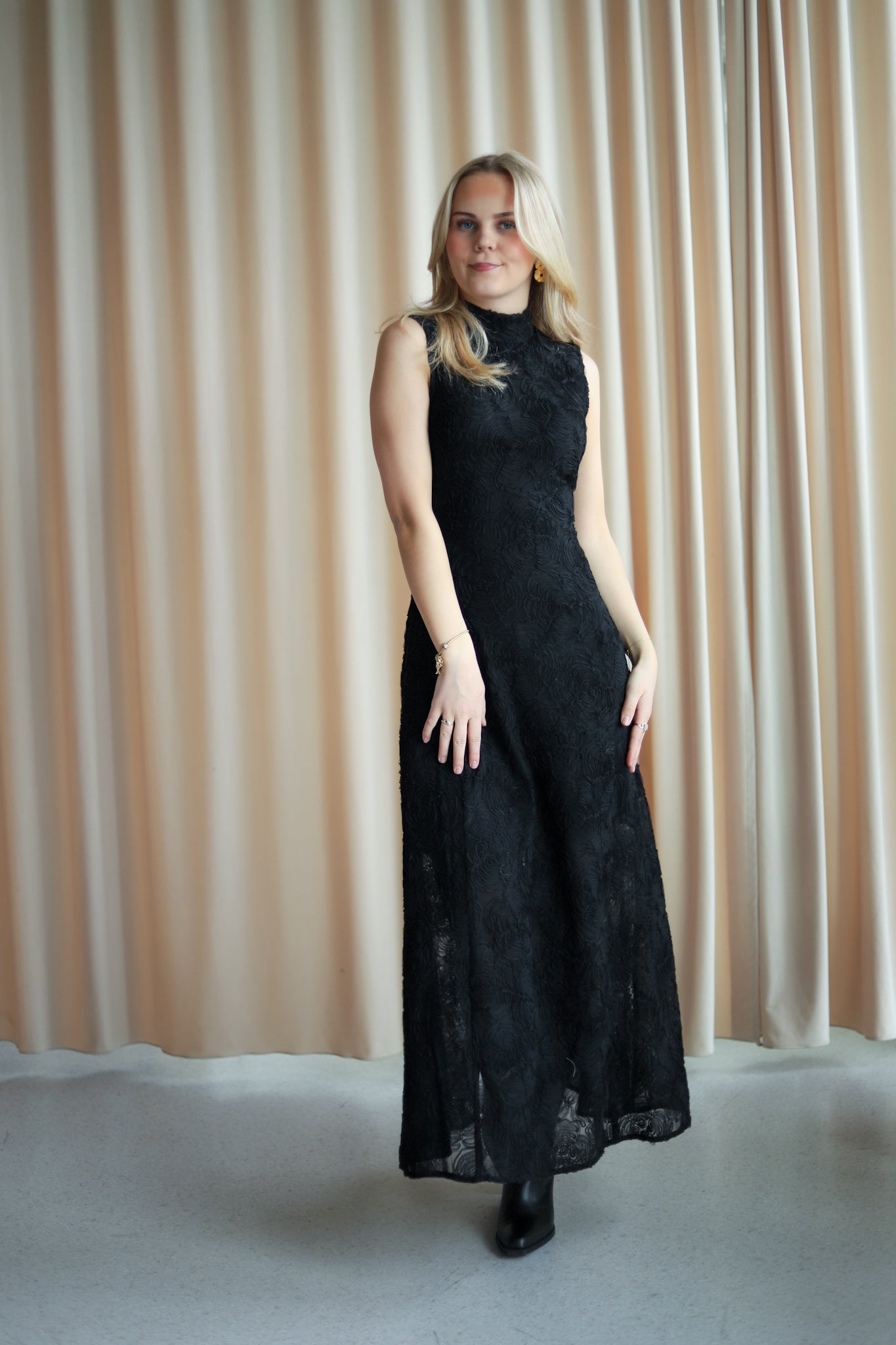 Nydelig maxikjole i klassisk sort og 3D blomsterprint ton-i-ton fra Rotate. Ermløs kjole med elegant mockhals. Modellen sitter tett i overkropp, har markert midje og et voluminøst skjørt med full lengde. Behagelig stretchy meshkvalitet som er tynt fóret. Lukking med skjult glidelås i ryggen. En drømmekjole til sesongens festligheter.
