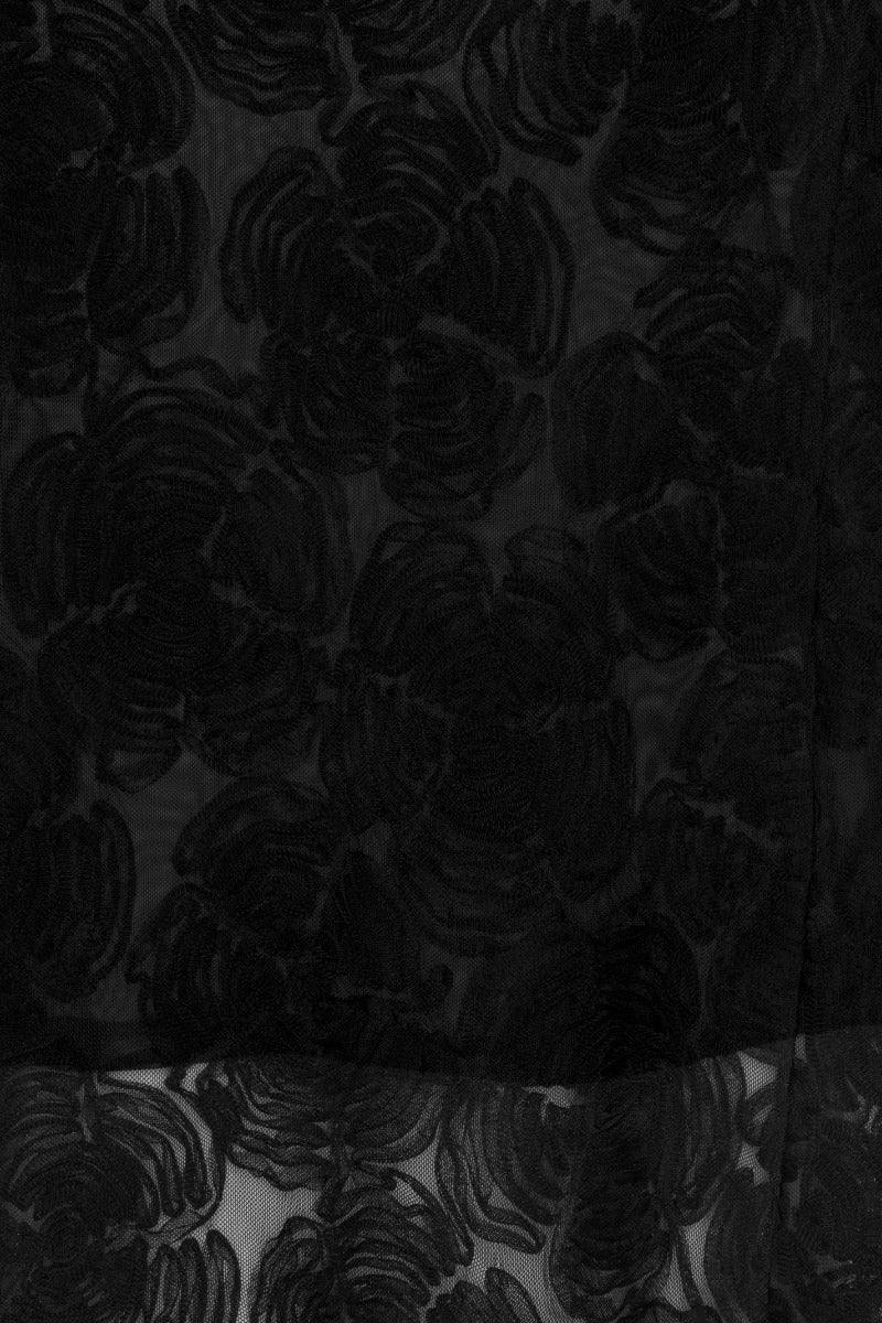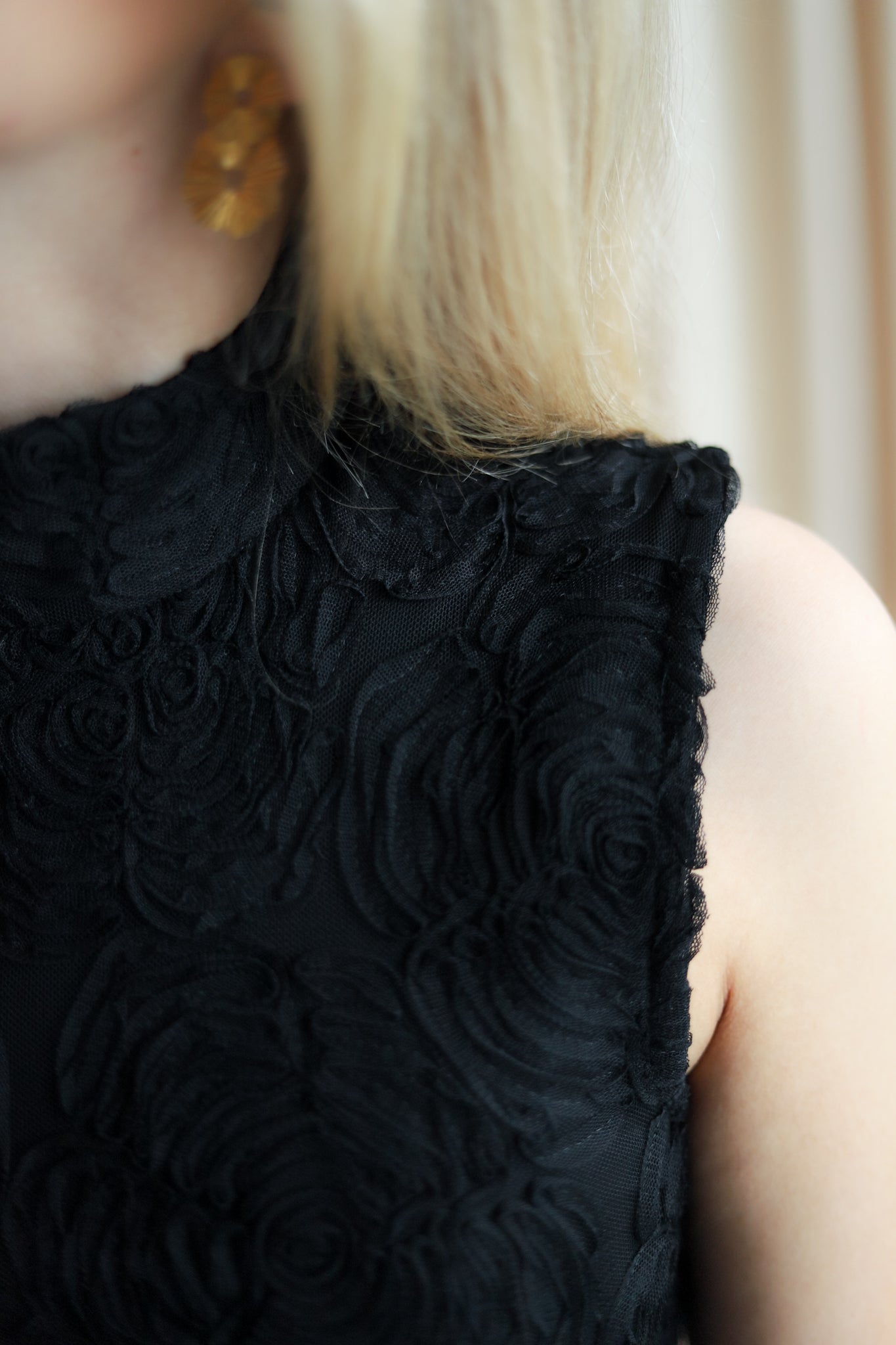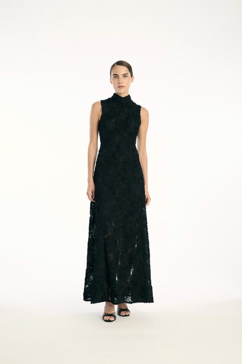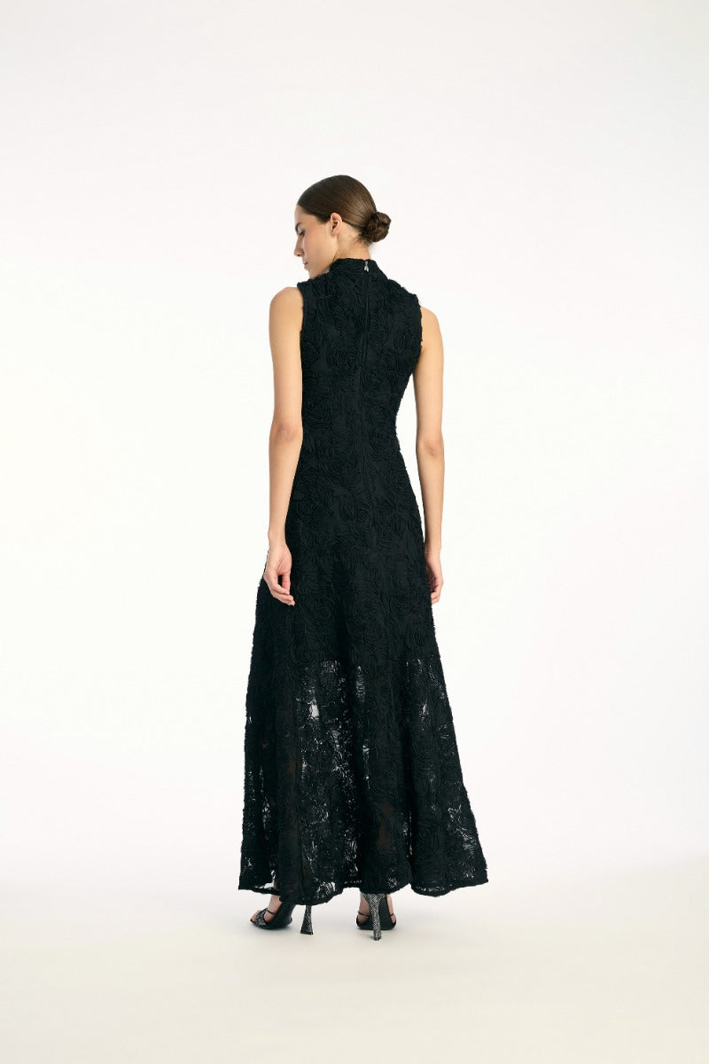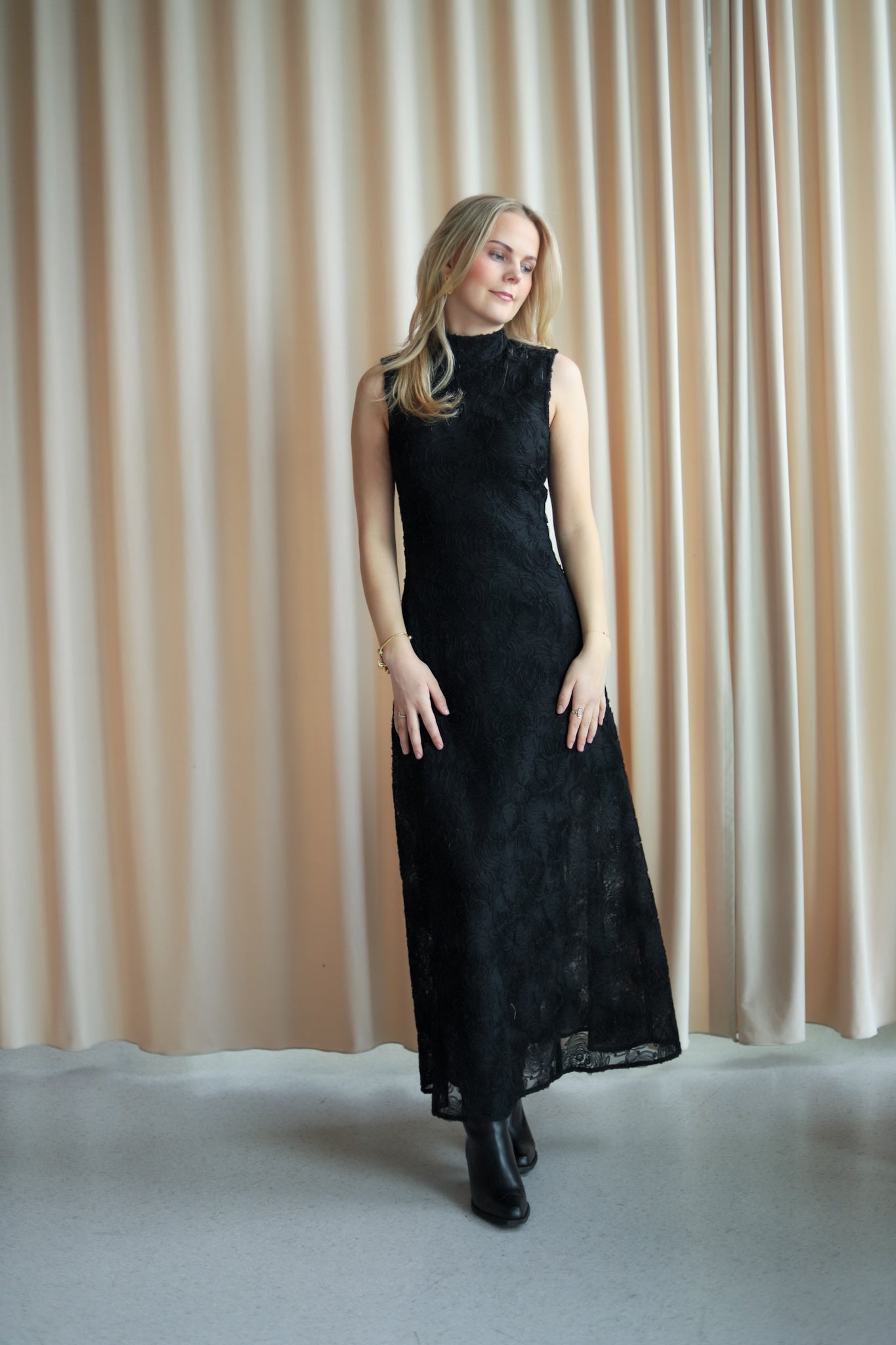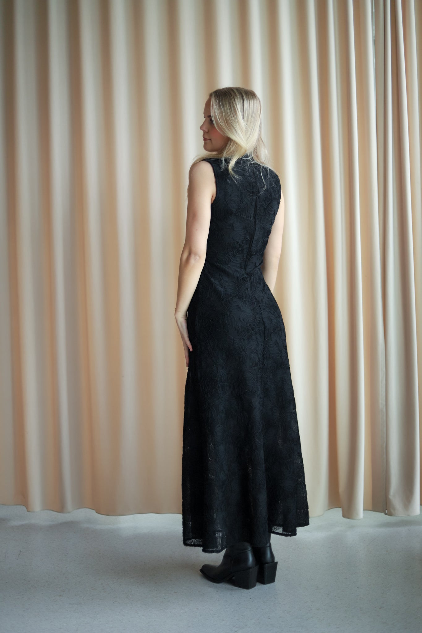 Nydelig maxikjole i klassisk sort og 3D blomsterprint ton-i-ton fra Rotate. Ermløs kjole med elegant mockhals. Modellen sitter tett i overkropp, har markert midje og et voluminøst skjørt med full lengde. Behagelig stretchy meshkvalitet som er tynt fóret. Lukking med skjult glidelås i ryggen. En drømmekjole til sesongens festligheter.