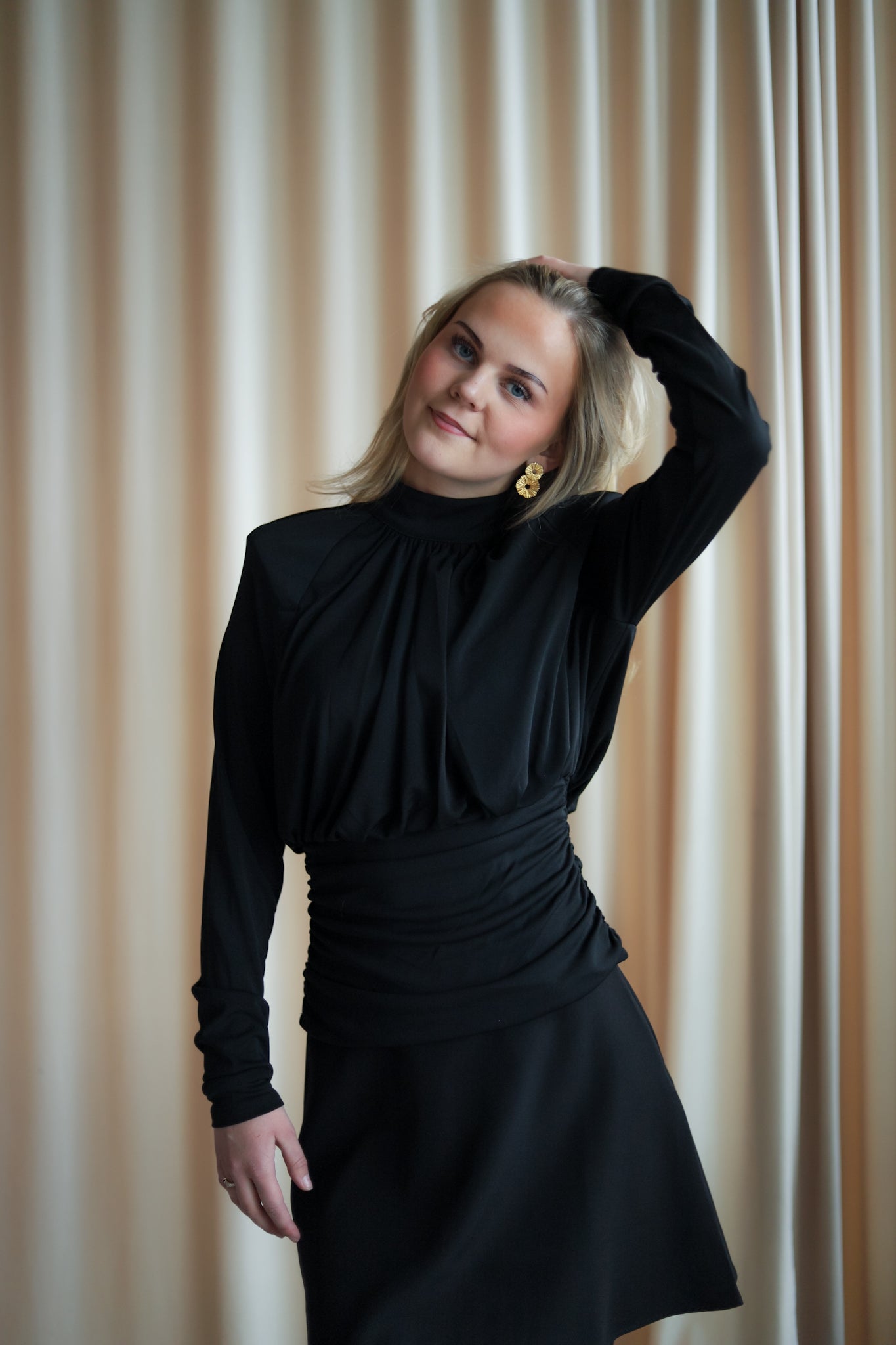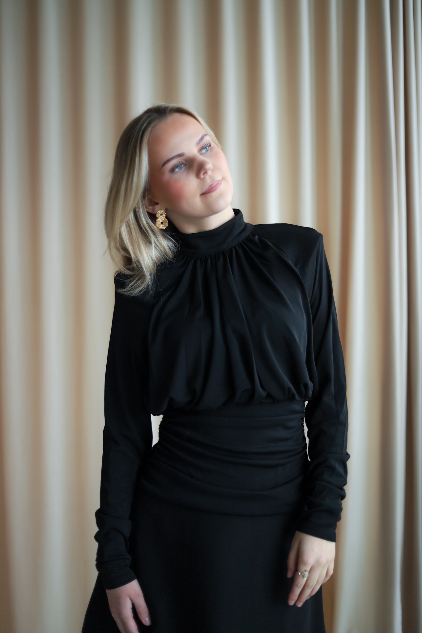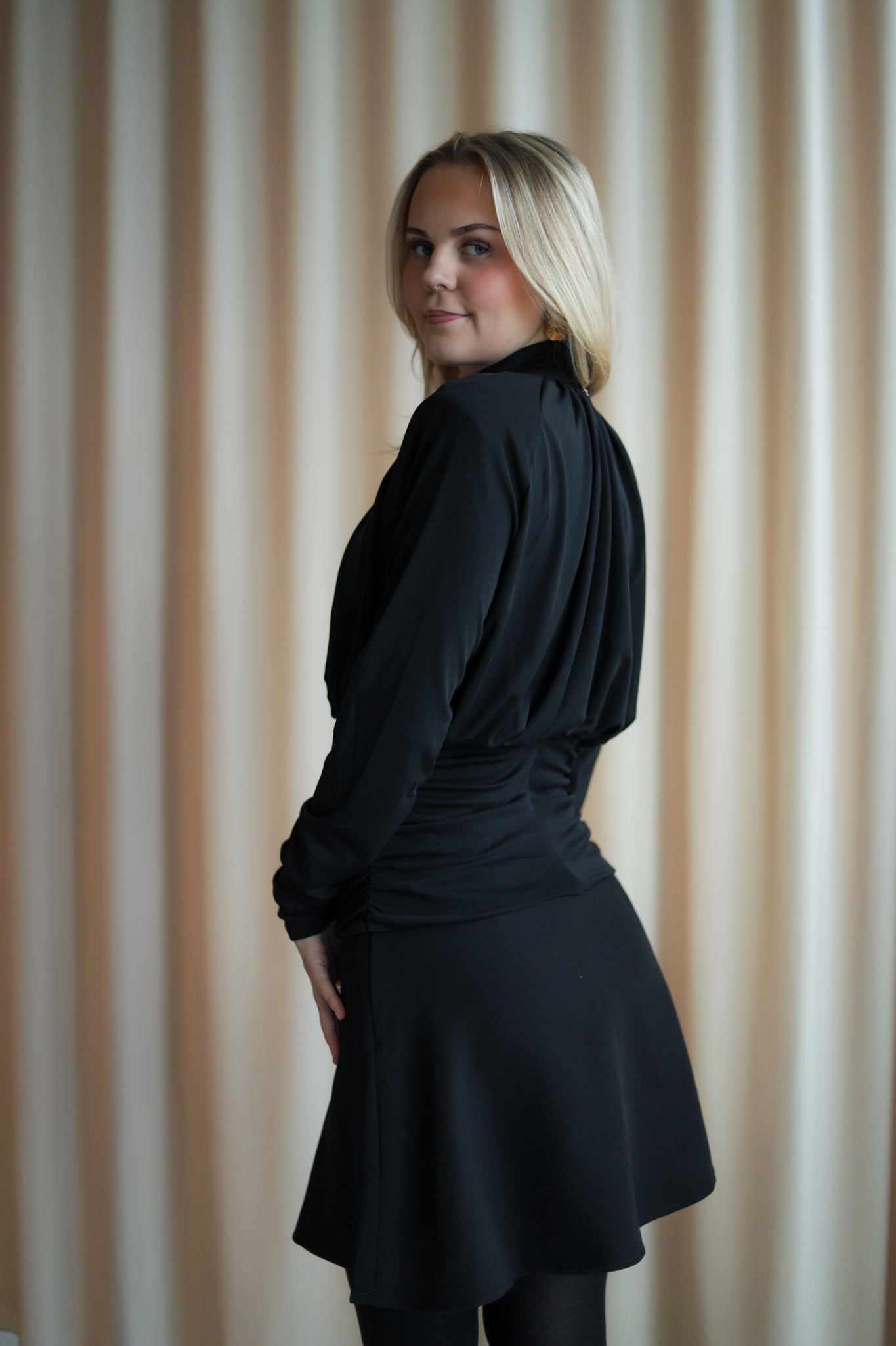 Stilig topp i klassisk sort fra Rotate. Modellen er tettsittene i midjen med volum i overdelen og høy hals. Toppen har lekre draperinger med lange raglanermer som smalner inn mot mansjett. Lukkes med glidelås i ryggen. Tøff til både, jeans, skjørt og dressbukser.